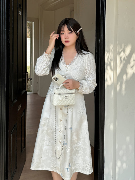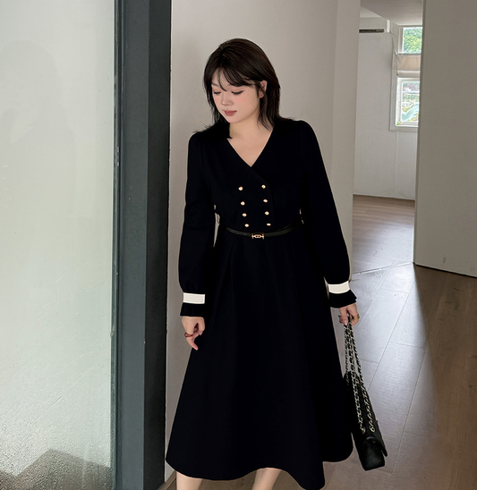 大きいサイズ レディース レトロバックル付き長袖レースワンピース LL 3L 4L 5L