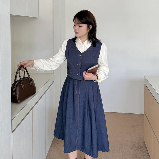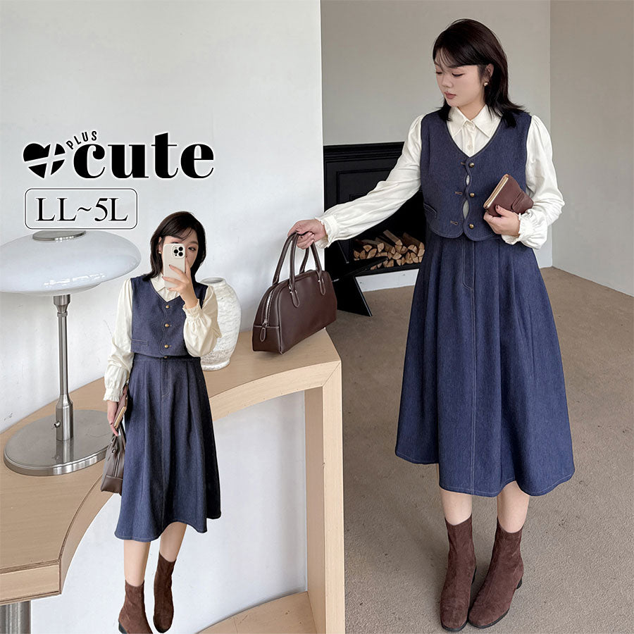 大きいサイズ レディース フェイクスリーピースデニムワンピース(シャツ+ベスト+スカート) LL 3L 4L 5L