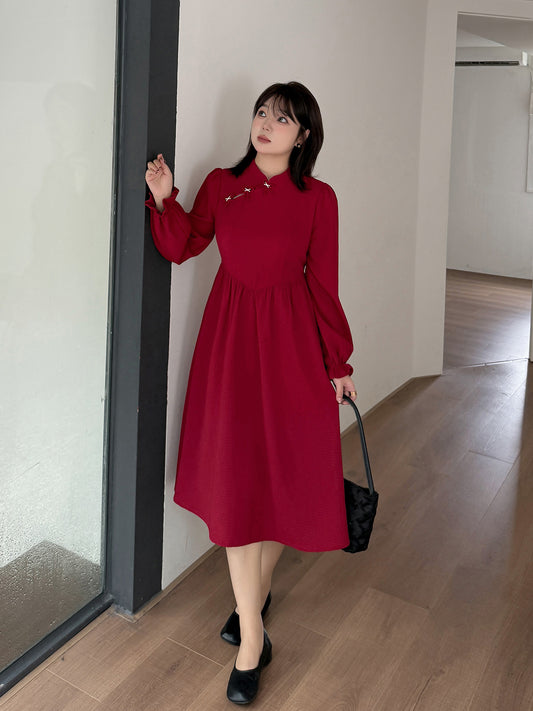 大きいサイズ レディース リボンスタンドカラーワッフルチャイナ風ワンピース LL 3L 4L 5L