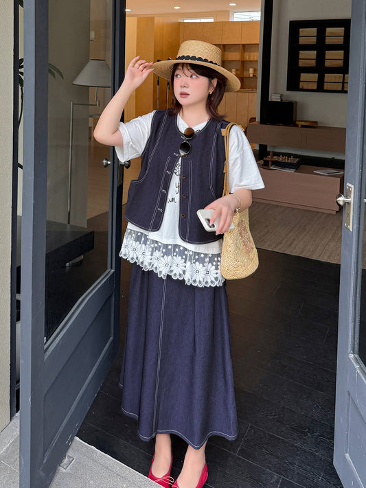 大きいサイズ レディース セットアップ(フェイクデニムステッチベスト+スカート) LL 3L 4L 5L