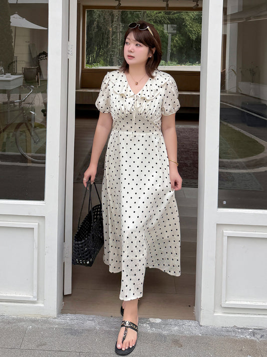 大きいサイズ レディース 水玉フリルカラーリボンシフォンワンピース LL 3L 4L 5L