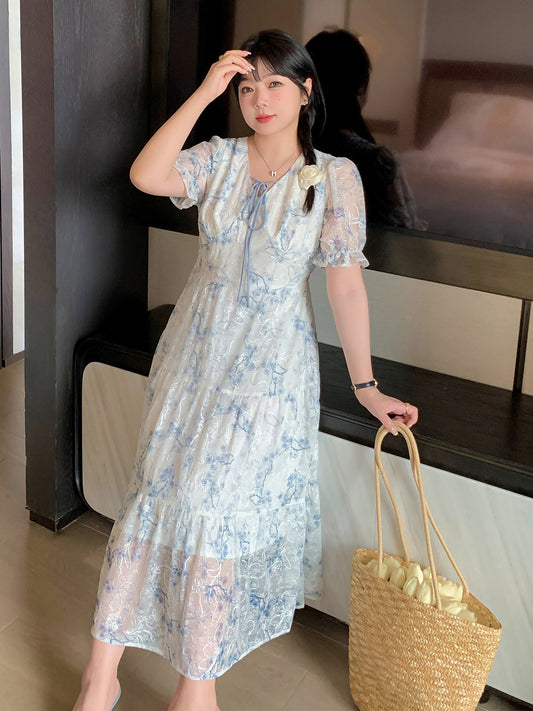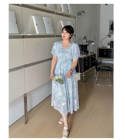 大きいサイズ レディース Vネックシフォンフラワー刺繍ワンピース LL 3L 4L 5L