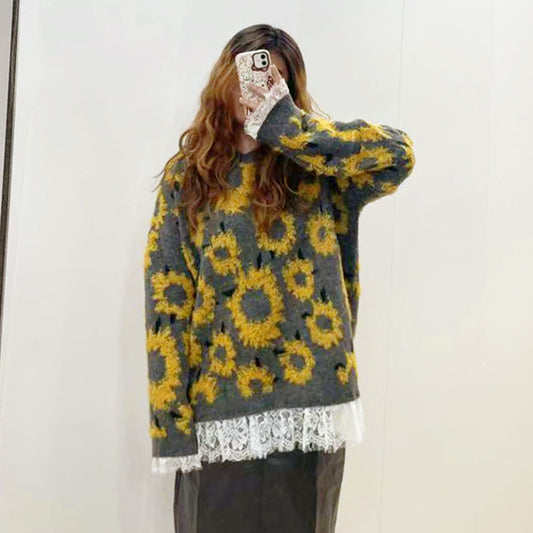 大きいサイズ レディース ひまわり柄カジュアルルーズセーター(レース付き) LL 3L 4L