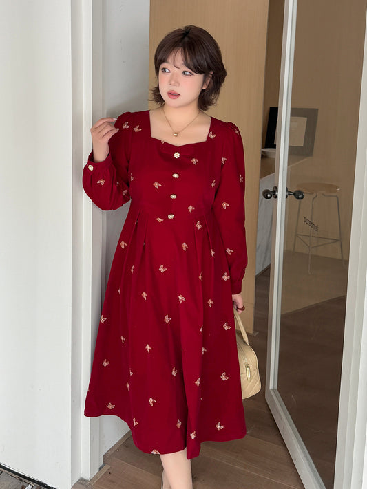 大きいサイズ レディース フレンチスクエアネックフラワーボタンバタフライ刺繍ワンピース LL 3L 4L 5L