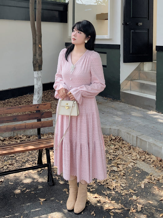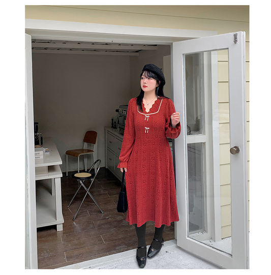 大きいサイズ レディース ビーズジュエリー付きVネックレース裏起毛フレンチワンピース LL 3L 4L 5L