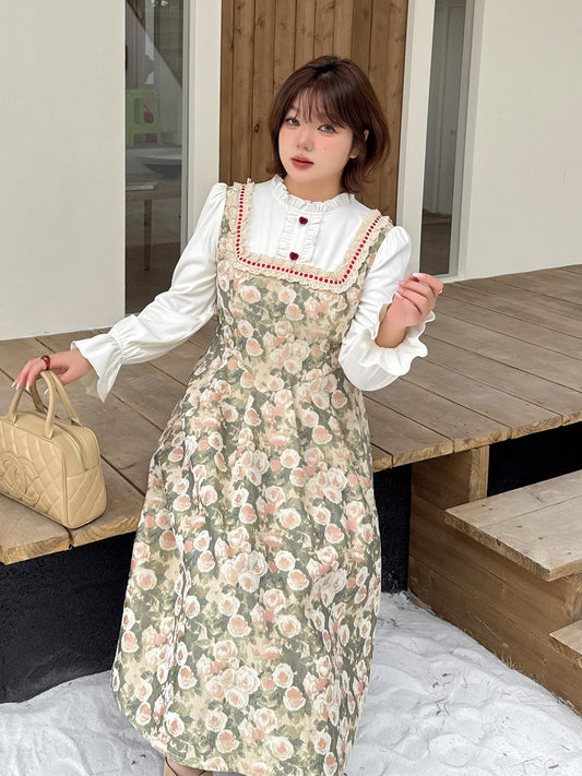 大きいサイズ レディース レースインナーシャツ+ガーリーフリルサスペンダーワンピース2点セット LL 3L 4L 5L