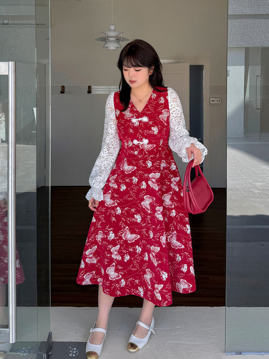 大きいサイズ レディース フェイクツーピースバタフライ刺繍レースワンピース LL 3L 4L 5L