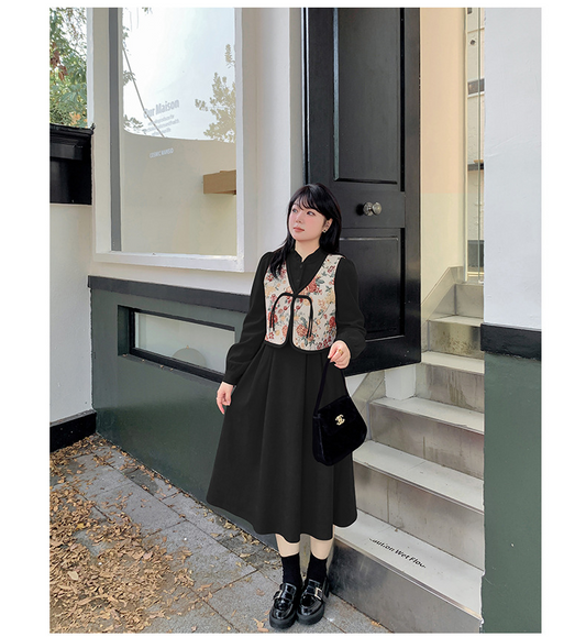 大きいサイズ レディース ツーピース 花柄ベスト+フリルカラーロングワンピース LL 3L 4L 5L