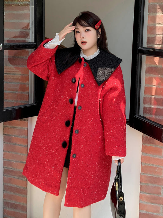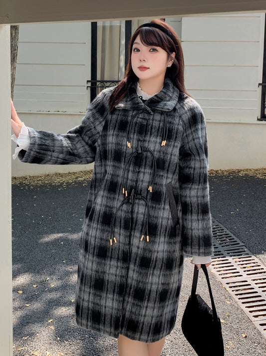 大きいサイズ レディース レトロひも付きトグルボタンチェック柄ウールコート LL 3L 4L 5L