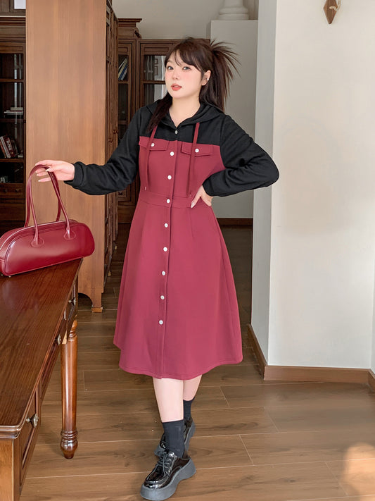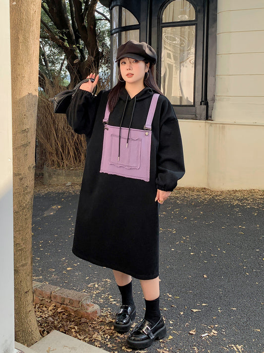 大きいサイズ レディース フード付きフェイクツーピースパッチワークワンピース LL 3L 4L 5L