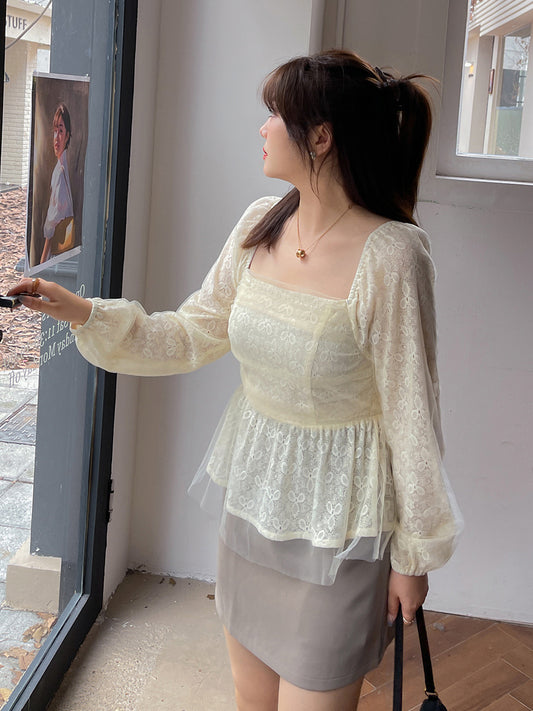 大きいサイズ レディース スクエアネックのペプラムレースブラウス LL 3L 4L 5L