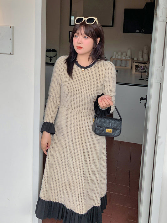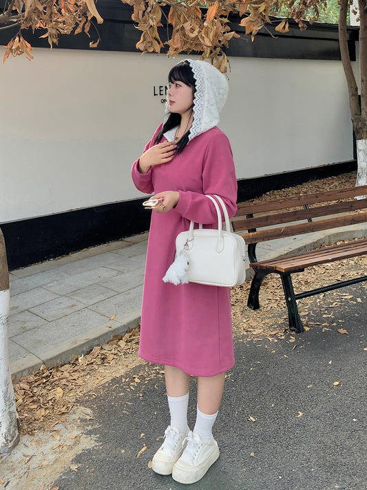 大きいサイズ レディース レースフードパッチワークカジュアルベルベットワンピース LL 3L 4L 5L