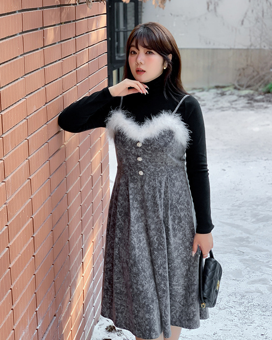 大きいサイズ レディース ファーベルベットスリップワンピースヴィンテージプリント LL 3L 4L 5L