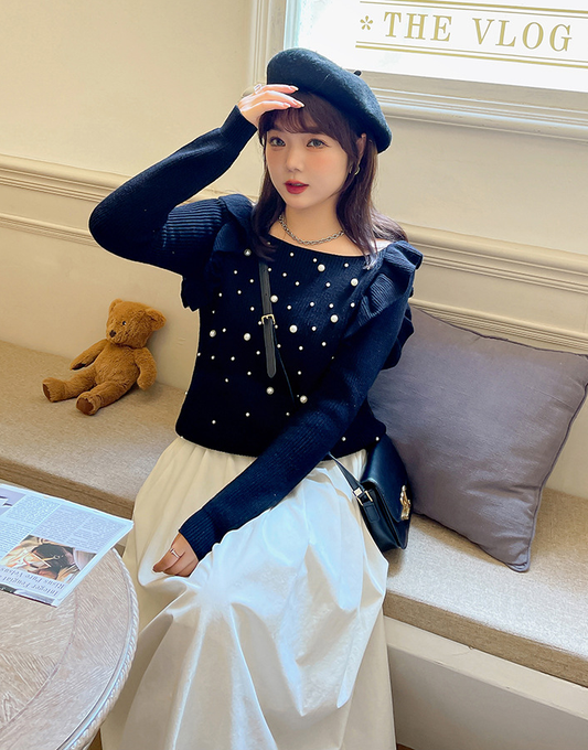 大きいサイズ レディース ビーズフリルオフショルダーニットセーター LL 3L 4L 5L