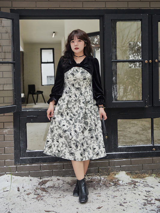 大きいサイズ レディース リボンスパンコールベルベットパッチワークワンピース LL 3L 4L 5L
