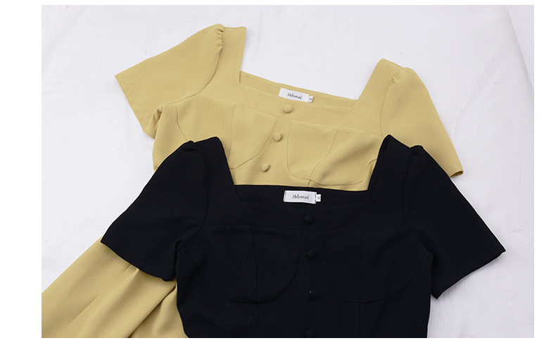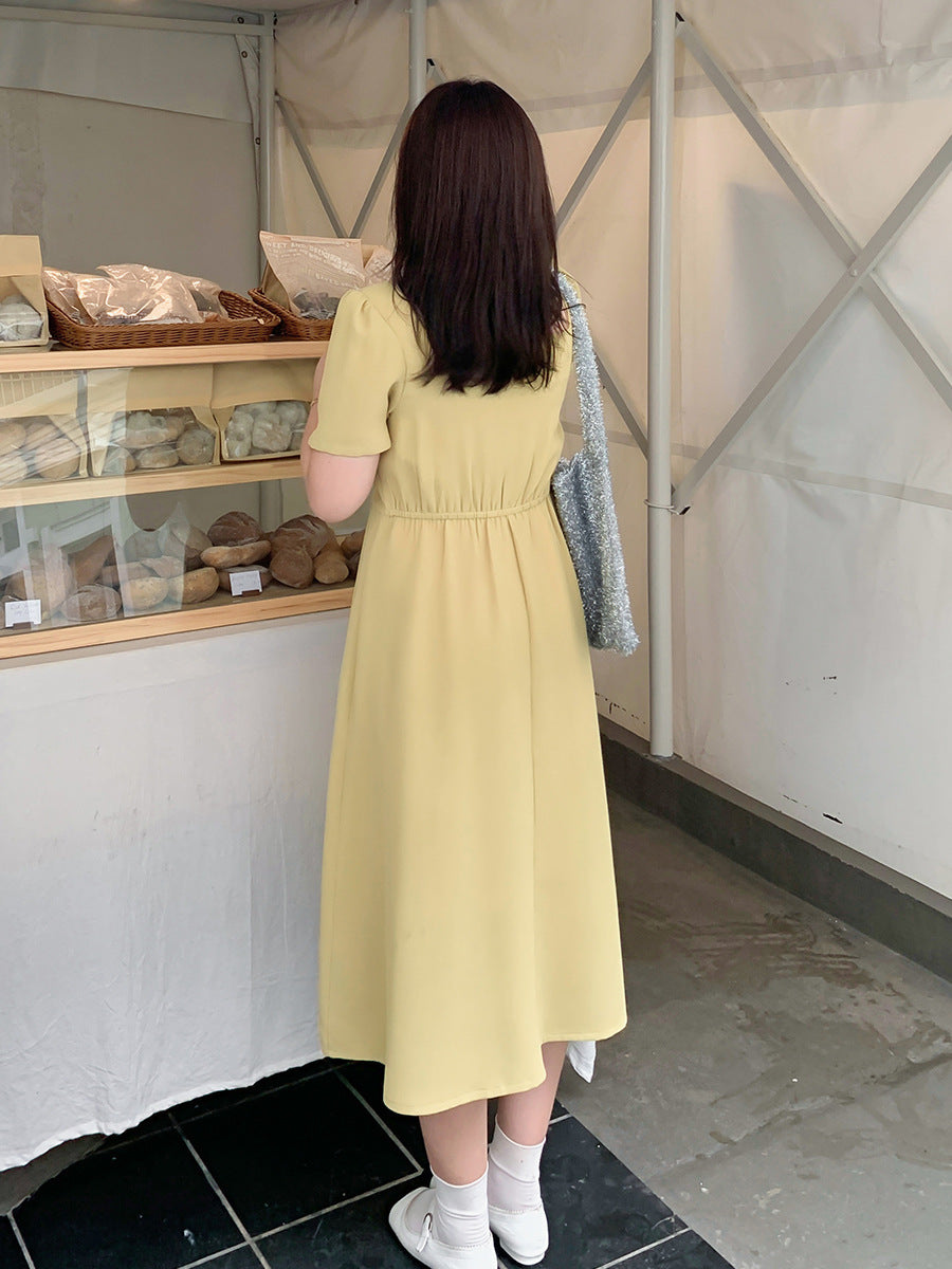 フレンチレトロなウエスト切替えのワンピースは、小さなワッフル生地で作られており、柔らかく肌に優しいです。スクエアネックになっており、胸元は立体的なカッティングで胸をサポートし、ゆったりとした袖口に控えめなパフスリーブで腕のラインを華奢にみせてくれます。後ろウエストにはゴムが入っており、絞りのあるAラインスカートがエレガント!スニーカーを合わせたらカジュアルにも着こなせます☆