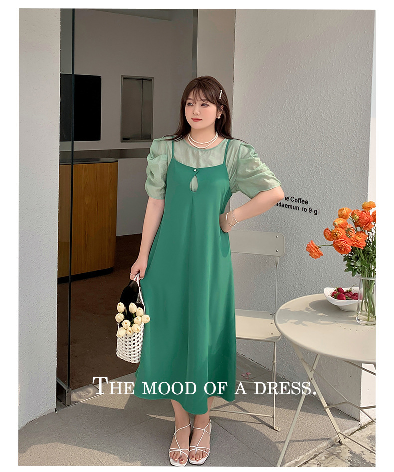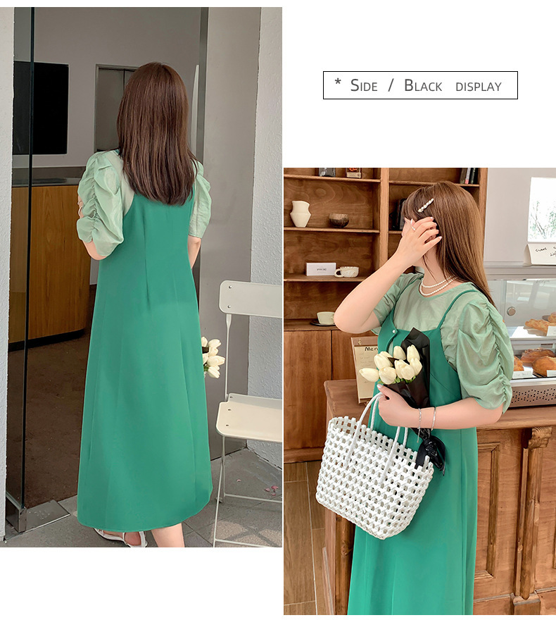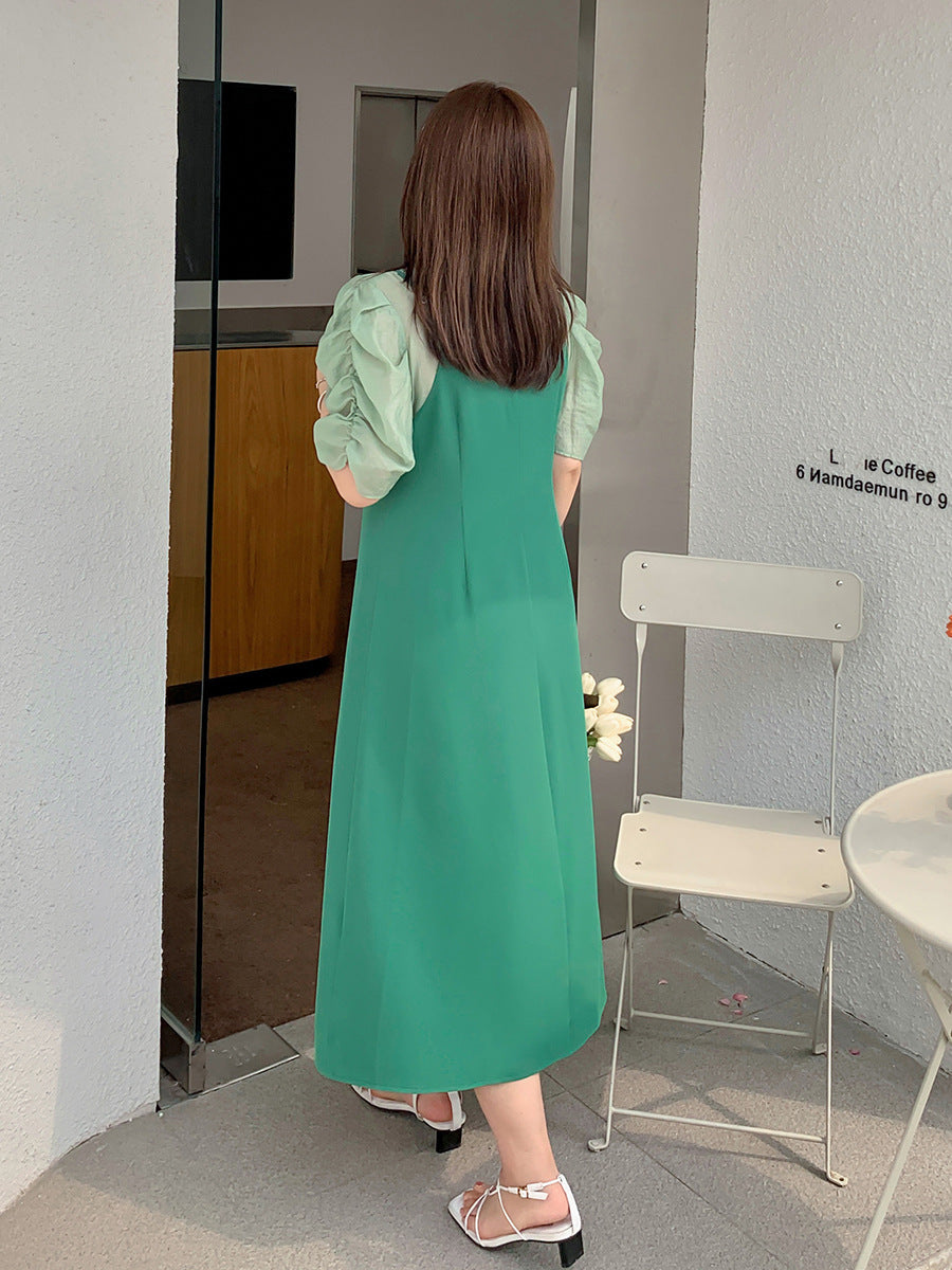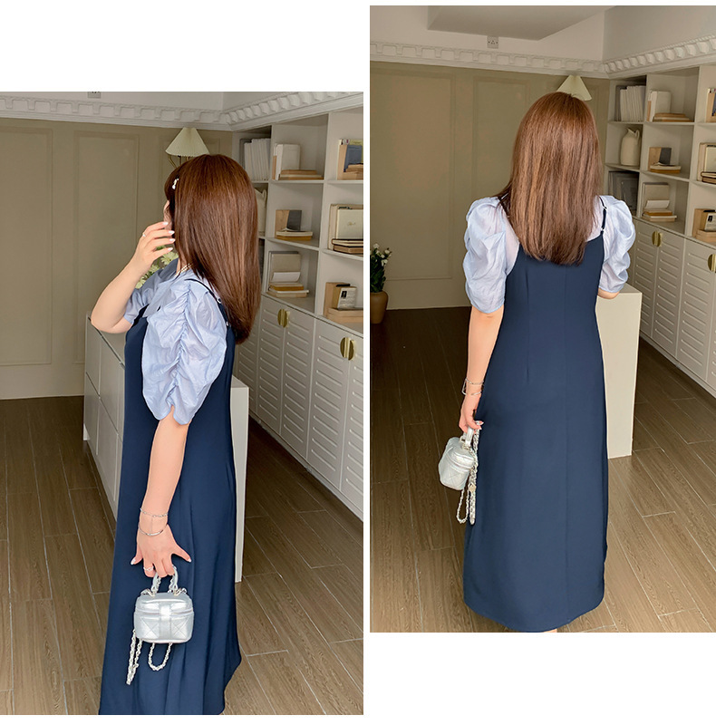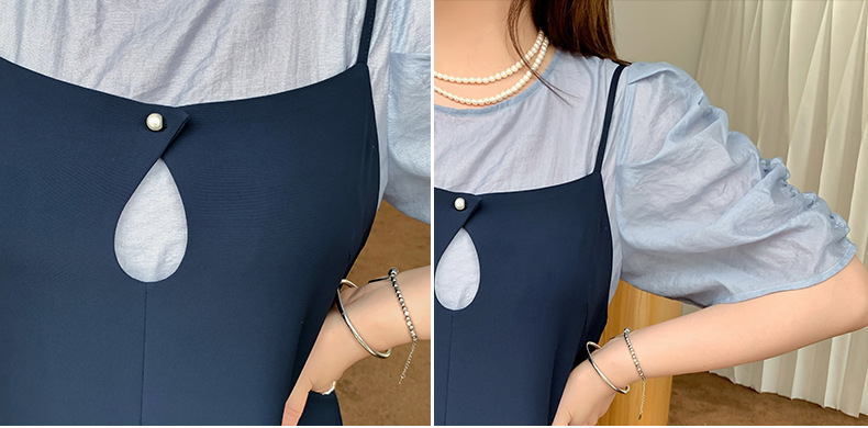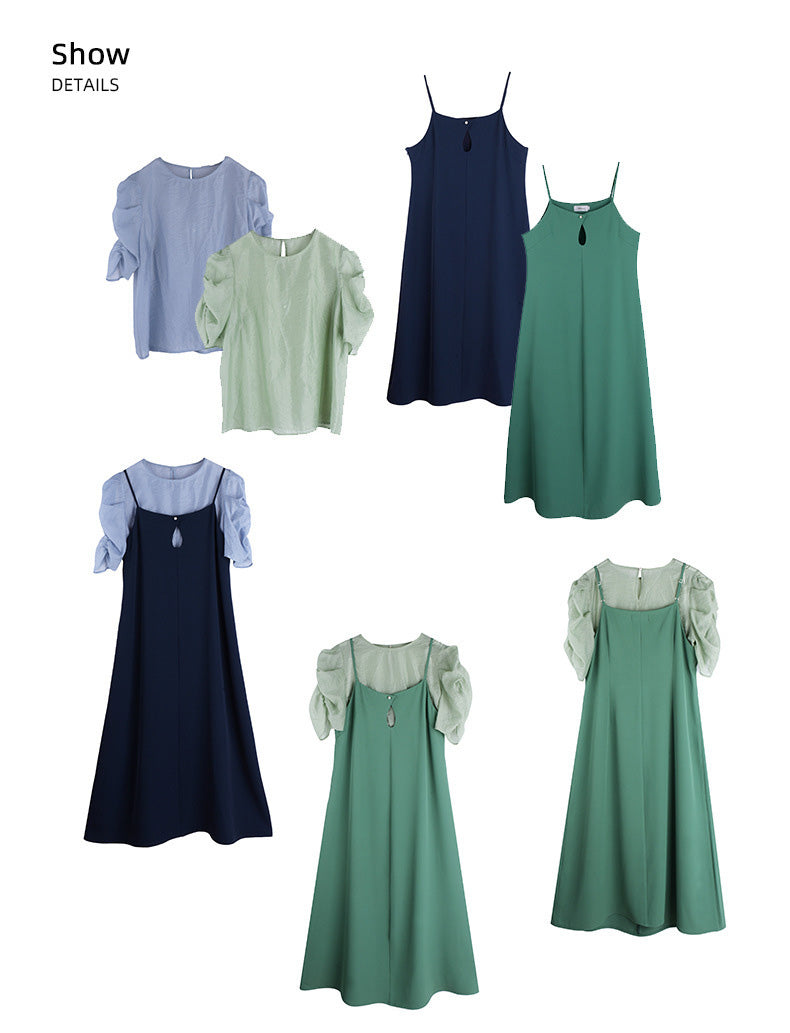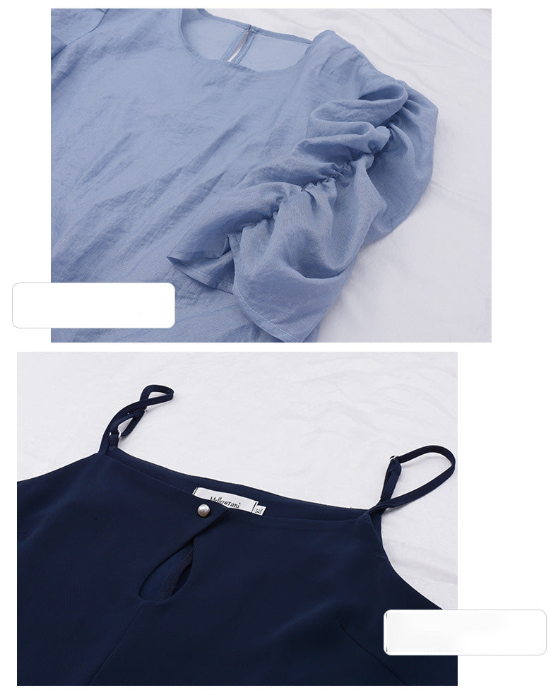 プリーツパフスリーブブラウス+サスペンダーワンピースのセットです。ワンピースは滑らかで、肌触りがよく快適です。シアーのシンプルなラウンドネックブラウスは、立体感のあるプリーツパフスリーブがポイント。おしゃれに見せつつ、二の腕をカバーしてくれます。ワンピースは長さを調整できる調節リングが付いていて、サイドの縫目には見えないジッパーが付いています。セットではもちろんのこと、合わせ方によってさまざまなスタイルをお楽しみいただける一着です!