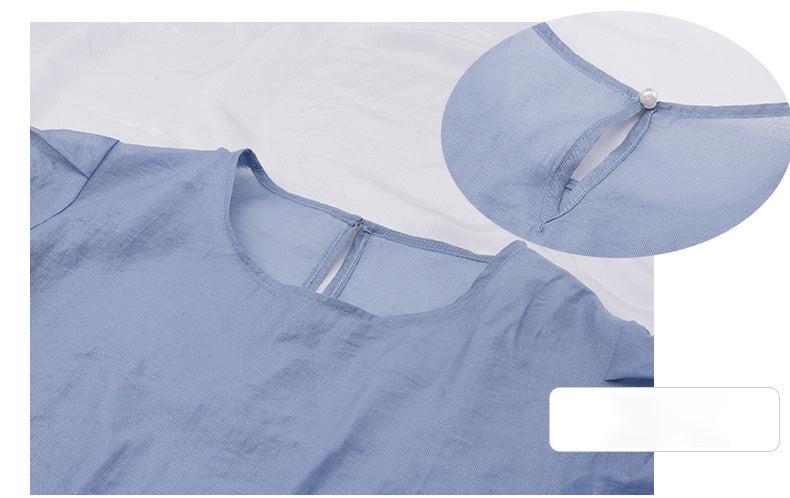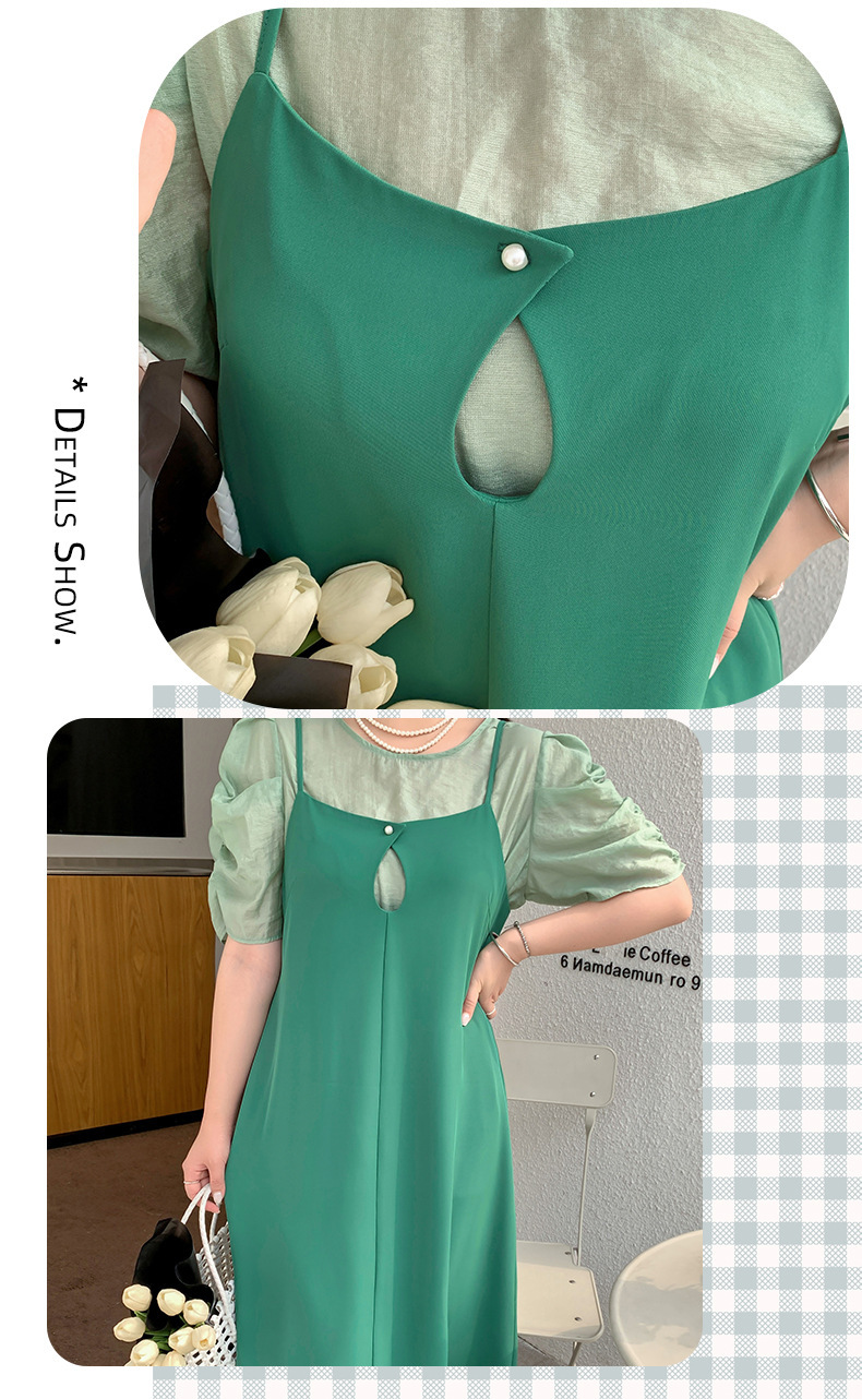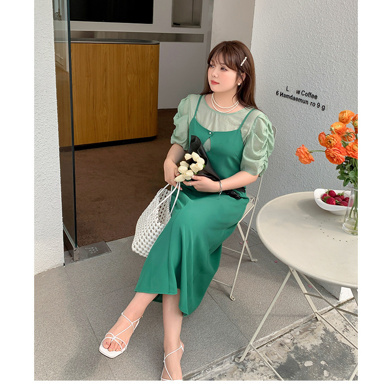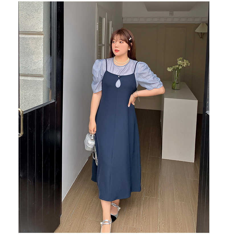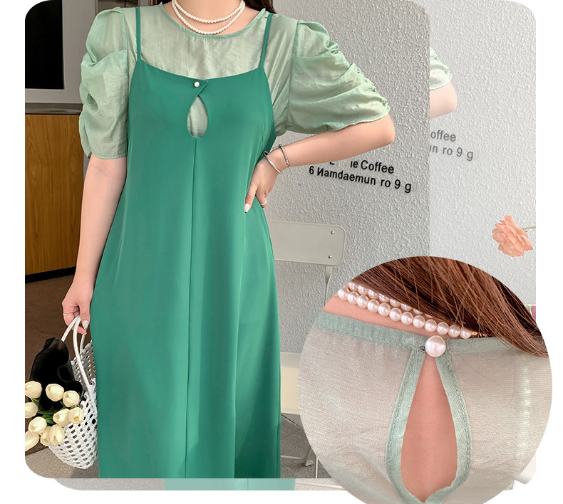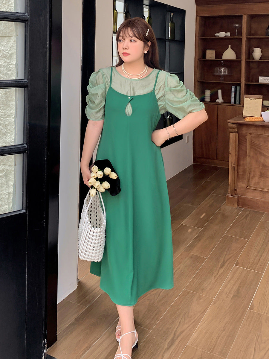 プリーツパフスリーブブラウス+サスペンダーワンピースのセットです。ワンピースは滑らかで、肌触りがよく快適です。シアーのシンプルなラウンドネックブラウスは、立体感のあるプリーツパフスリーブがポイント。おしゃれに見せつつ、二の腕をカバーしてくれます。ワンピースは長さを調整できる調節リングが付いていて、サイドの縫目には見えないジッパーが付いています。セットではもちろんのこと、合わせ方によってさまざまなスタイルをお楽しみいただける一着です!