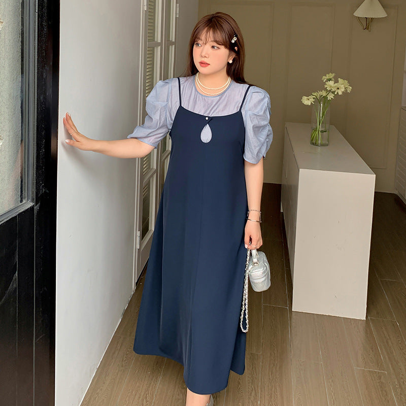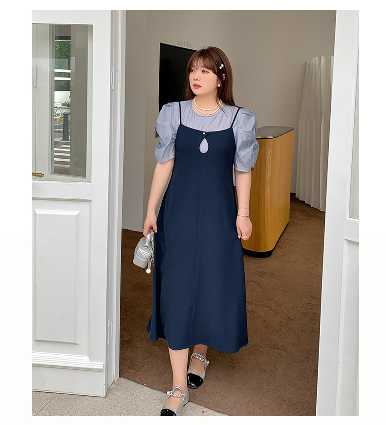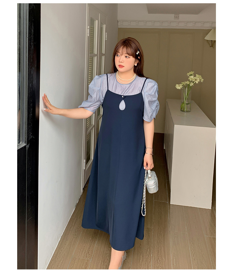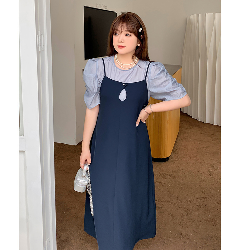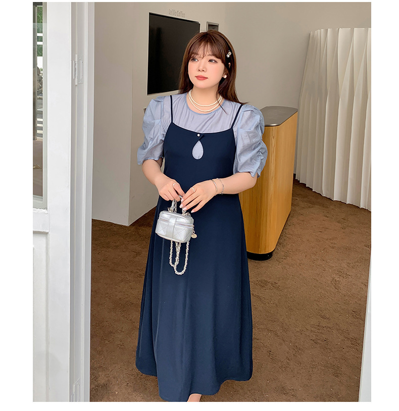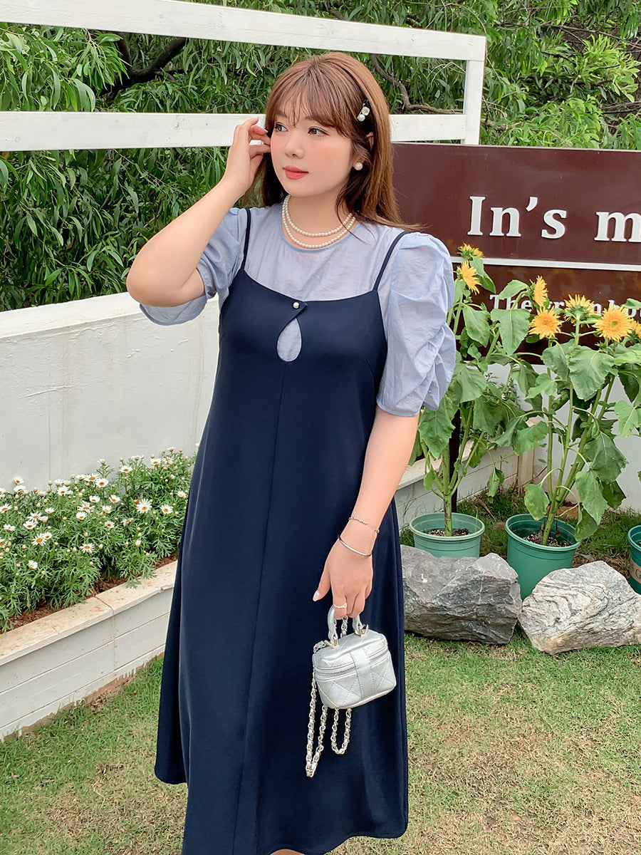 大きいサイズ レディース プリーツパフスリーブブラウス+サスペンダーワンピース LL 3L 4L 5L
