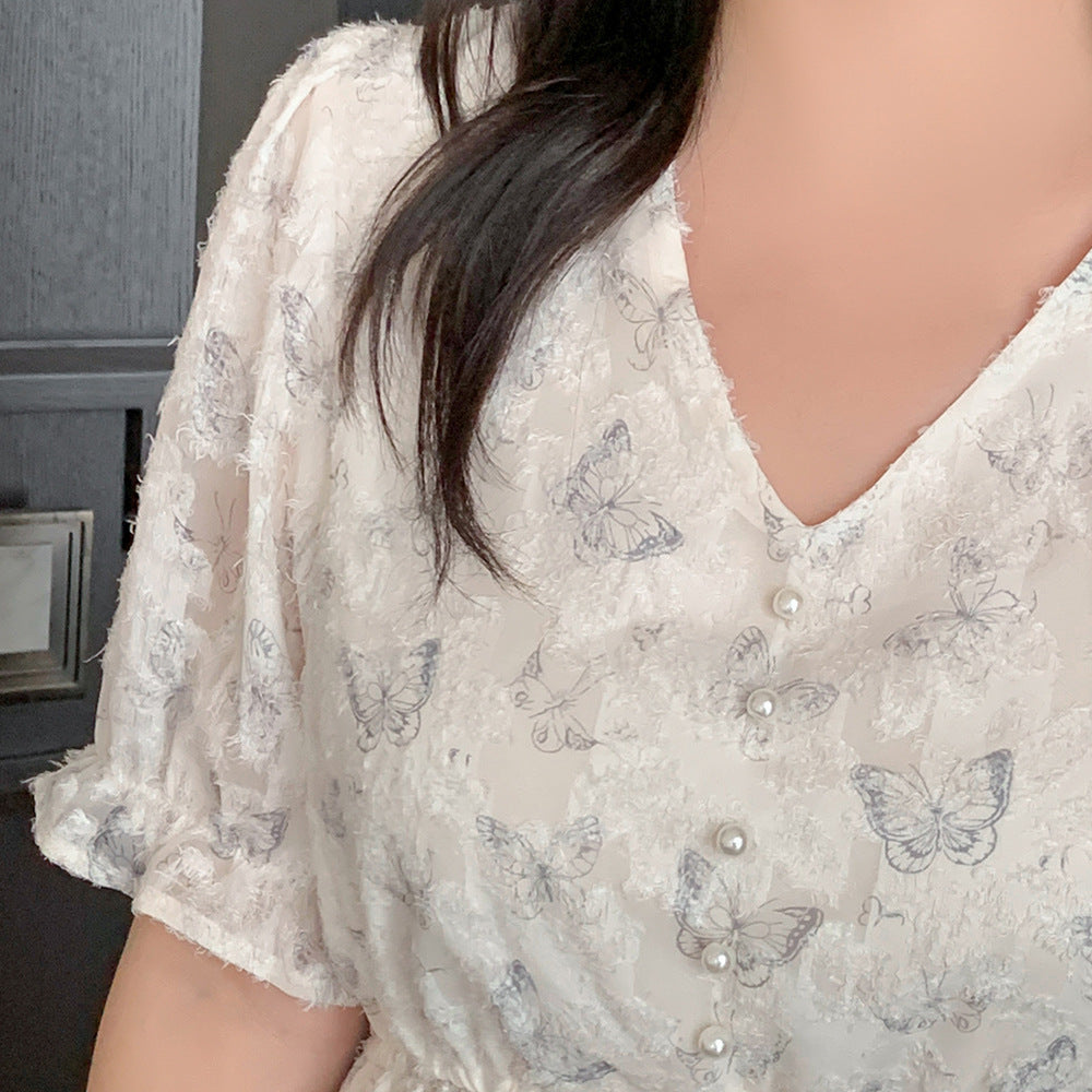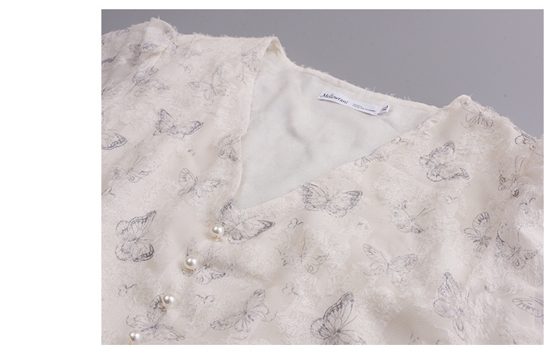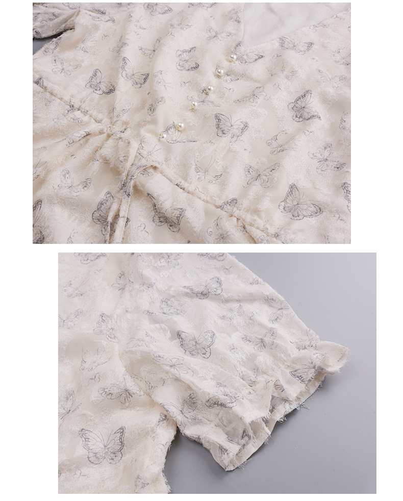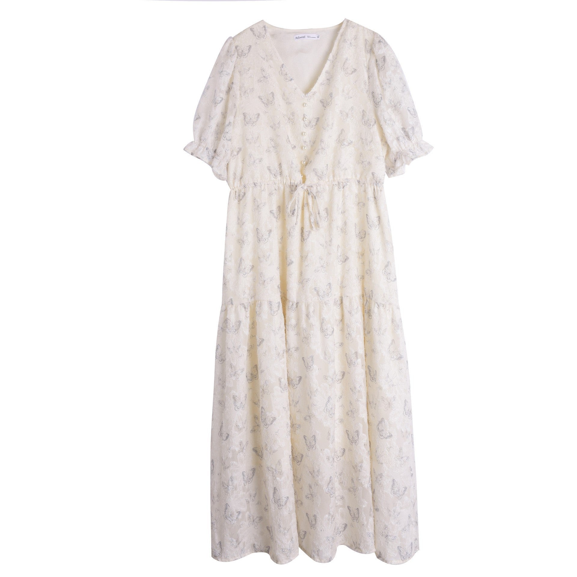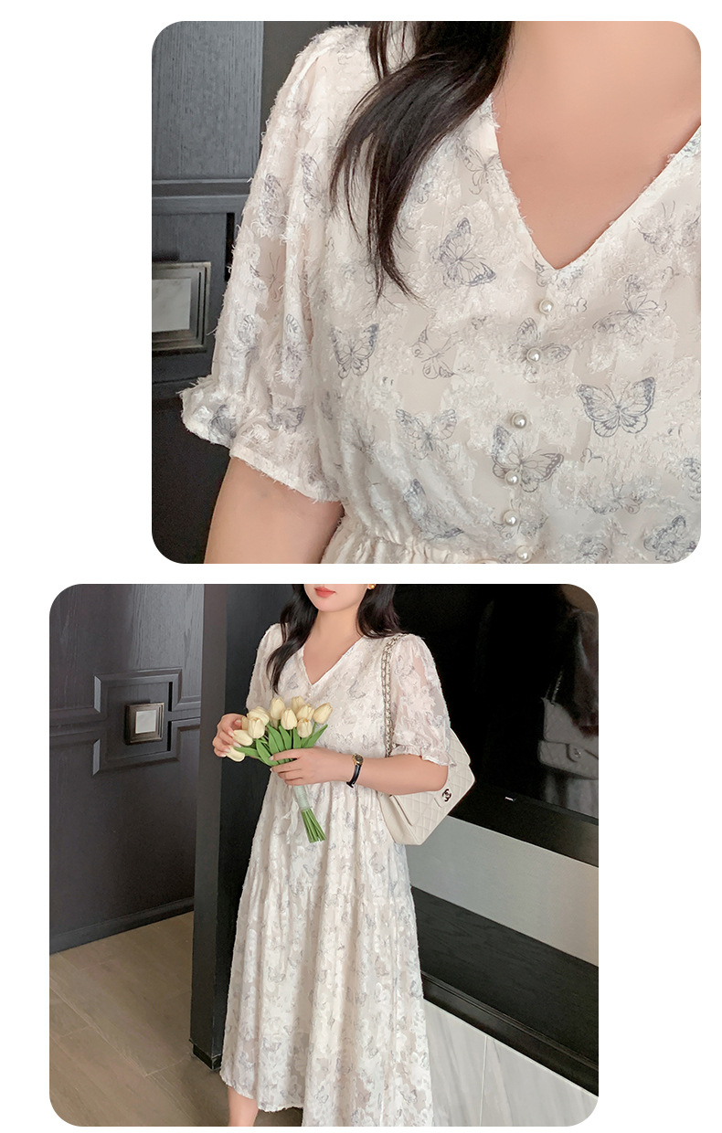 体型をカバーしてくれるVネックのロングバタフライプリントワンピース は、ウエストを調節できるゆったりとしたスタイルです。生地は今年注目のカットフラワーベースの生地を使用しております。生地の表面は立体的で滑らかで柔らかいので、夏場でも快適にご着用いただけます☆裏地付きのワンピースなので一枚でも安心。ビーズボタンがついたパフスリーブがガーリーな雰囲気を演出します☆妖精のようなスタイルを楽しみたい方にピッタリな一着です♪
