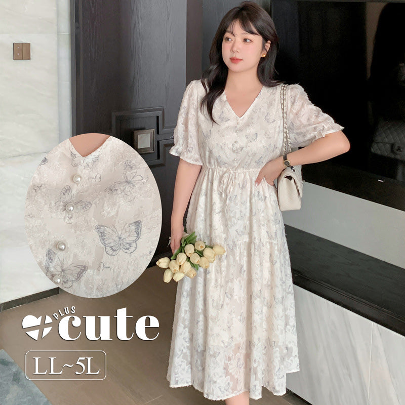 大きいサイズ レディース バタフライプリントパフスリーブワンピース LL 3L 4L 5L