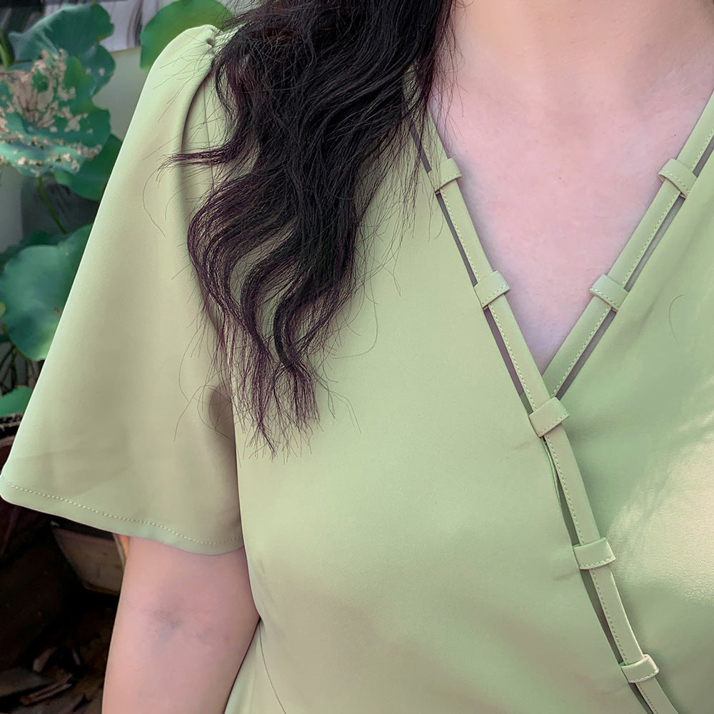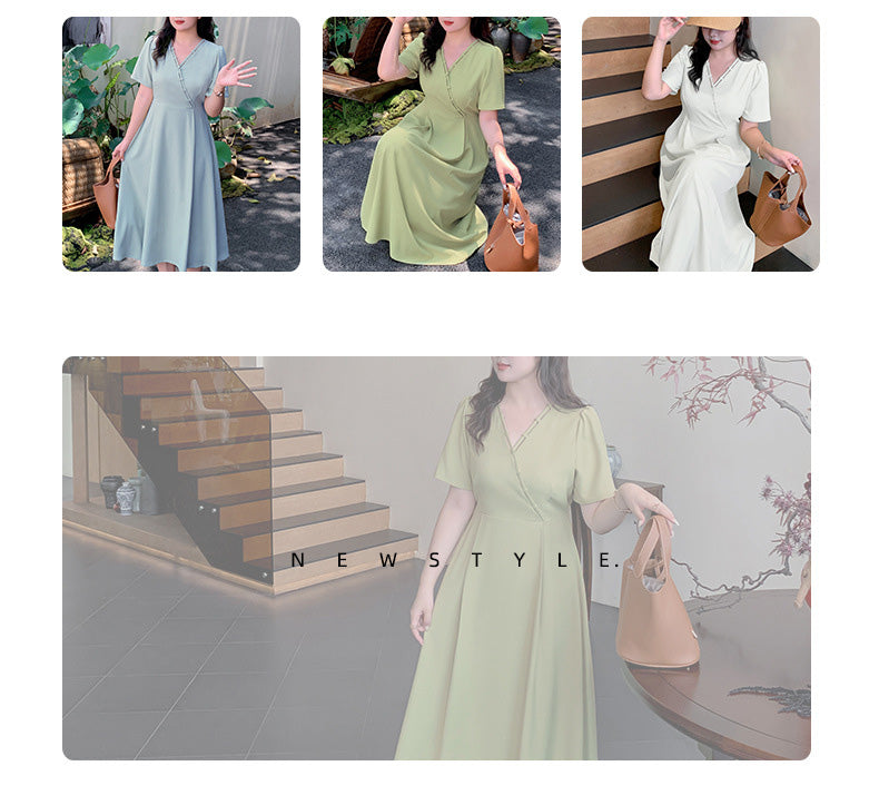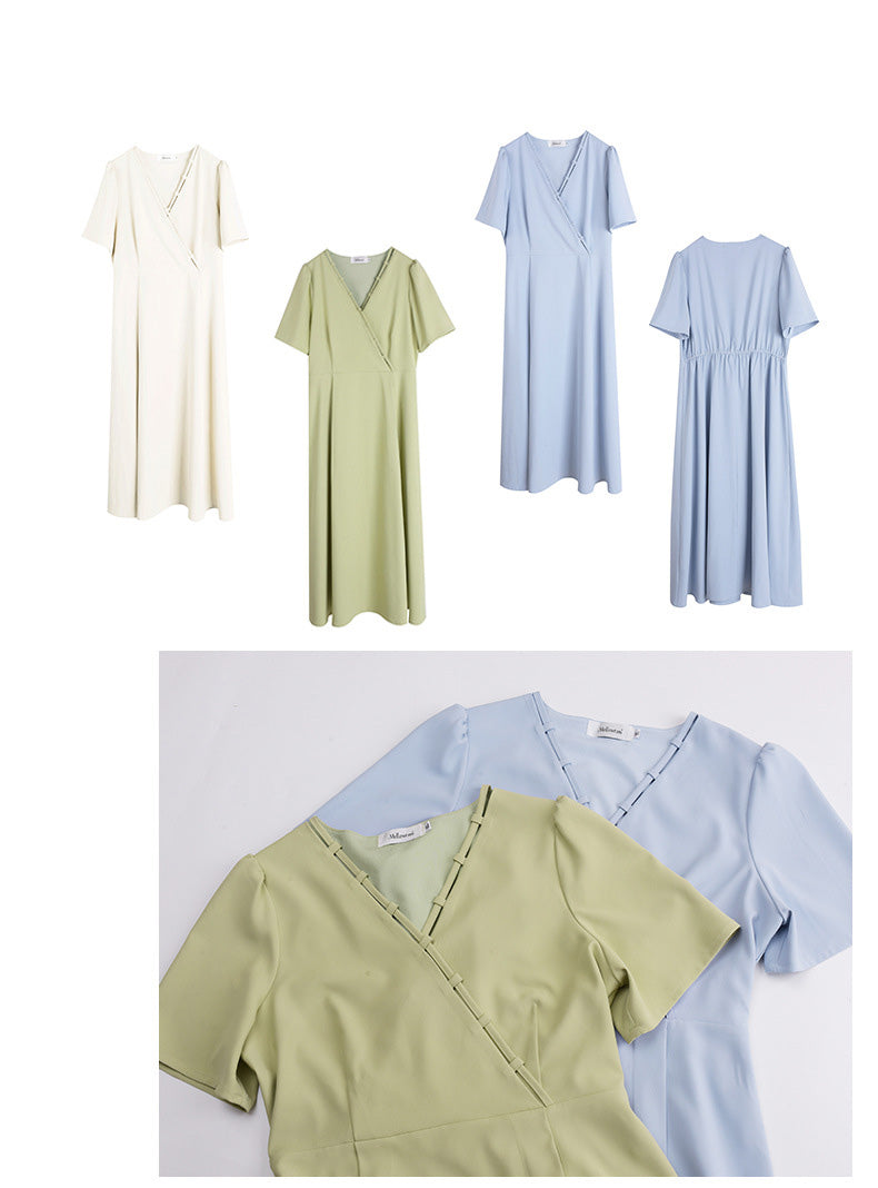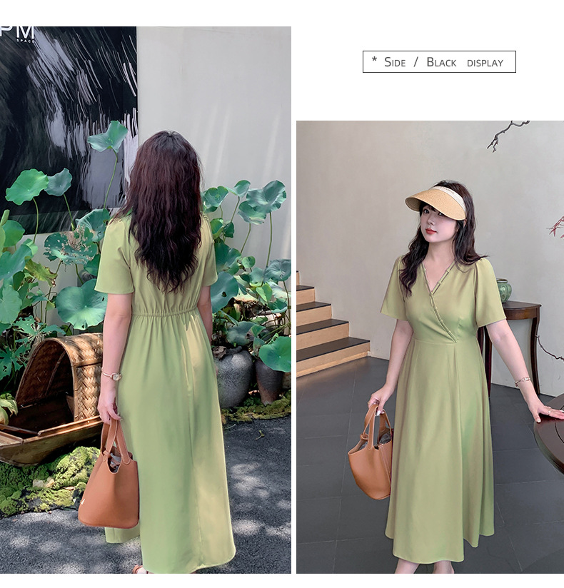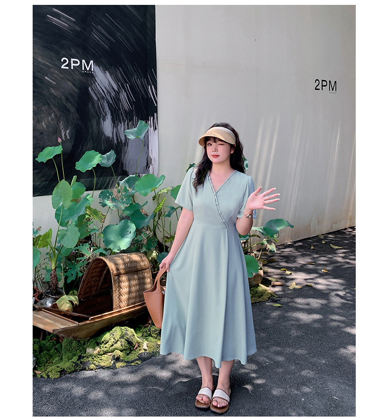 上品な大人の落ち着いた雰囲気があり、年齢を問わず挑戦できるシックなスタイルのVネック無地ワンピースです。伸縮性のあるVネックの形状とネックラインが大人の色気を演出します。クロスハンド留めのストラップネックラインは遊び心があります。バックウエストはキュッと引き締まり、大きなアンブレラ裾と相まってスタイルアップを叶えます。すっきり爽やかな3色展開で、ヘビロテ必須のアイテムです☆