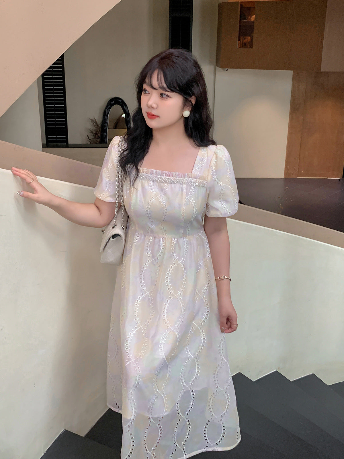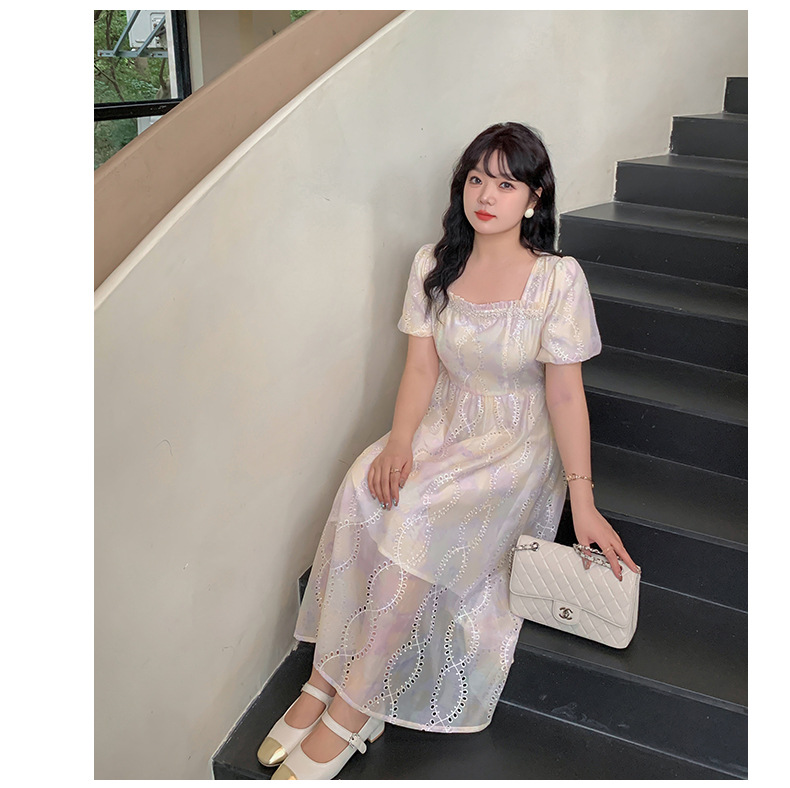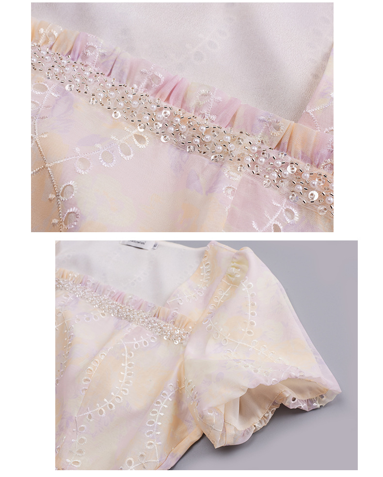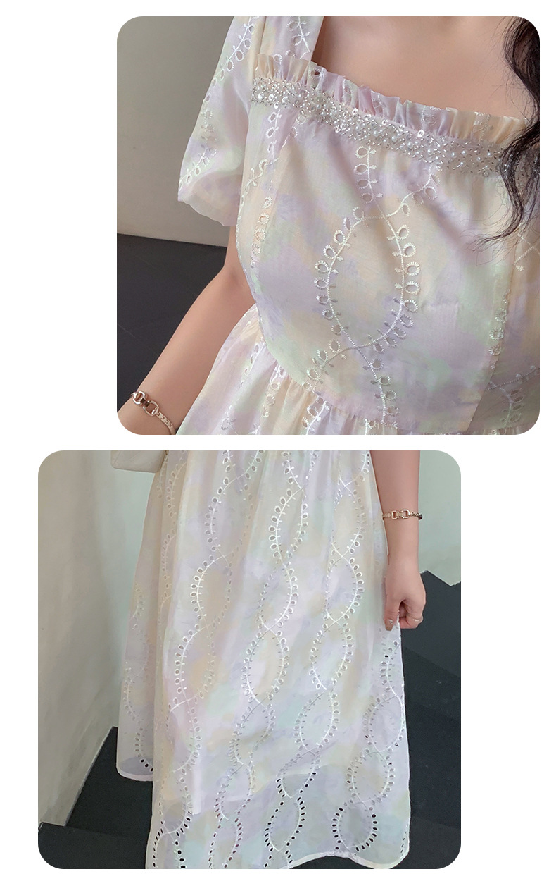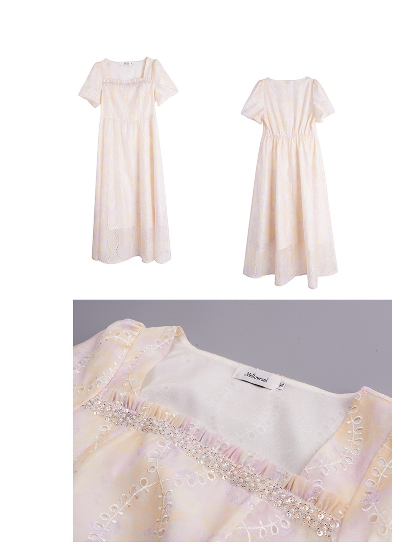 夢のようなパステルカラーのスクエアネックロングワンピースが登場。かすかなパステルカラーと表面に花の刺繍があり、印象的なデザインです。滑らかかつ柔らかい手触りで、風になびく美しさがあります。フロントネックラインにパールが施され、光沢のある生地と組み合わせています。袖口は広くゆとりがあり、バックウエストはゴム仕様なのでストレスなくご着用いただけます☆