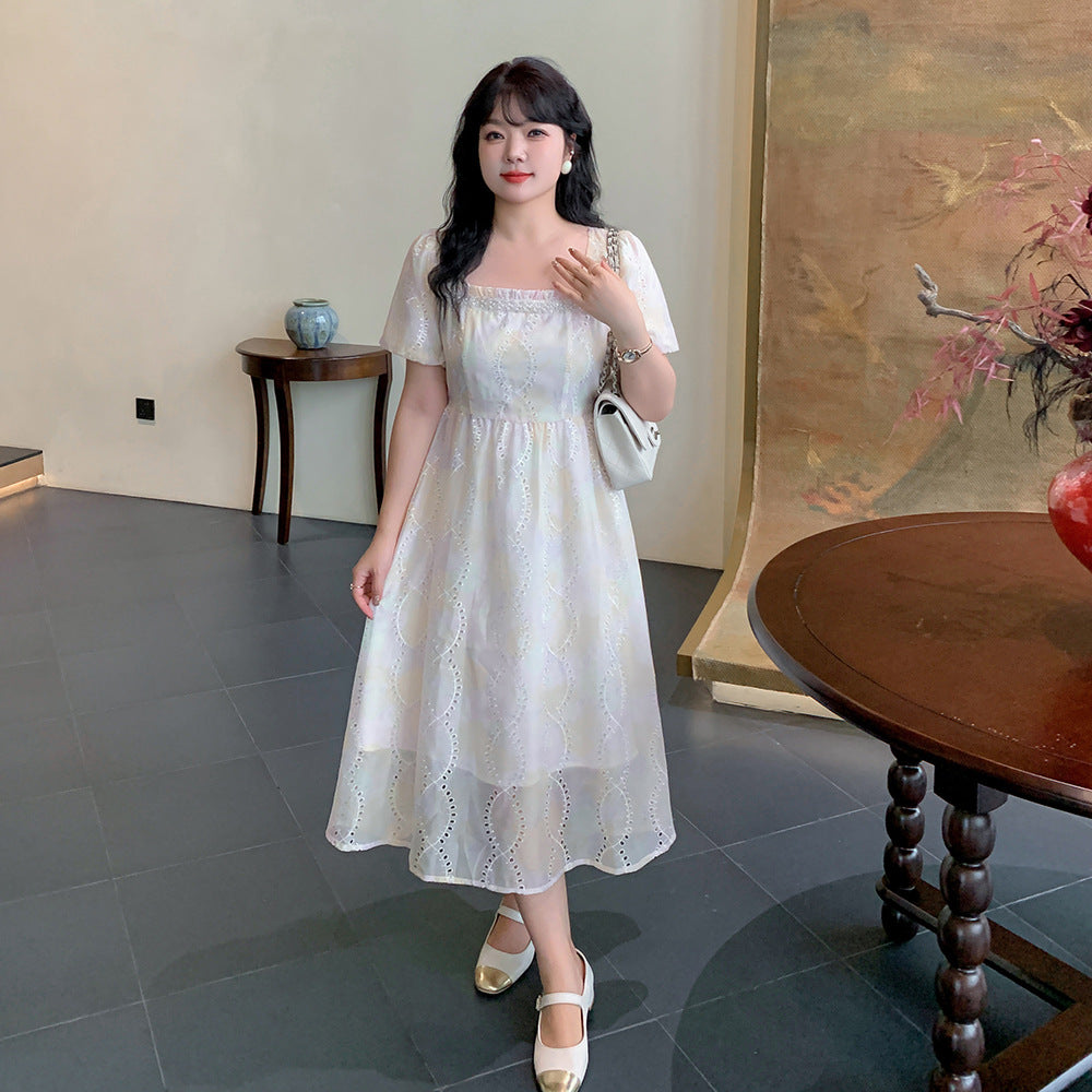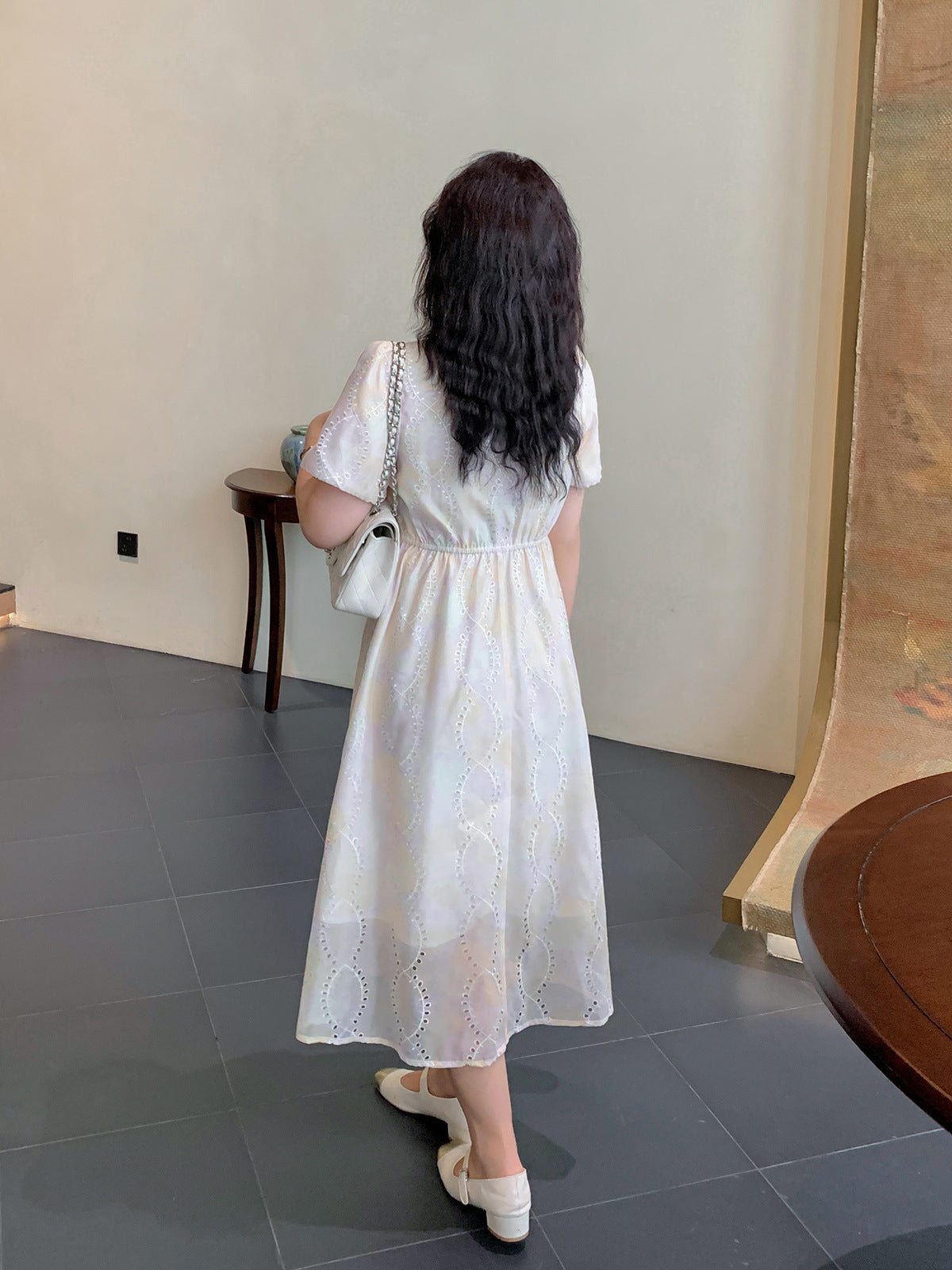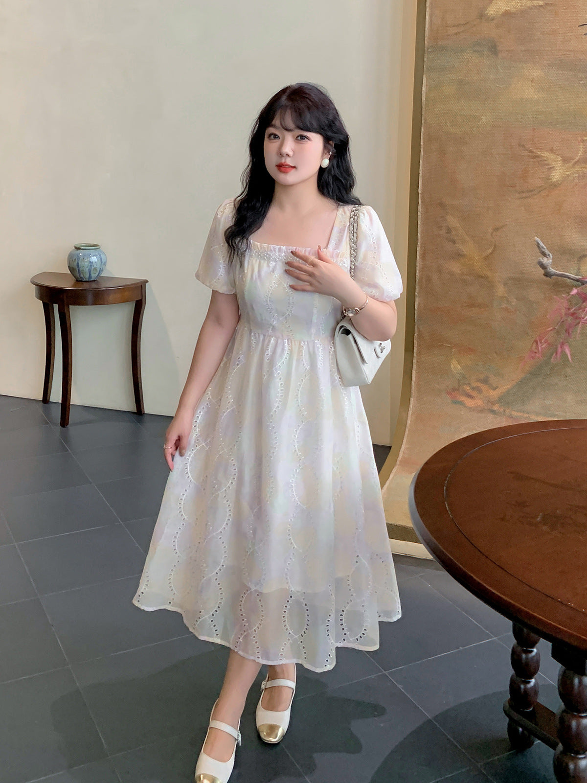 夢のようなパステルカラーのスクエアネックロングワンピースが登場。かすかなパステルカラーと表面に花の刺繍があり、印象的なデザインです。滑らかかつ柔らかい手触りで、風になびく美しさがあります。フロントネックラインにパールが施され、光沢のある生地と組み合わせています。袖口は広くゆとりがあり、バックウエストはゴム仕様なのでストレスなくご着用いただけます☆