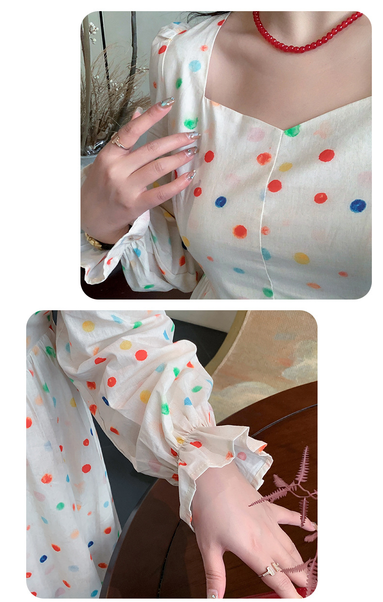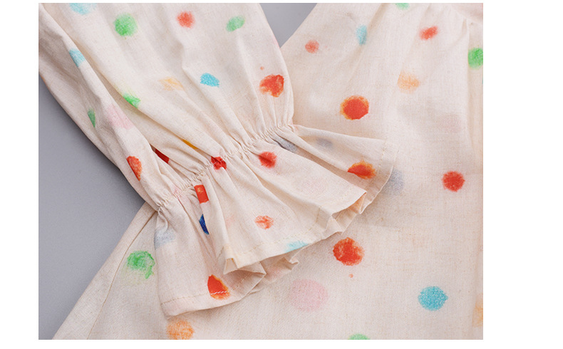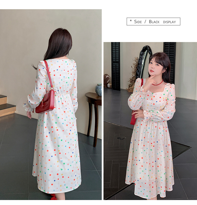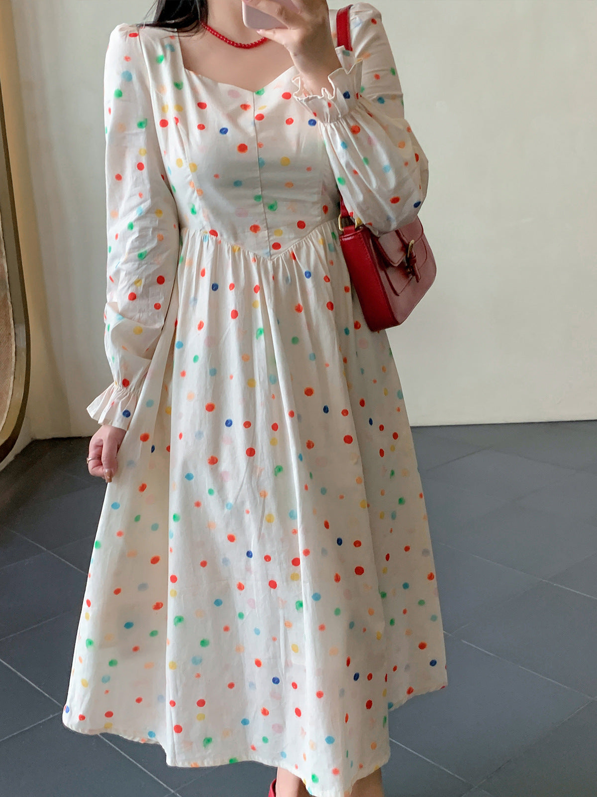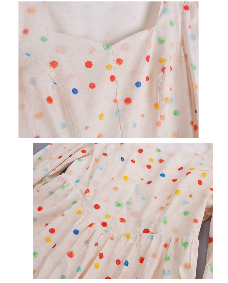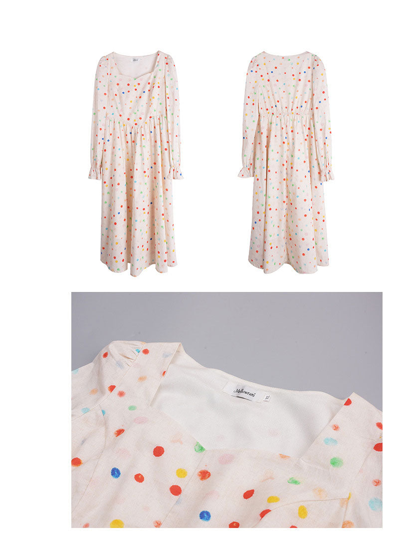 このポップでレトロな雰囲気漂うかわいい長袖の水玉ワンピースは、通気性があり快適なコットン生地で作られています☆表面にはレインボーの水玉プリントとアプリコット色のダメージ感のあるプリントが施されていています。スクエアネックがデコルテラインを綺麗見せし、お腹の肉感をカバーする逆三角形のウエストデザインがスタイルアップを叶えます☆バックウエストはゴム入りなので、着脱ラクラクです♪