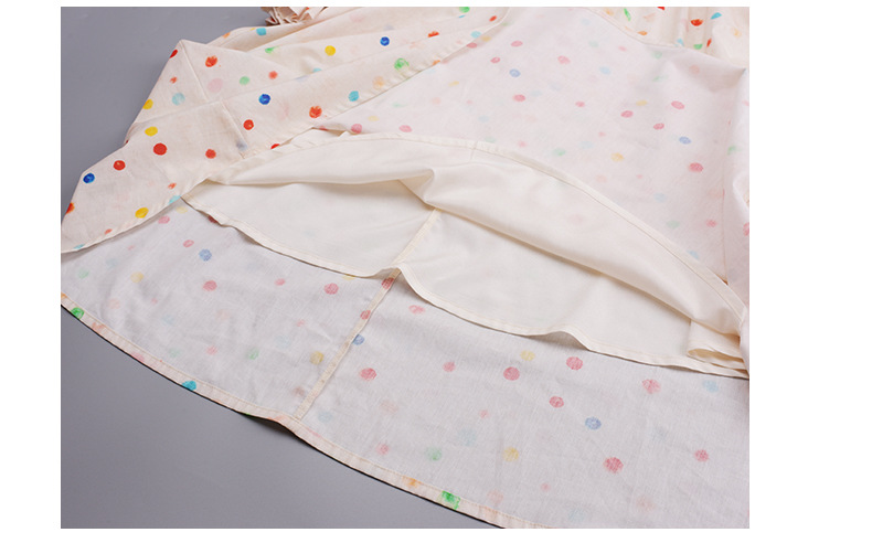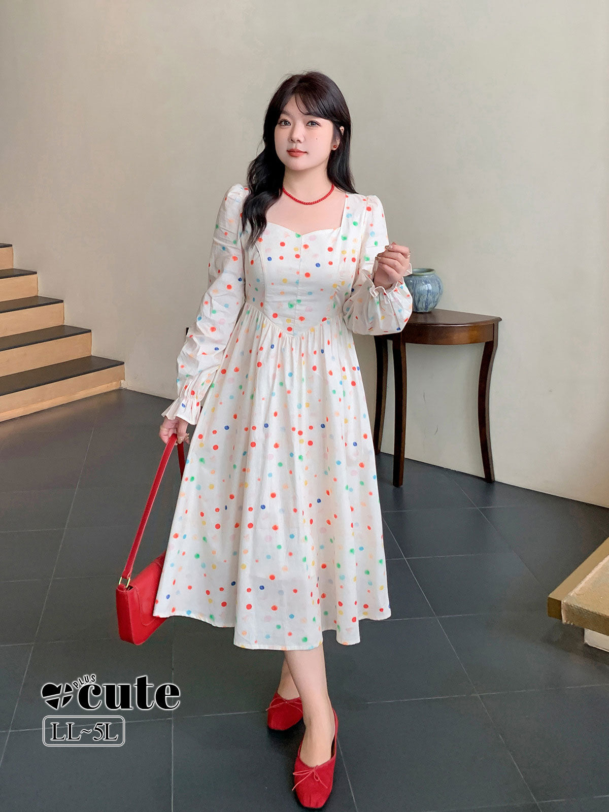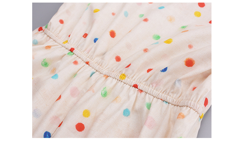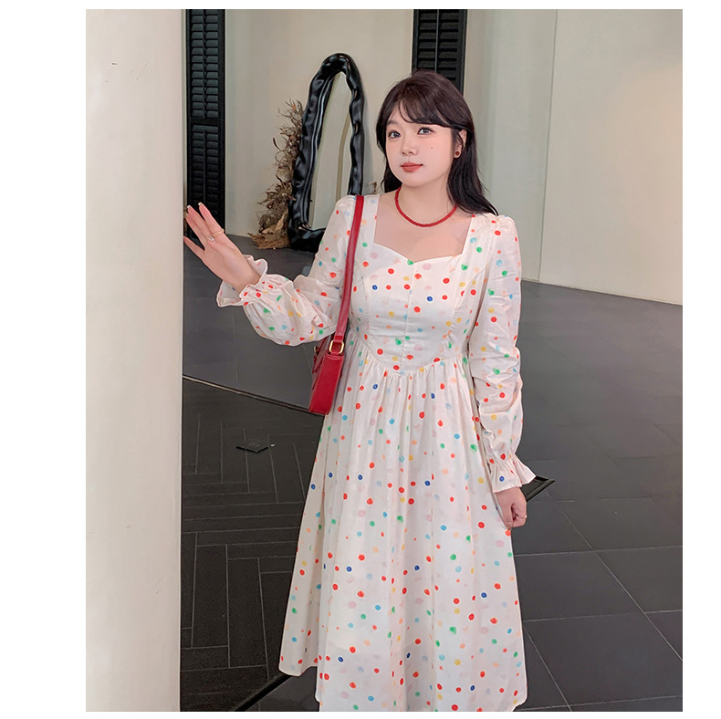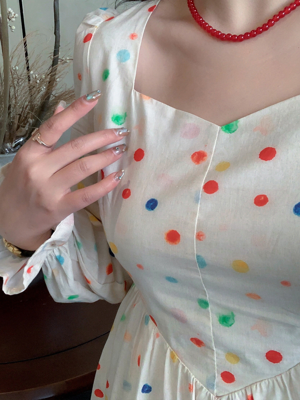 このポップでレトロな雰囲気漂うかわいい長袖の水玉ワンピースは、通気性があり快適なコットン生地で作られています☆表面にはレインボーの水玉プリントとアプリコット色のダメージ感のあるプリントが施されていています。スクエアネックがデコルテラインを綺麗見せし、お腹の肉感をカバーする逆三角形のウエストデザインがスタイルアップを叶えます☆バックウエストはゴム入りなので、着脱ラクラクです♪