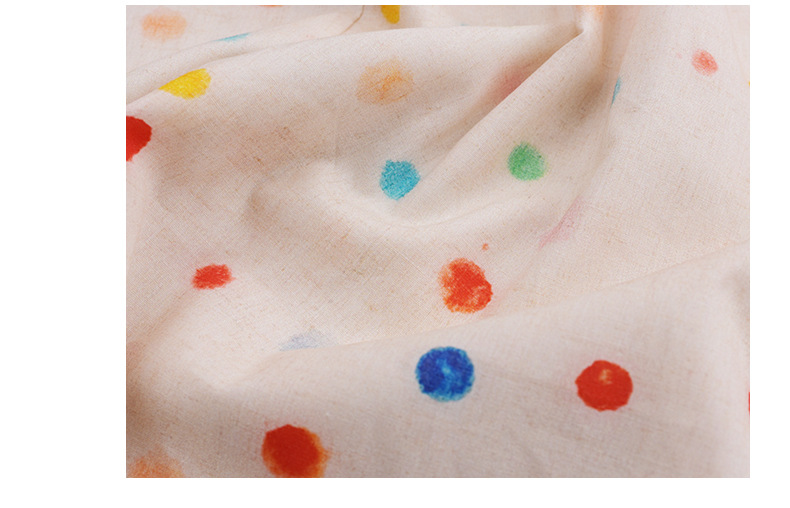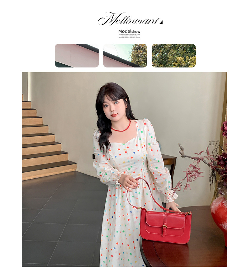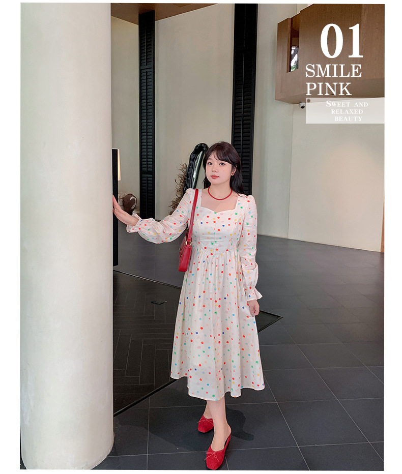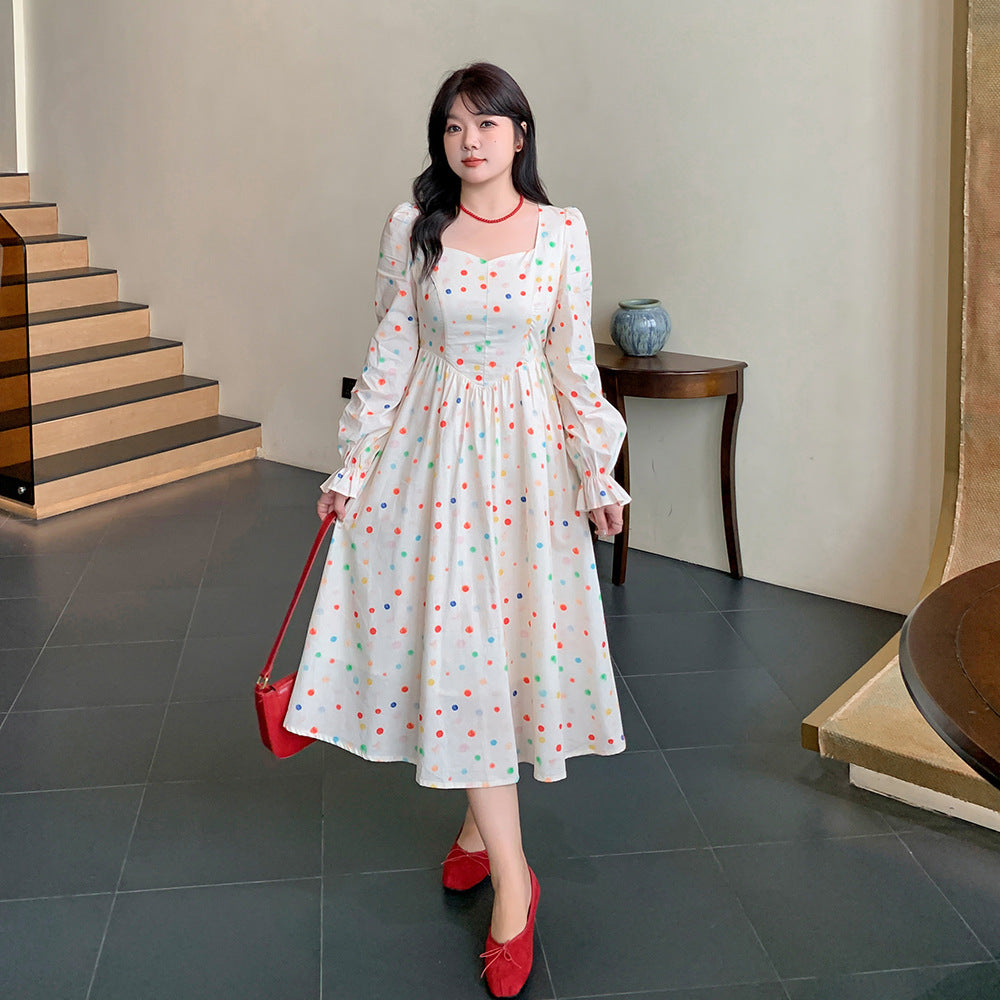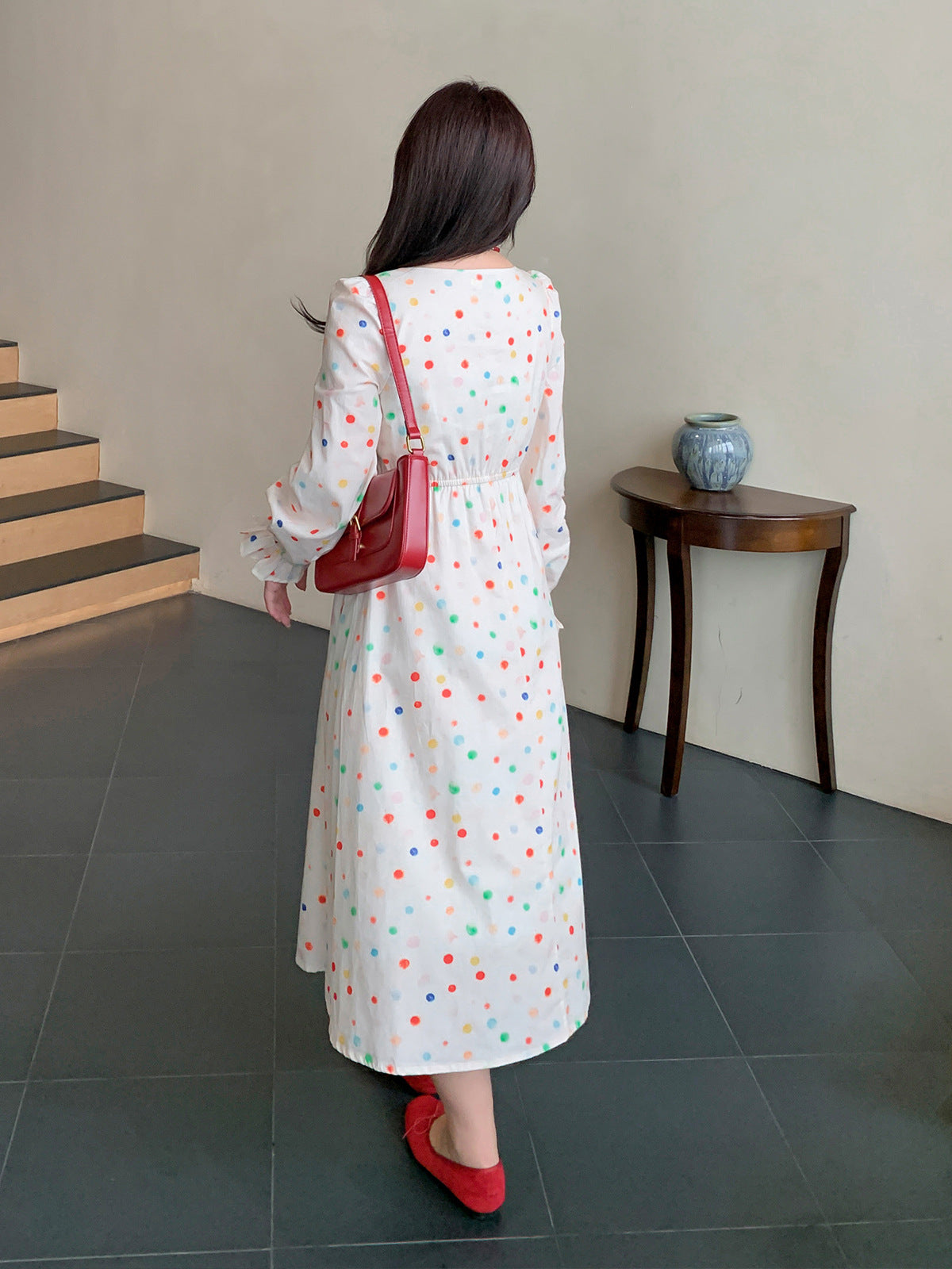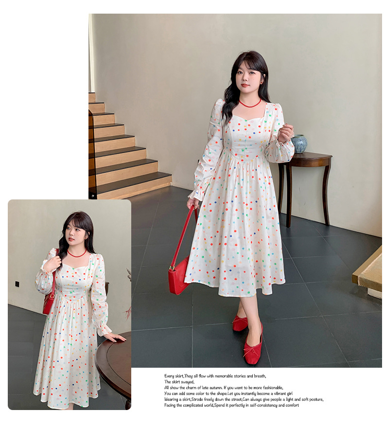 このポップでレトロな雰囲気漂うかわいい長袖の水玉ワンピースは、通気性があり快適なコットン生地で作られています☆表面にはレインボーの水玉プリントとアプリコット色のダメージ感のあるプリントが施されていています。スクエアネックがデコルテラインを綺麗見せし、お腹の肉感をカバーする逆三角形のウエストデザインがスタイルアップを叶えます☆バックウエストはゴム入りなので、着脱ラクラクです♪