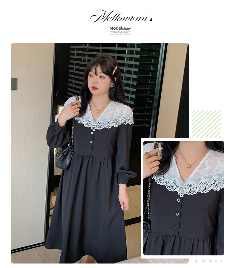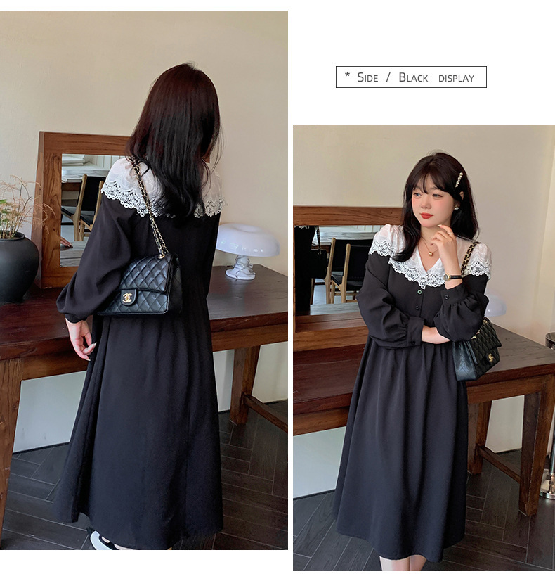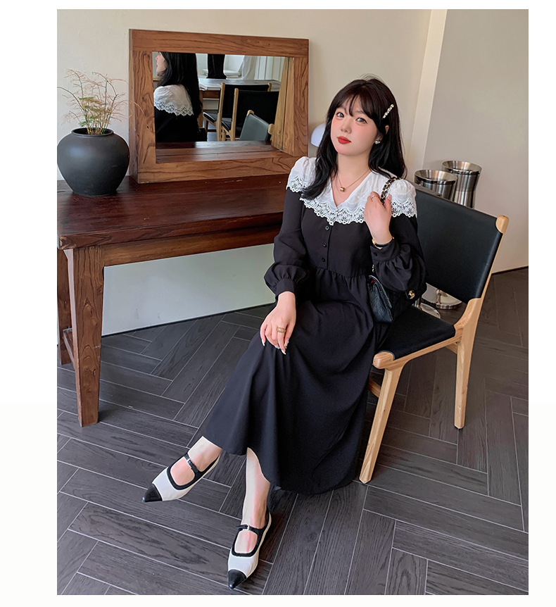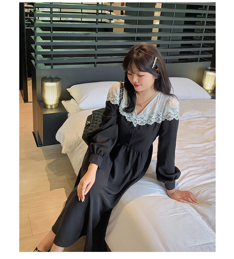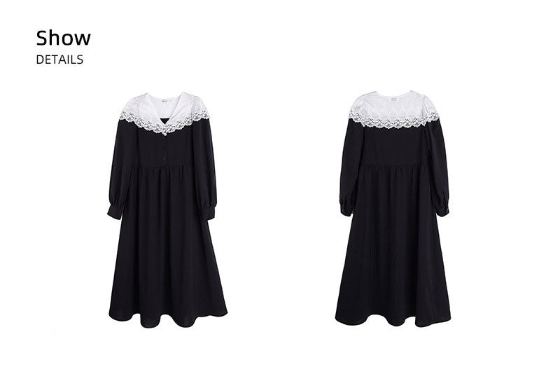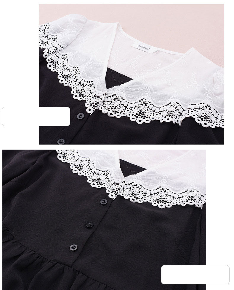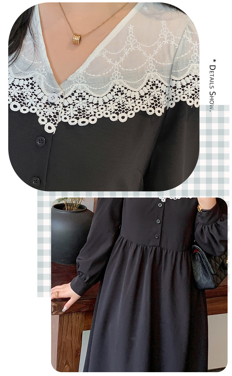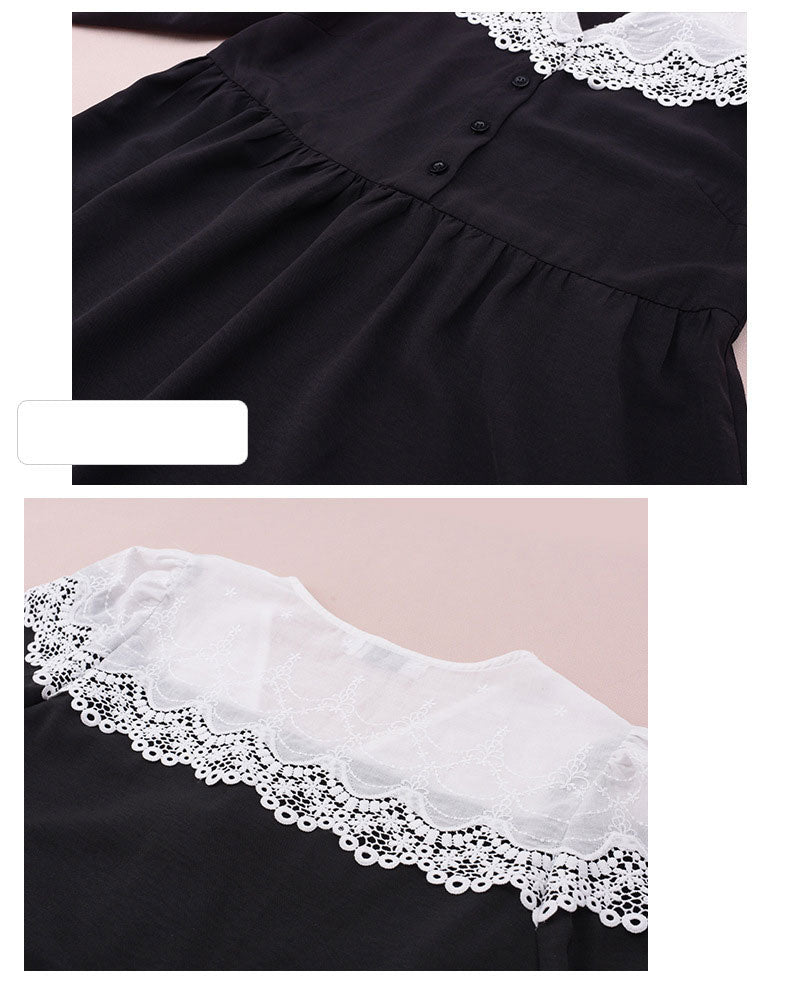 黒と白のコントラストのあるカラーが魅力的なクラシカルワンピースは、レース生地と通気性のある無地の生地で作られており、柔らかく滑らかなVネックデザインが施されています。フロントボタンは取り外し可能で、上半身は非常にスリムでスッキリとして見せることが出来ます。袖口サイドには隠しジッパー・ウエストには絞るためのボタンがあり、着痩せ効果を期待できます。シンプルかつエレガントな配色とデザインがシックで可愛いワンピースを