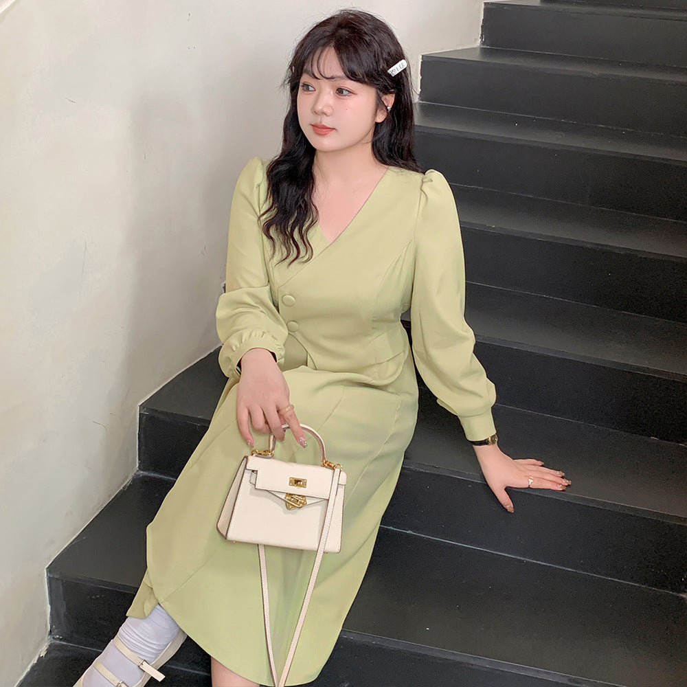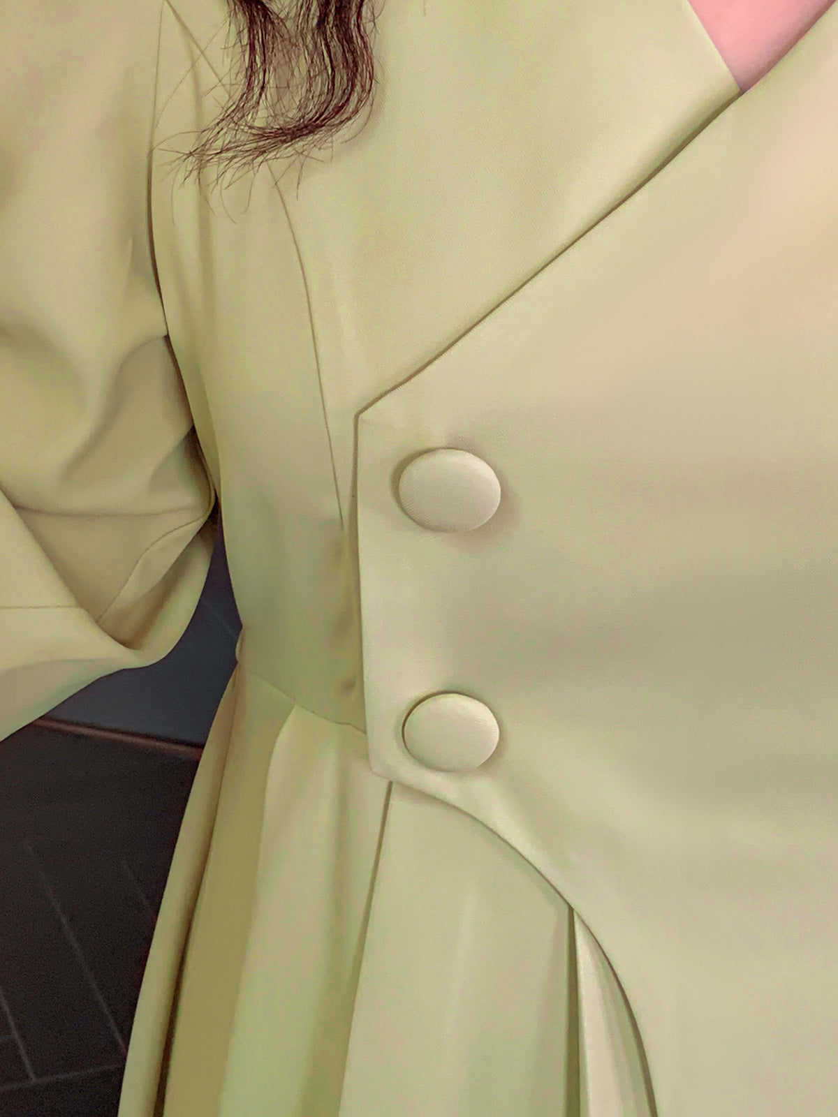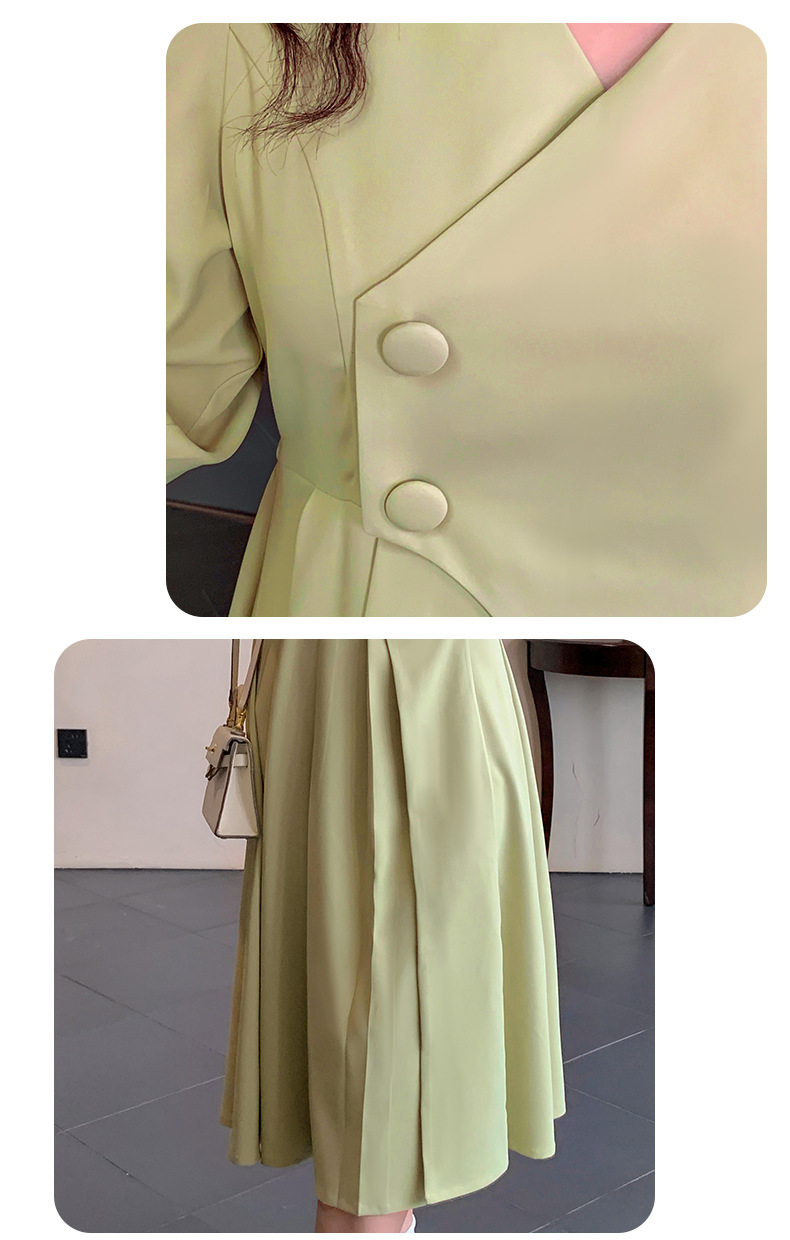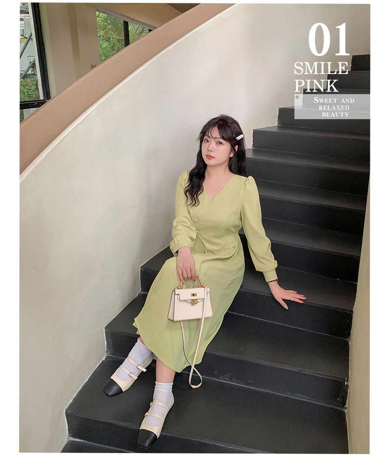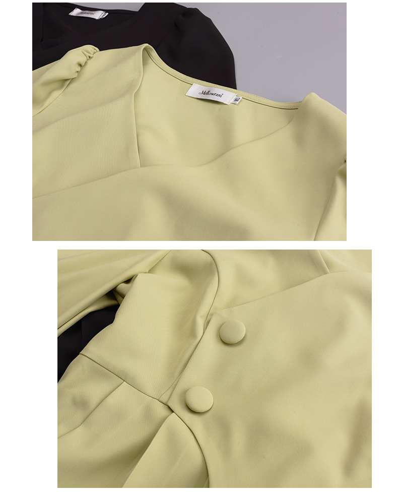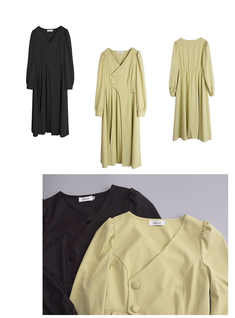知的で上品な雰囲気のアシンメトリーデザインのVネックワンピースは、滑らかなドレープ感と清涼感のある肌触りが特徴。フロントパネルはアシンメトリーにカットされています。バックウエスト部分は伸縮性があります。程良いパフスリーブは、女性らしいシルエットを引き立て、隠したい二の腕をカバーしてくれます☆また、袖口のボタンは開けることができます。