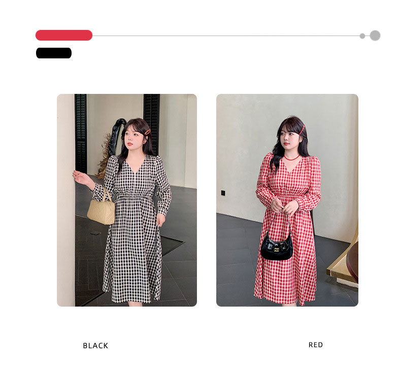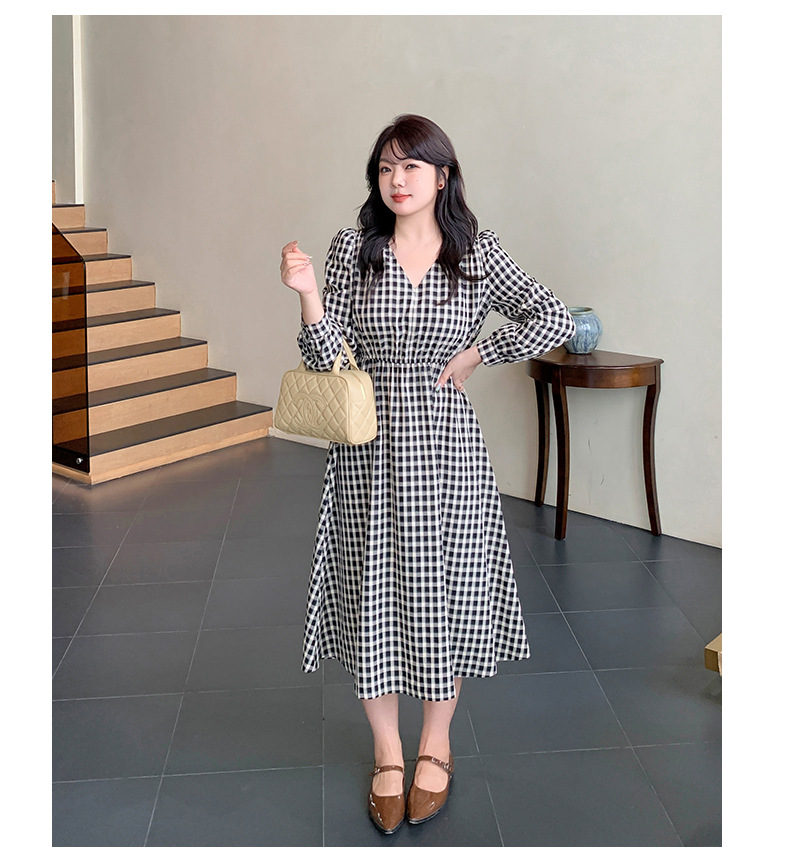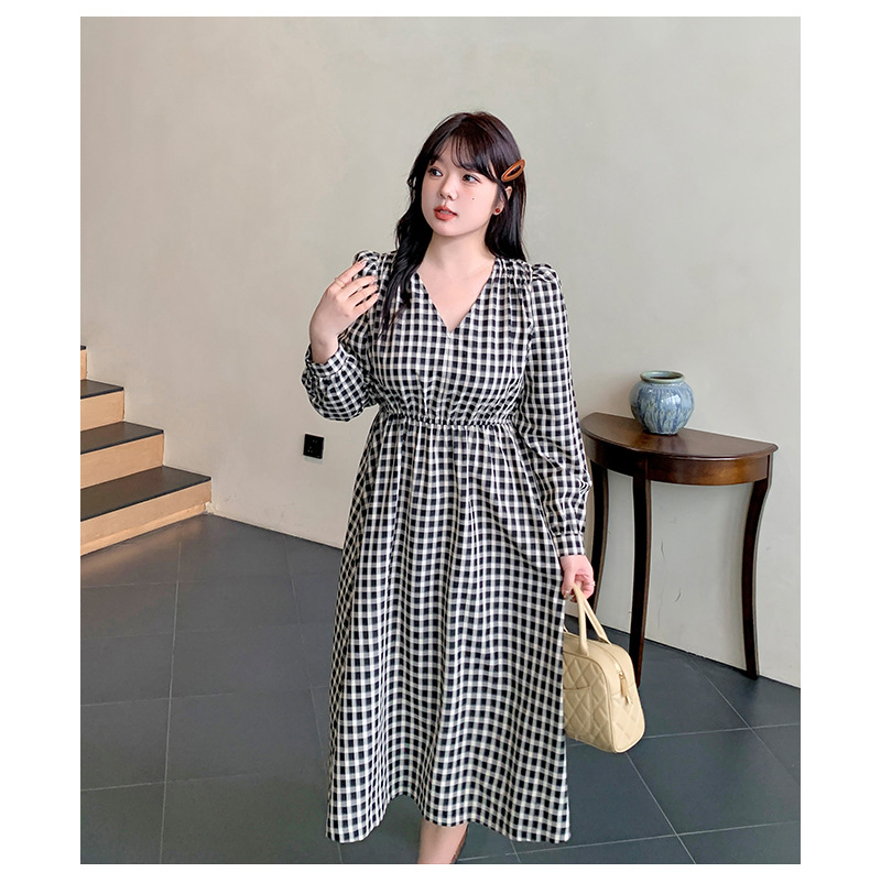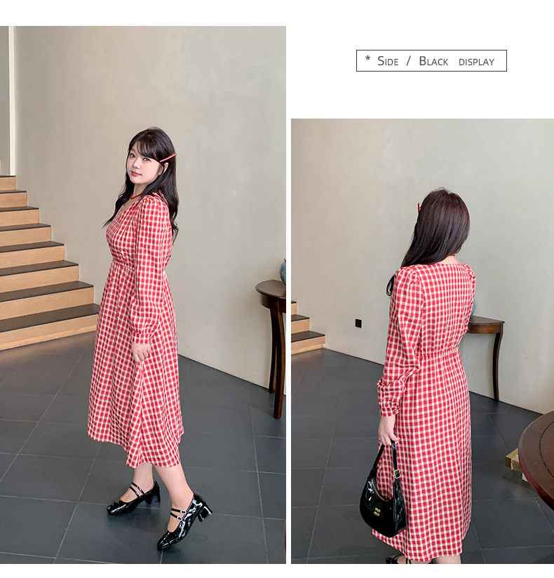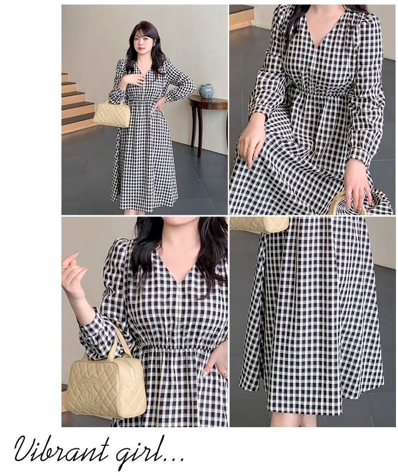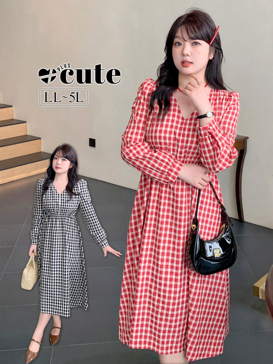 大きいサイズ レディース ウエストゴムギンガムチェック柄長袖ワンピース LL 3L 4L 5L