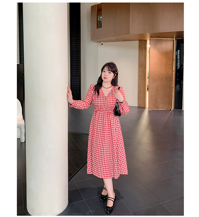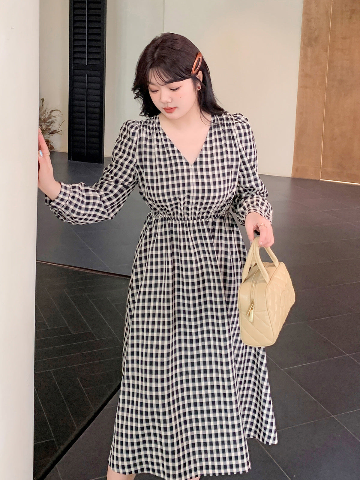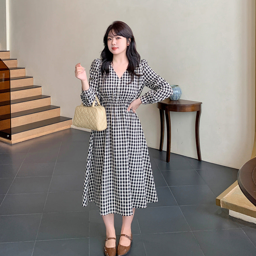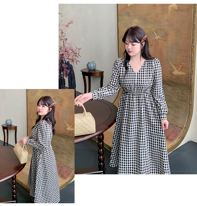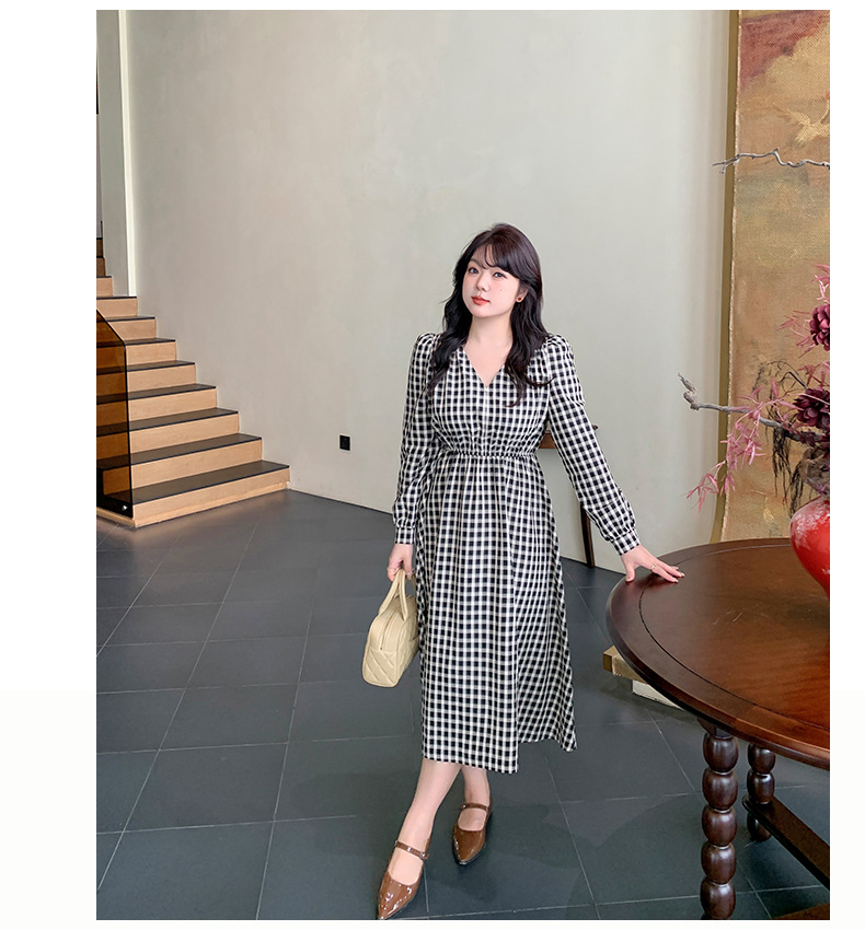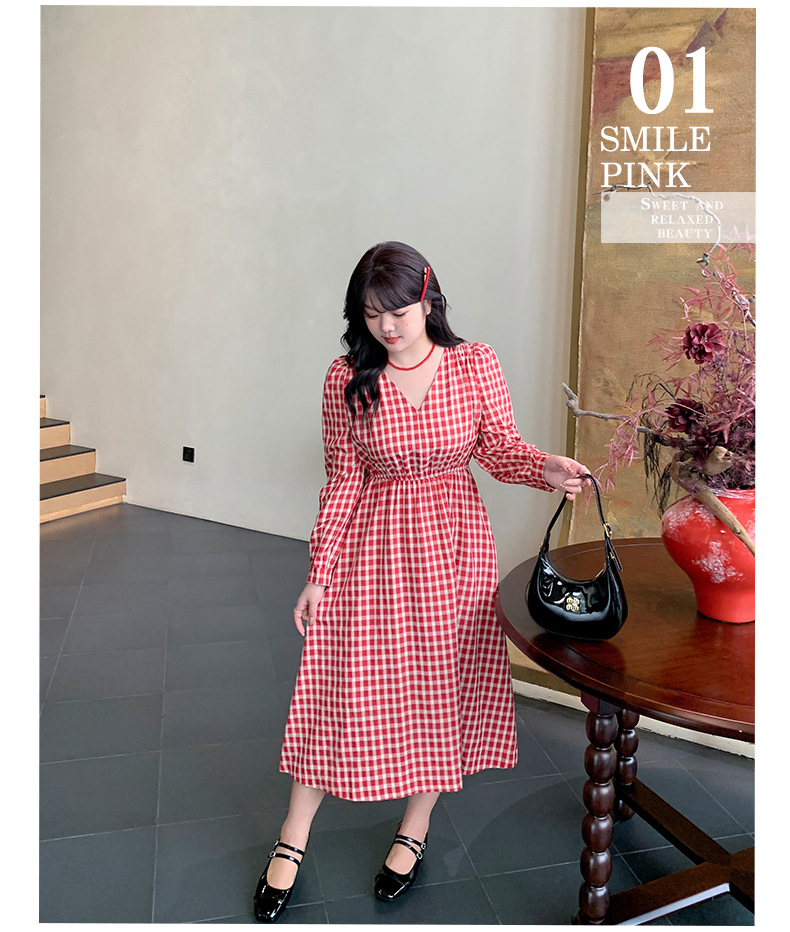 大きいサイズ レディース ウエストゴムギンガムチェック柄長袖ワンピース LL 3L 4L 5L