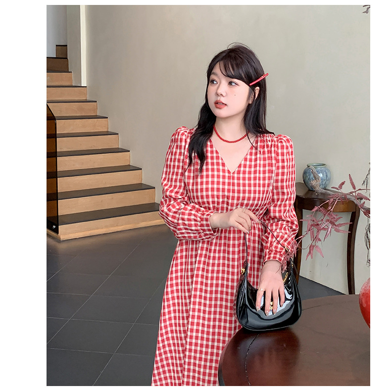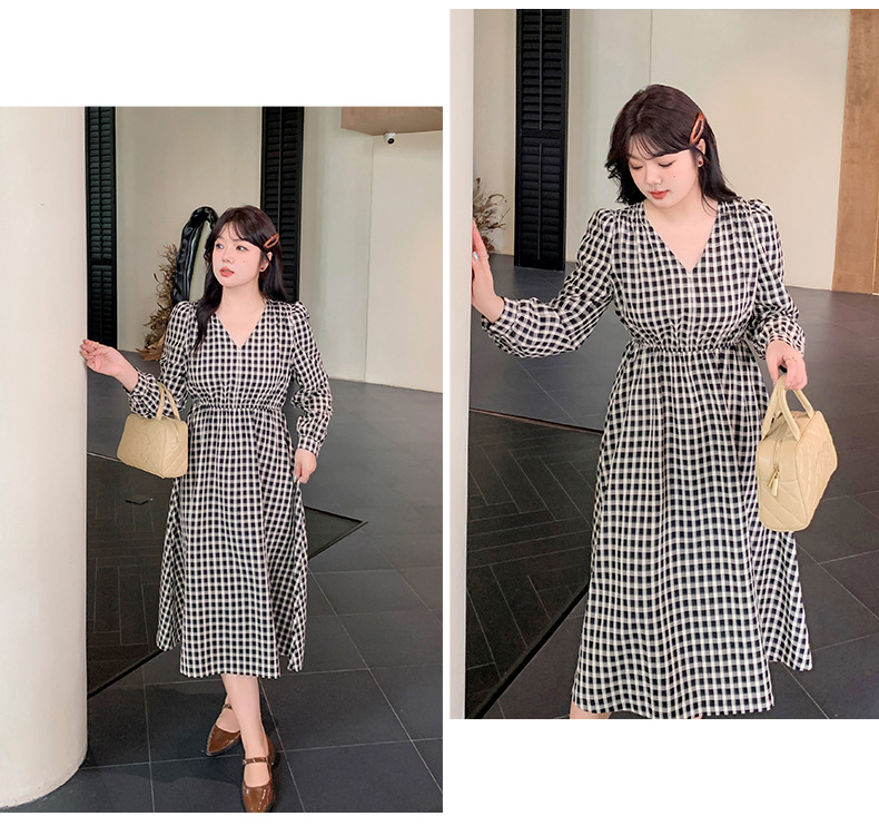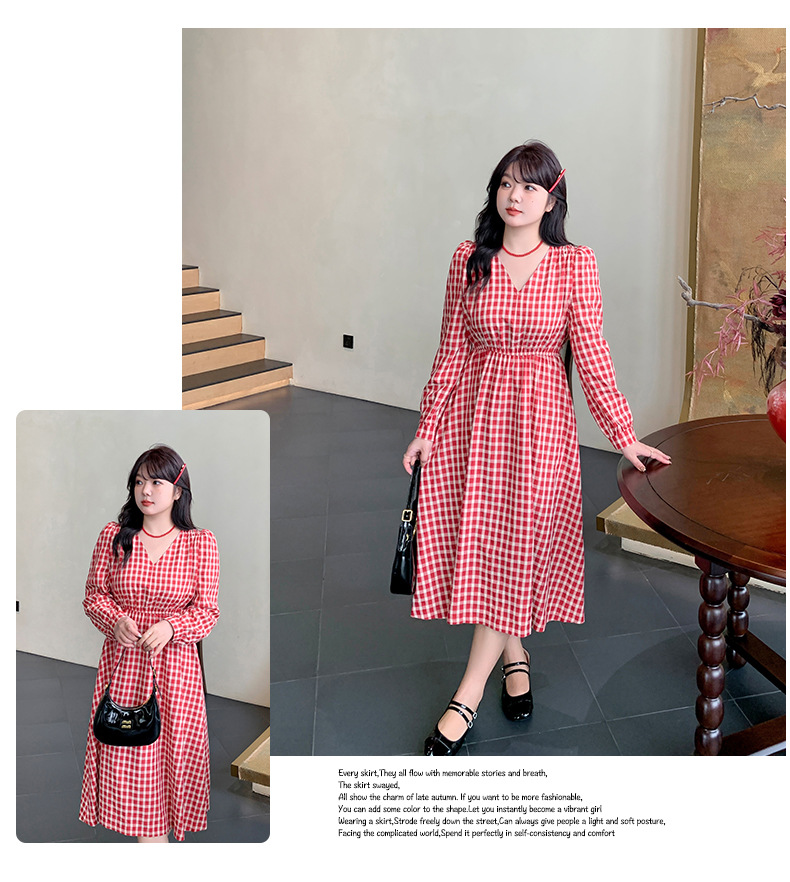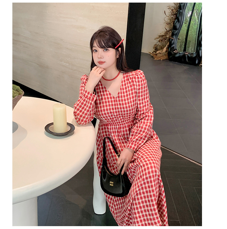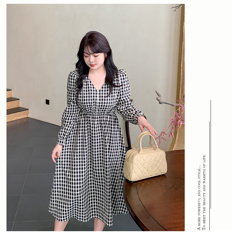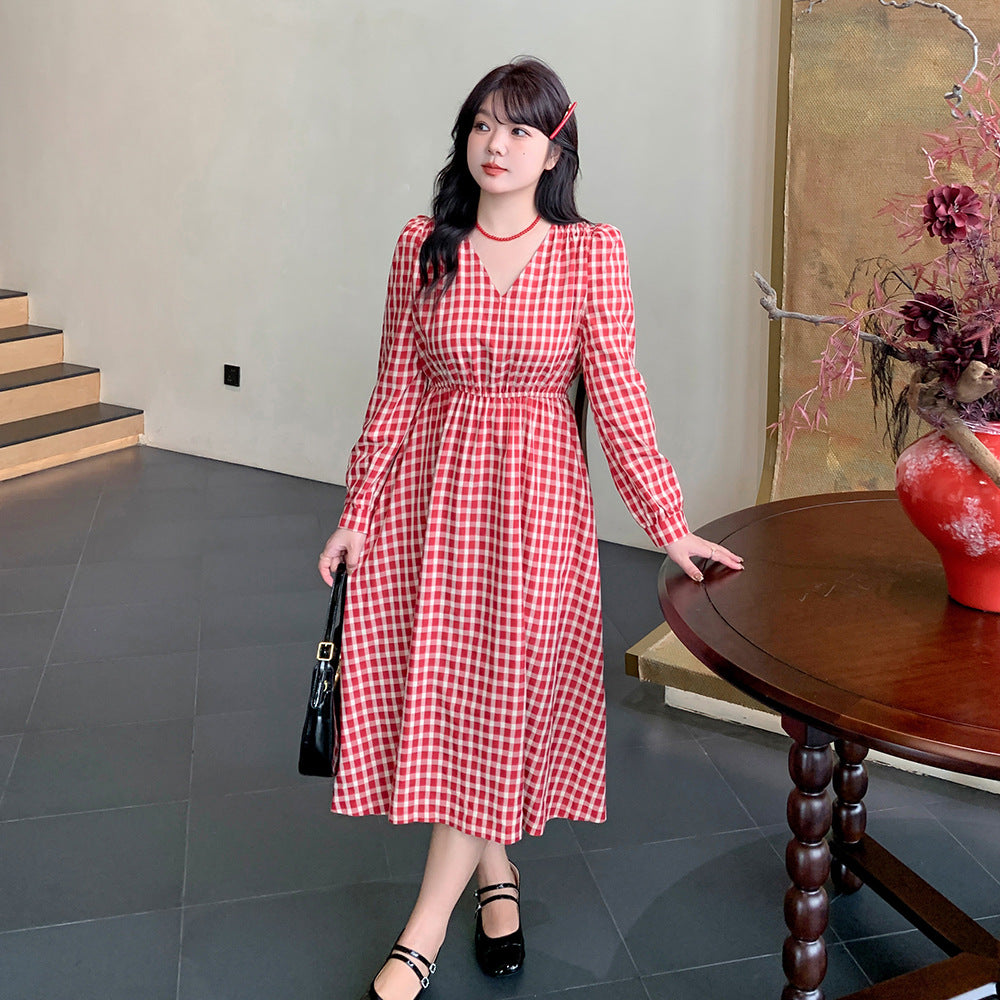大きいサイズ レディース ウエストゴムギンガムチェック柄長袖ワンピース LL 3L 4L 5L