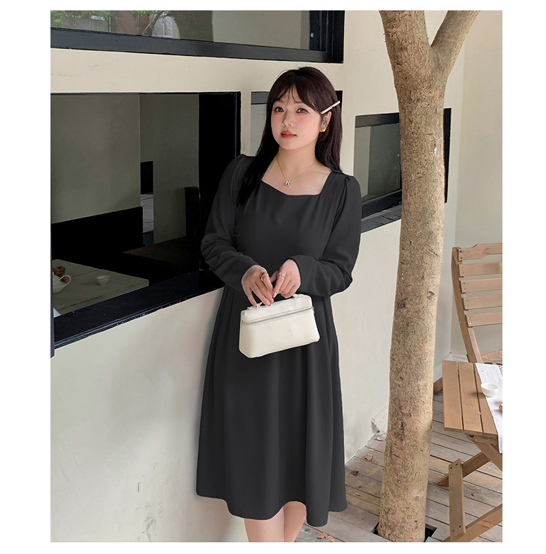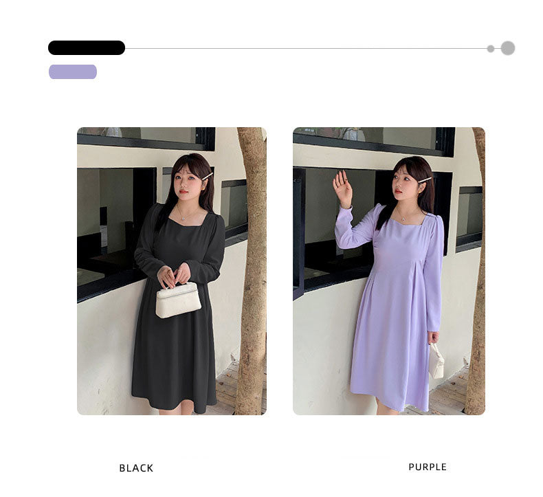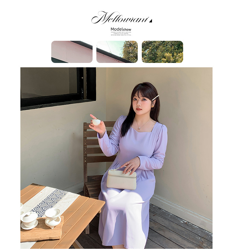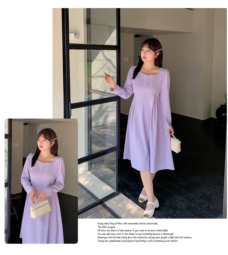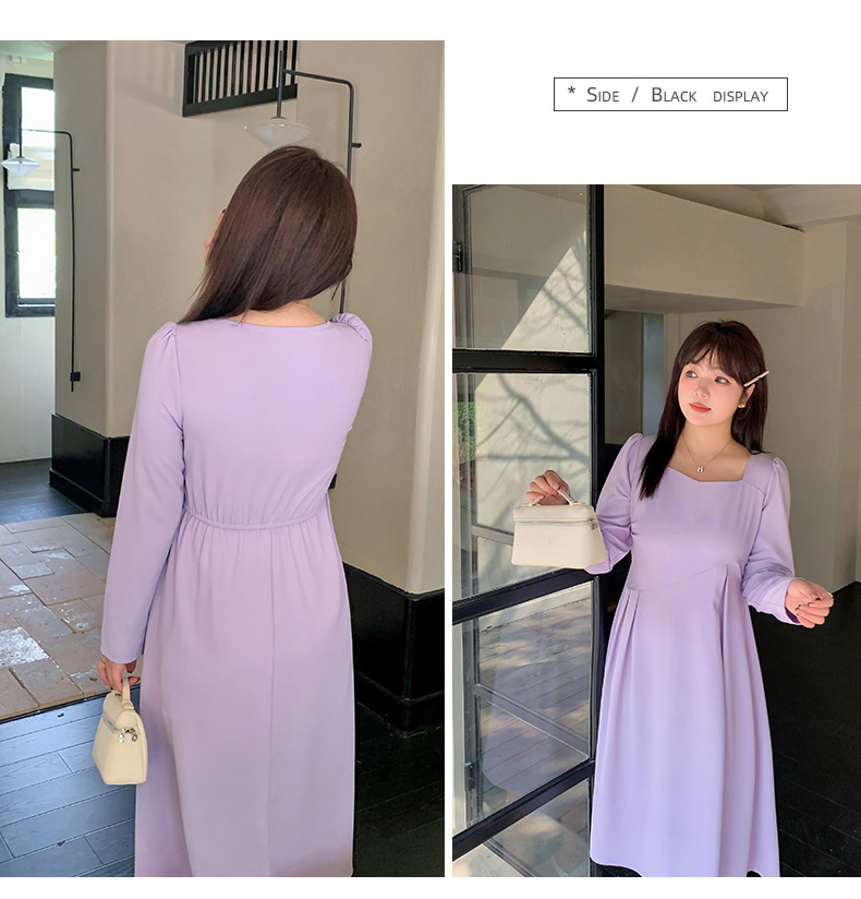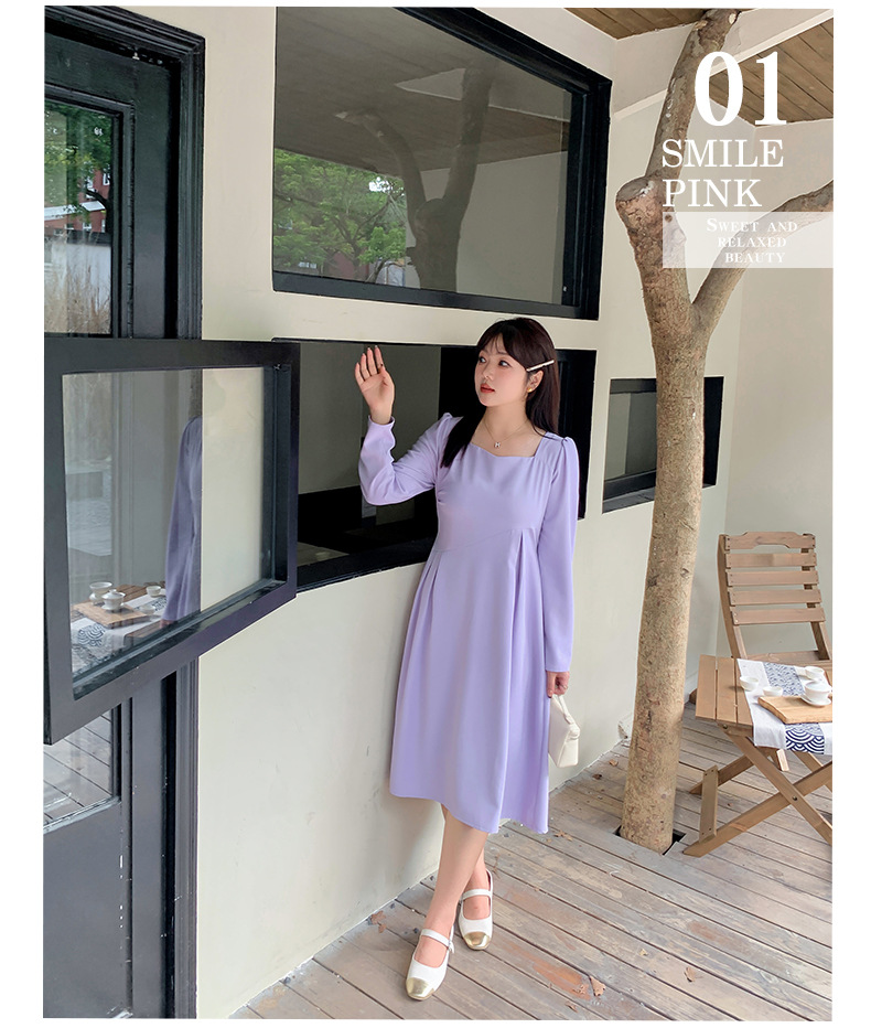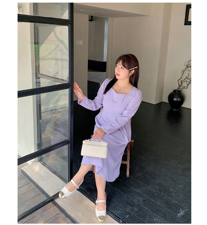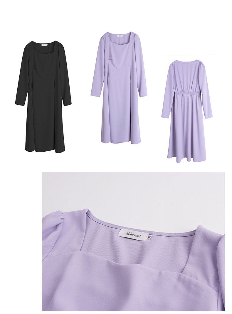 滑らかな生地の無地のスクエアネックロングワンピースは、プリーツとシームデザインが施されています。ウエストで切り替わる立体構造と伸縮性のあるAラインスカートは裾が滑らかで、レトロでエレガントな雰囲気を与えます。上品でシックなこのワンピースは、どんなアウターとも合うデザインです。