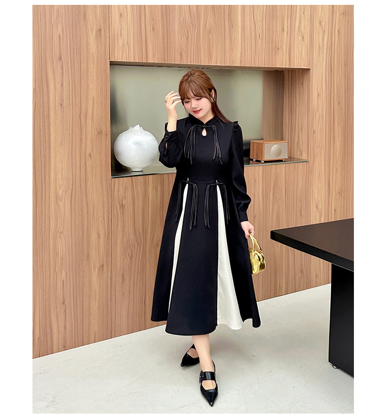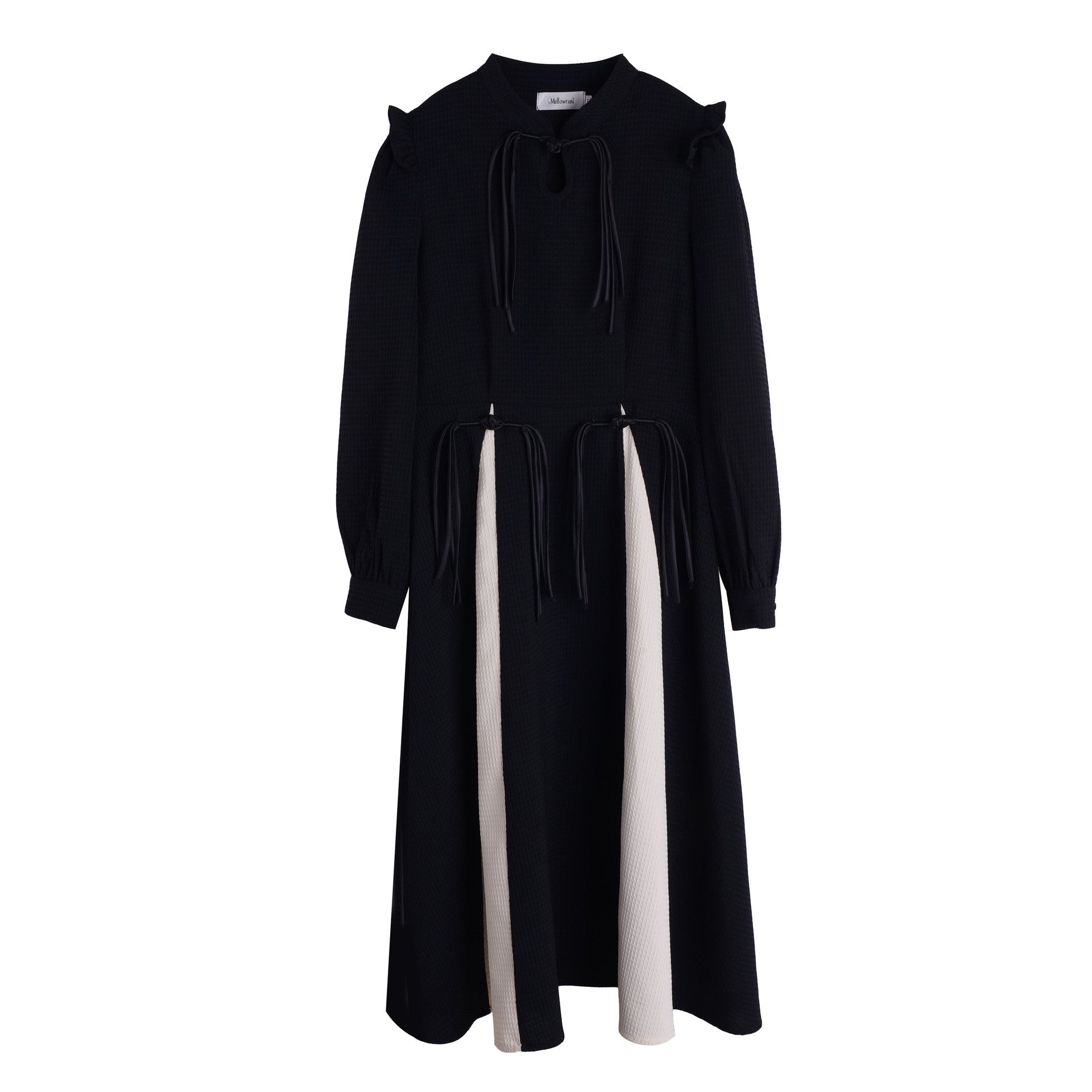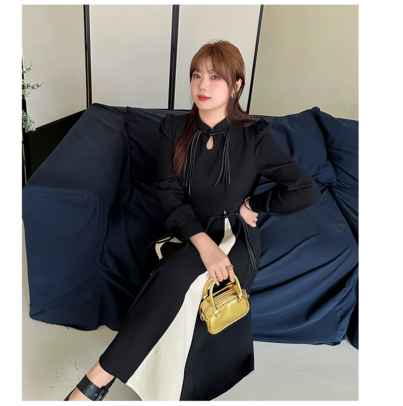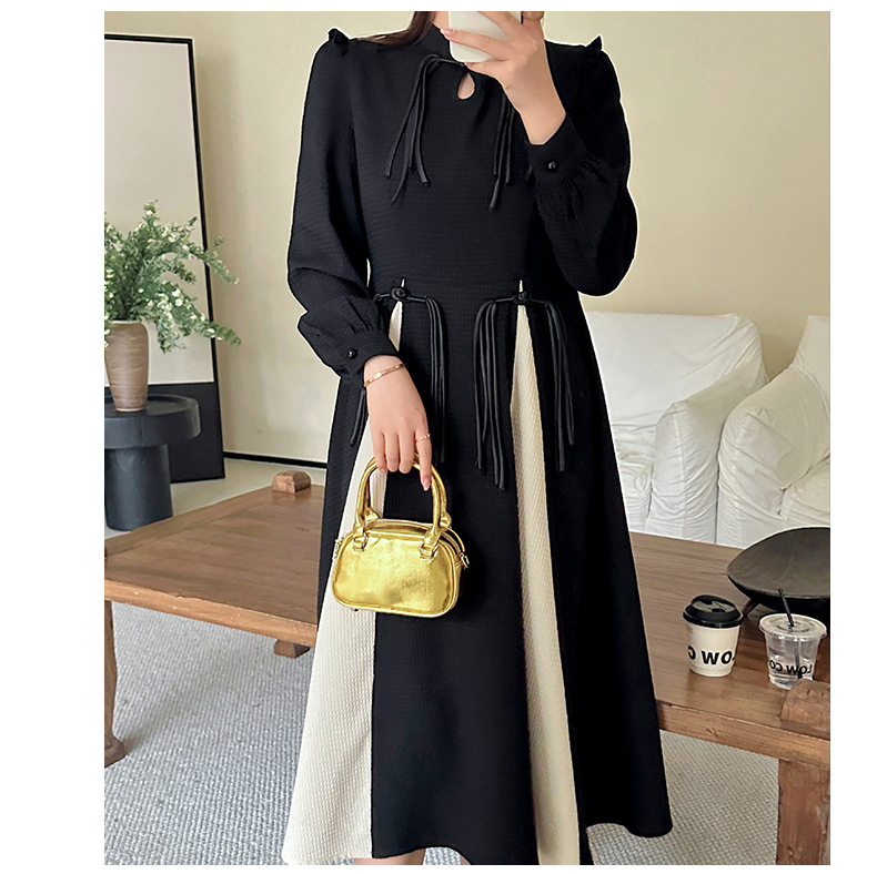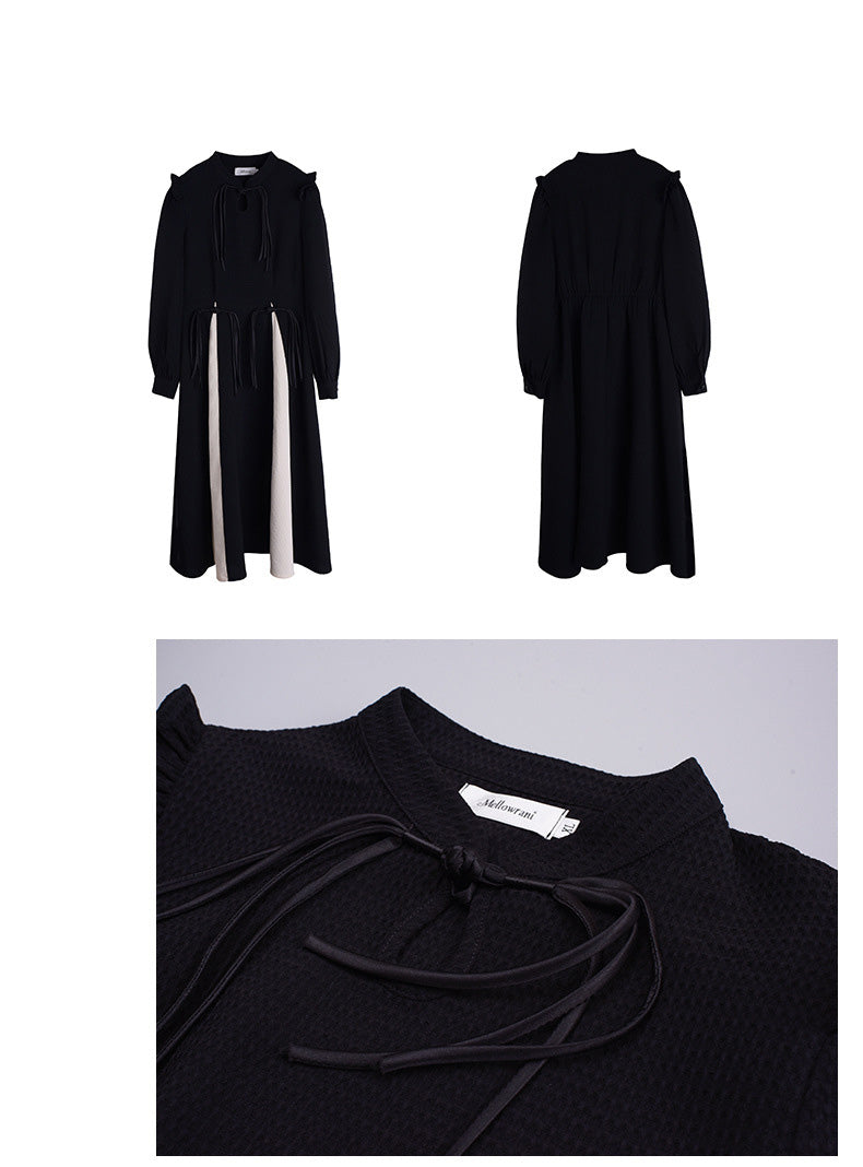 エレガントで雰囲気のあるコントラストカラーのレトロワンピースは、凹凸のある柔らかく通気性が良いワッフル生地で作られています。ネックラインとウエストには目を引くバックルデザインとタッセルが付いています。袖口には控えめながらも印象的なボタンが付いており、バックウエストにはゴムが入っています。シックでモノトーンの洗練されたワンピースです。