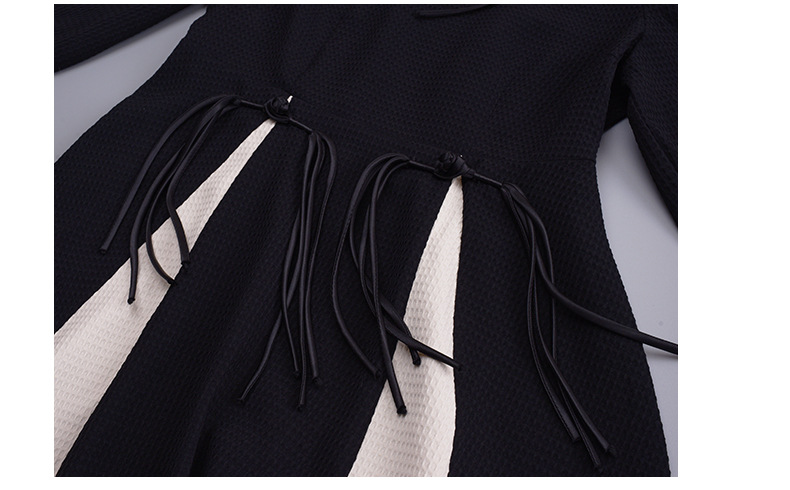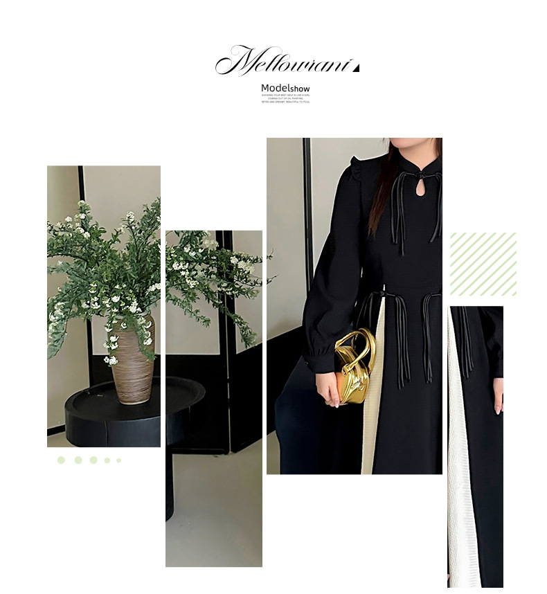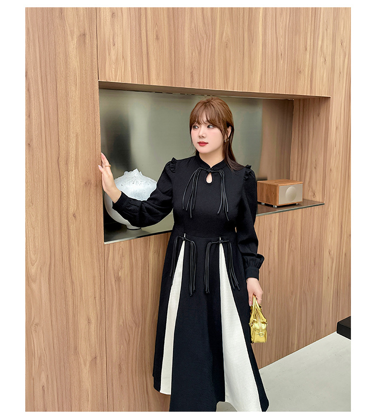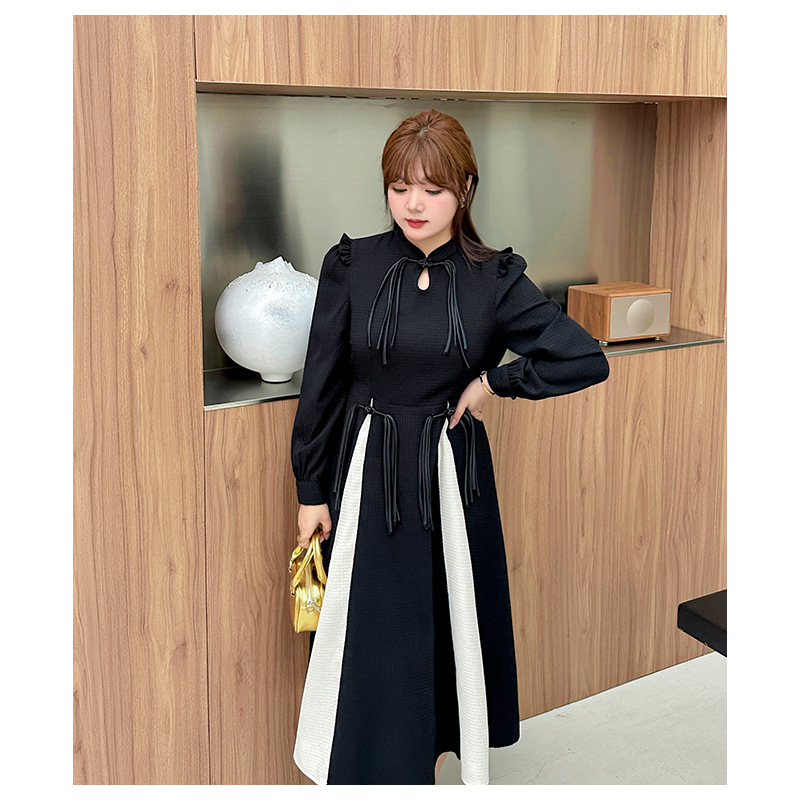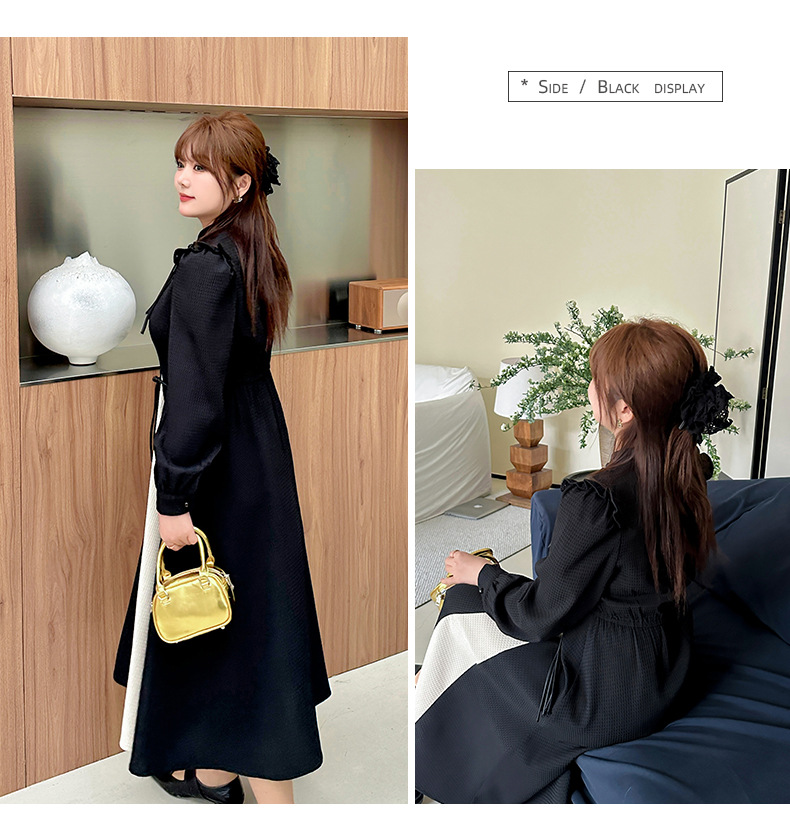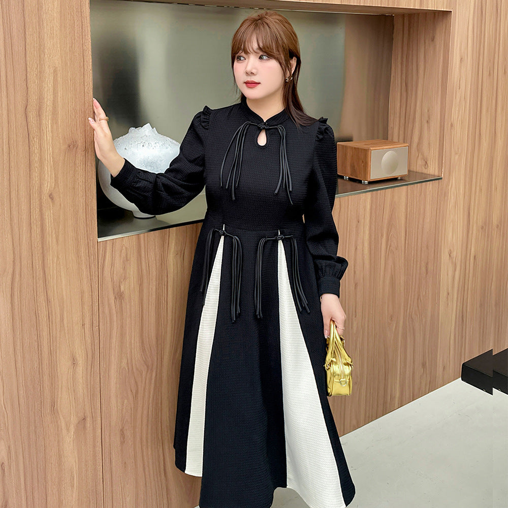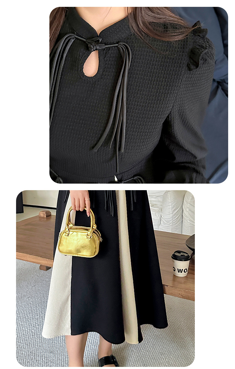 エレガントで雰囲気のあるコントラストカラーのレトロワンピースは、凹凸のある柔らかく通気性が良いワッフル生地で作られています。ネックラインとウエストには目を引くバックルデザインとタッセルが付いています。袖口には控えめながらも印象的なボタンが付いており、バックウエストにはゴムが入っています。シックでモノトーンの洗練されたワンピースです。