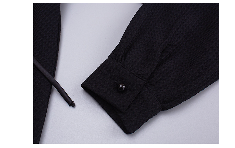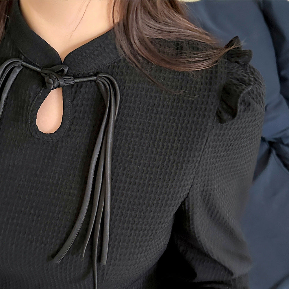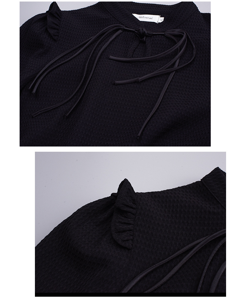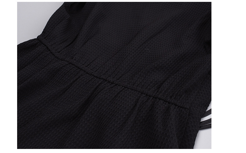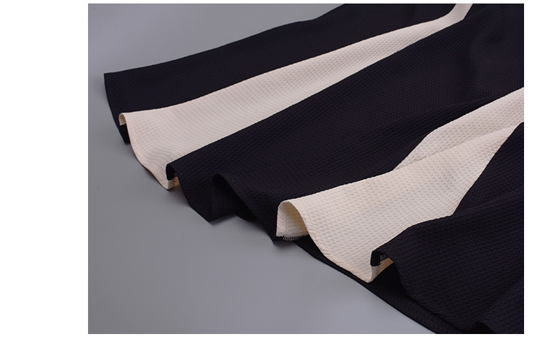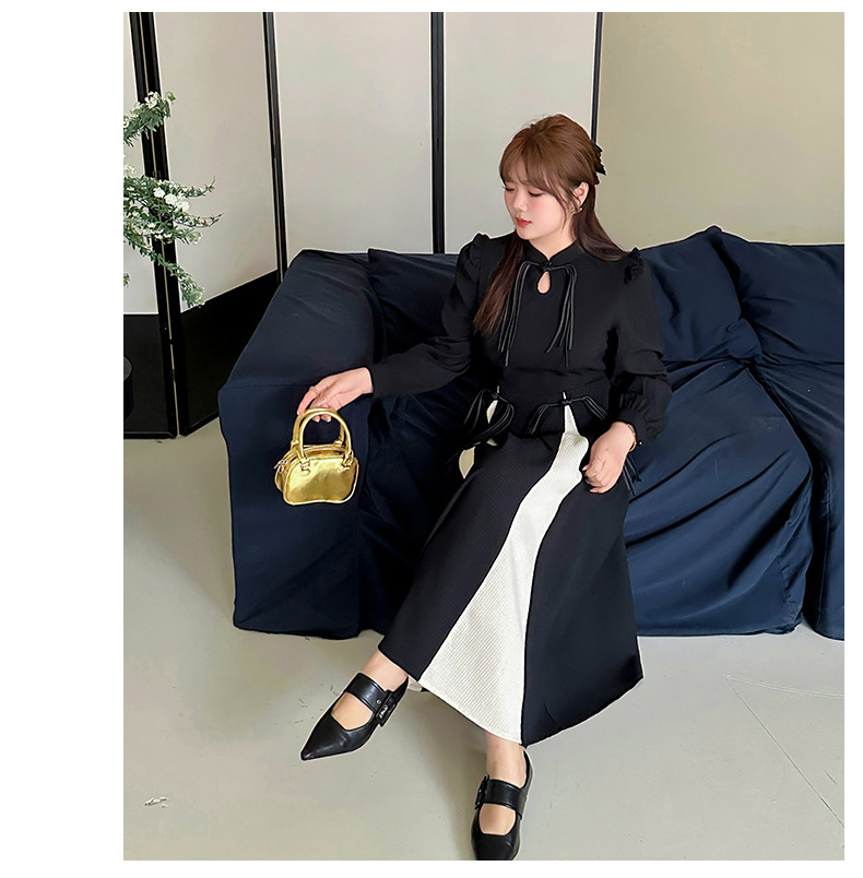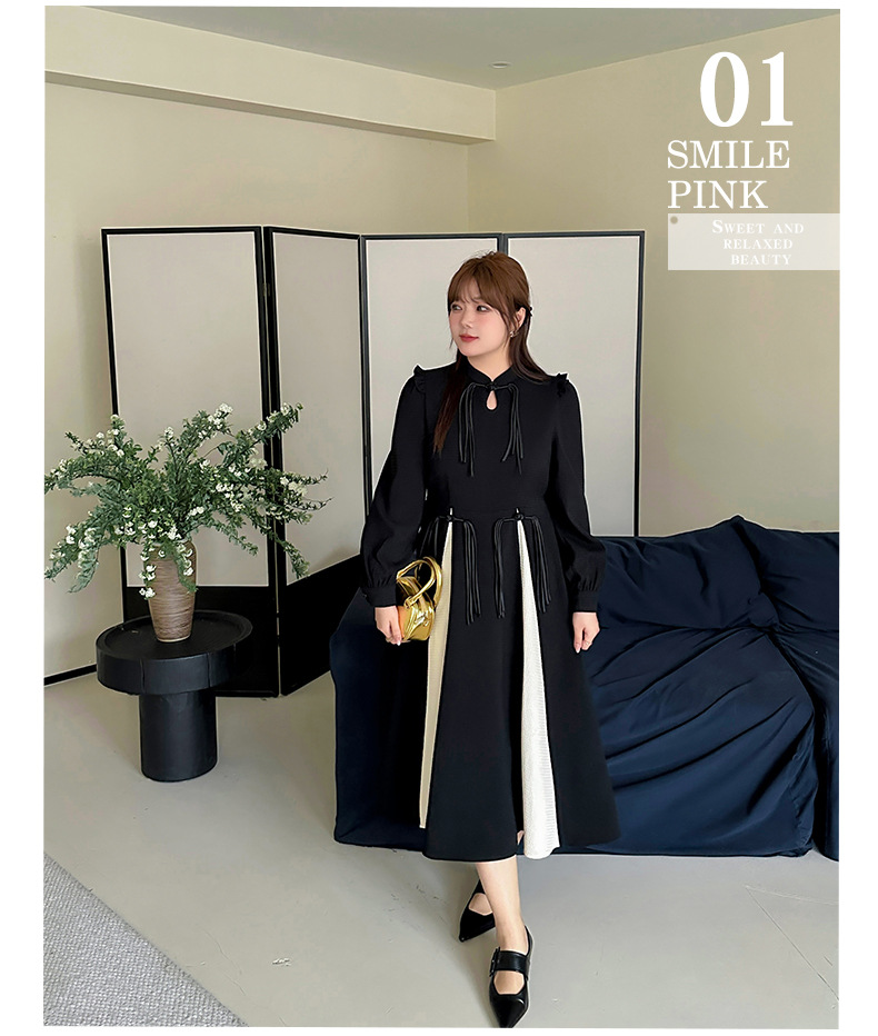 エレガントで雰囲気のあるコントラストカラーのレトロワンピースは、凹凸のある柔らかく通気性が良いワッフル生地で作られています。ネックラインとウエストには目を引くバックルデザインとタッセルが付いています。袖口には控えめながらも印象的なボタンが付いており、バックウエストにはゴムが入っています。シックでモノトーンの洗練されたワンピースです。