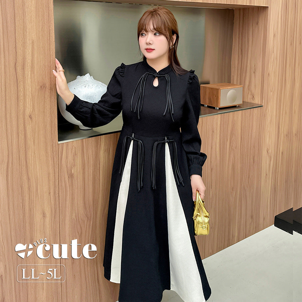 大きいサイズ レディース チャイナ風コントラストカラーワッフル素材ワンピース LL 3L 4L 5L