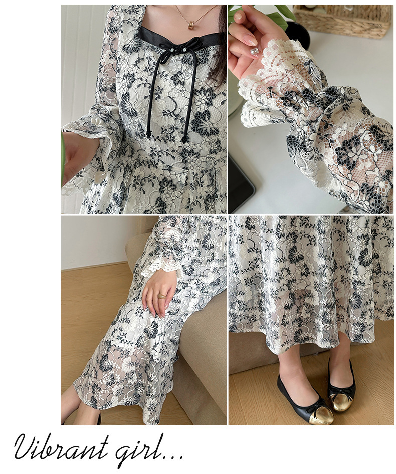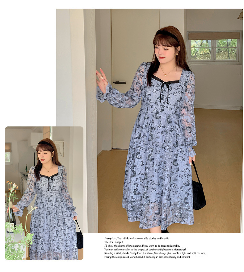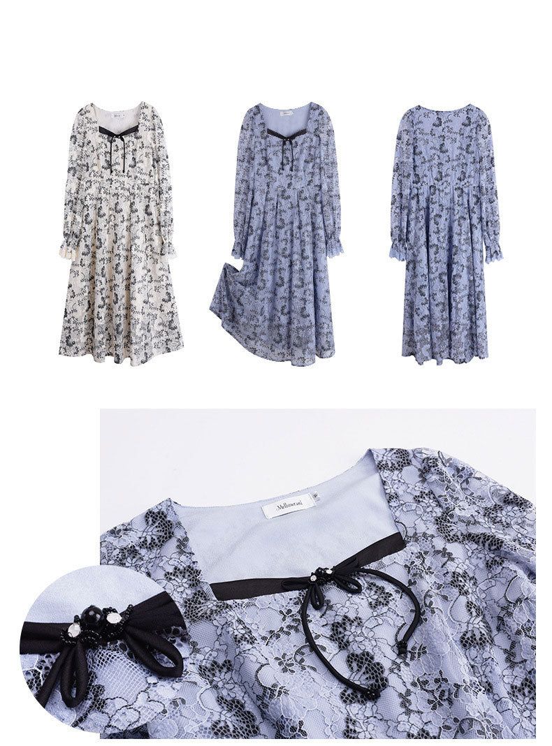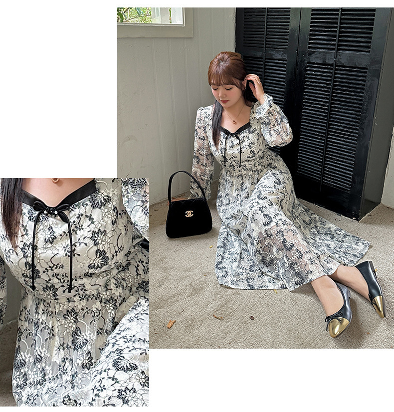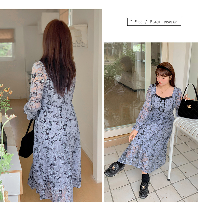 花柄レースが魅力的なレースドレスの登場です。レース生地には裏地が付いいています。フロント胸元には黒いリボンがついており、お姫様のような可愛らしい雰囲気をお楽しみいただけます。レトロでエレガントなパフスリーブは気になる二の腕をカバーします。袖口と後ろウエストには伸縮性のあるゴムバンドを使用。ウエストサイズに関係なく優雅で快適なスタイルをお楽しみ頂けます。