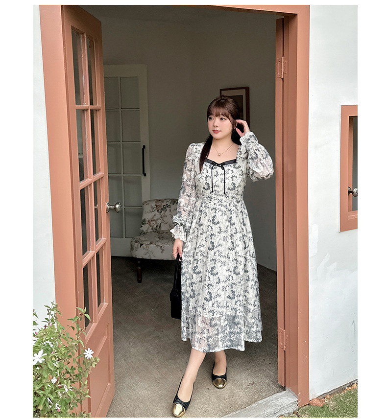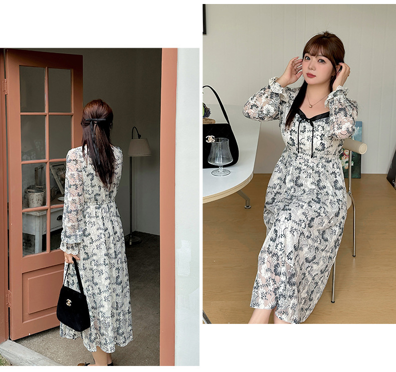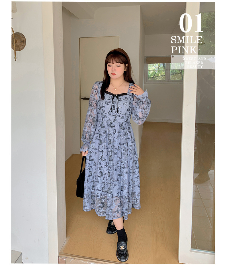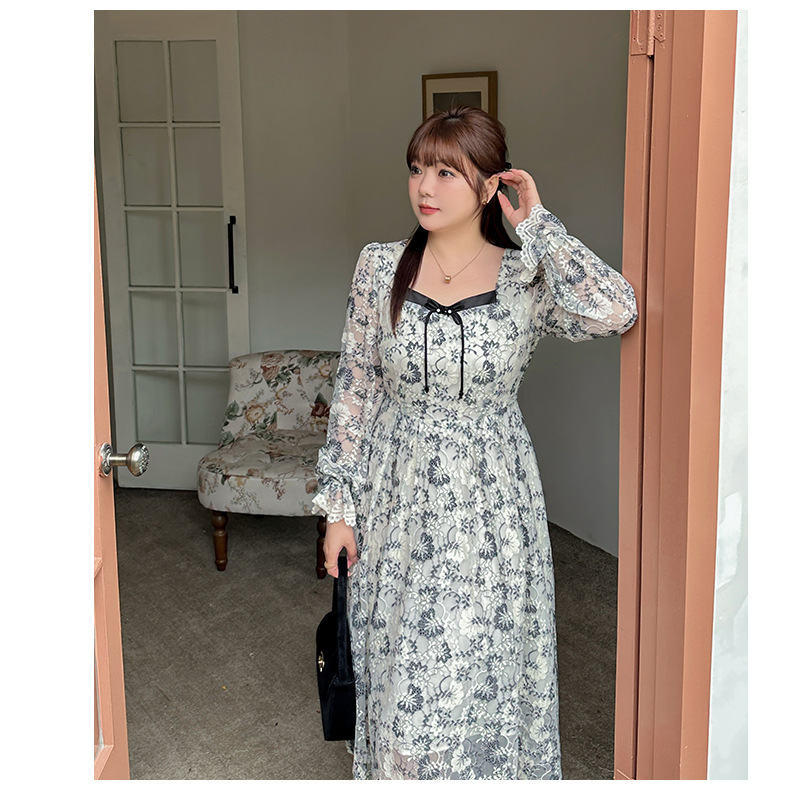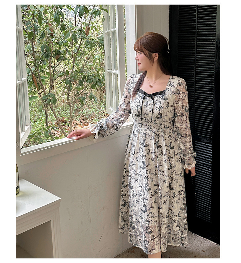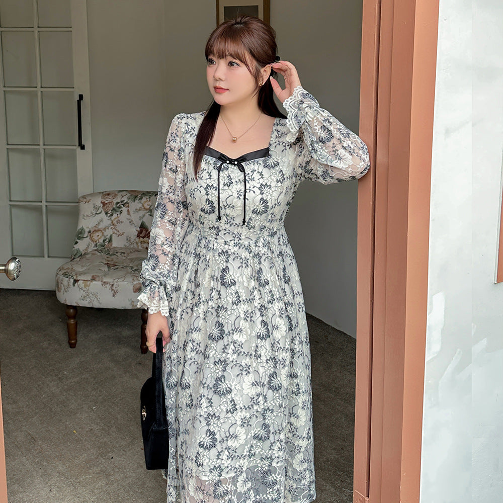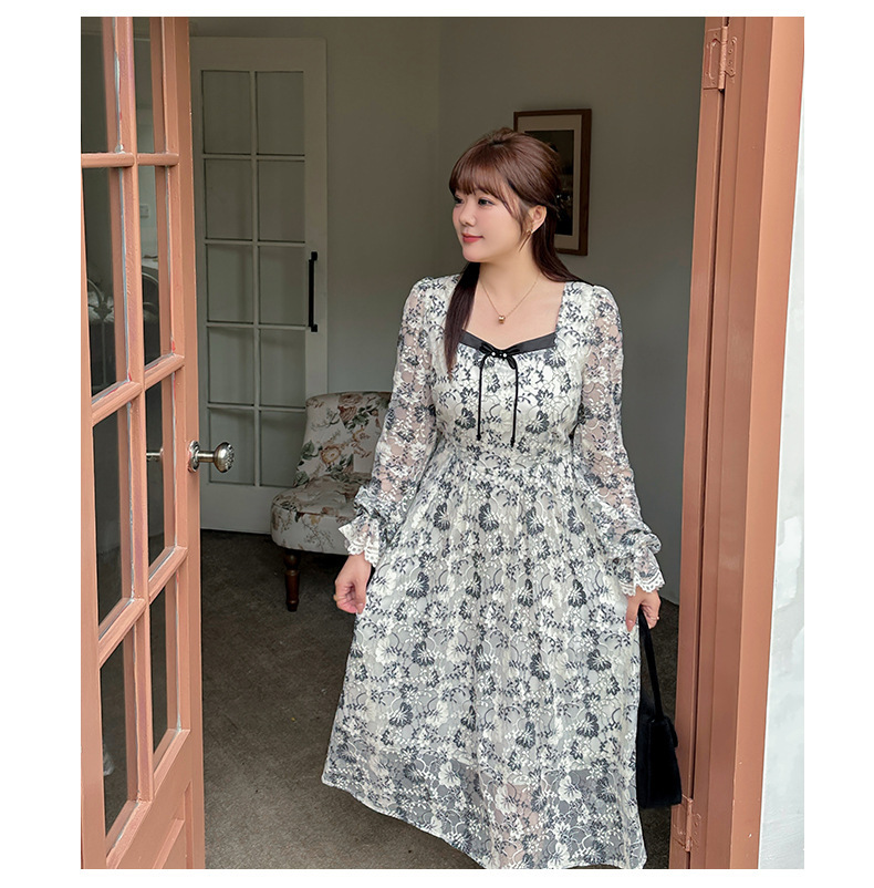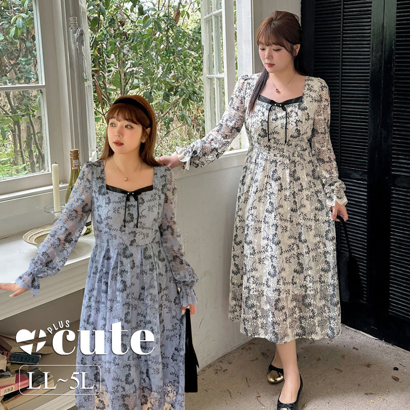 大きいサイズ レディース フロントリボン花柄レースワンピース LL 3L 4L 5L
