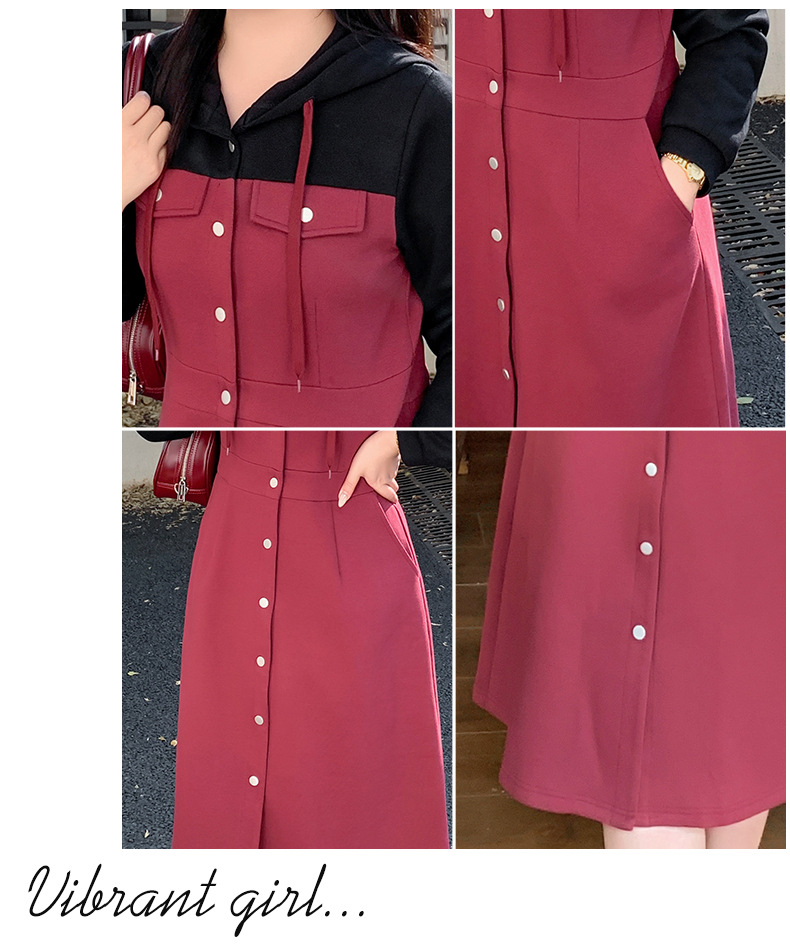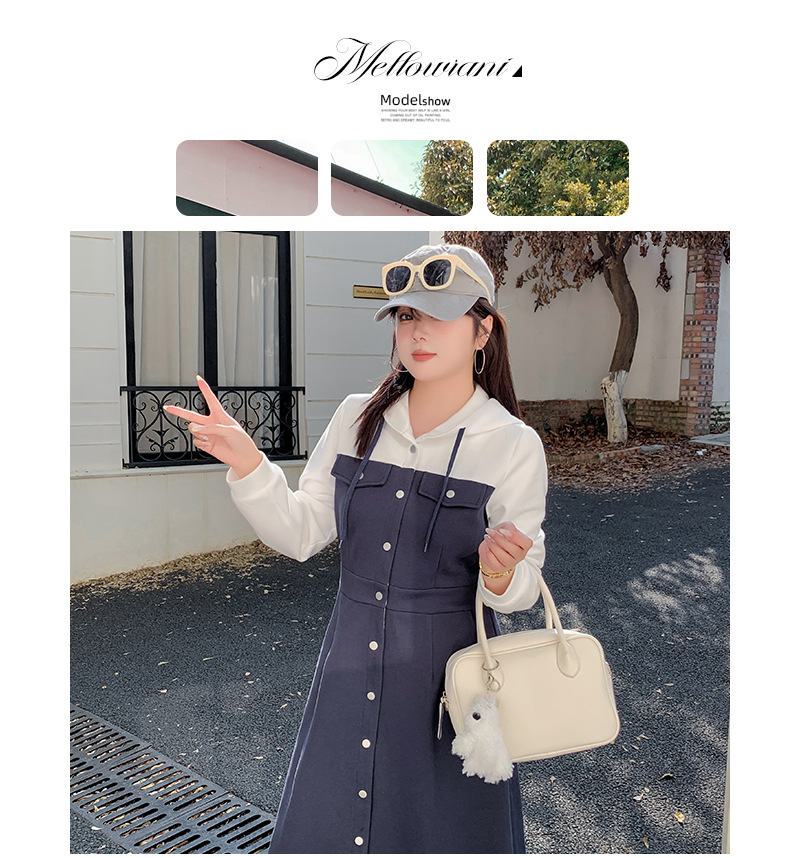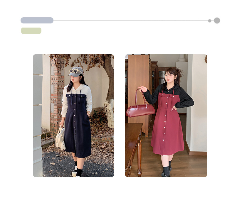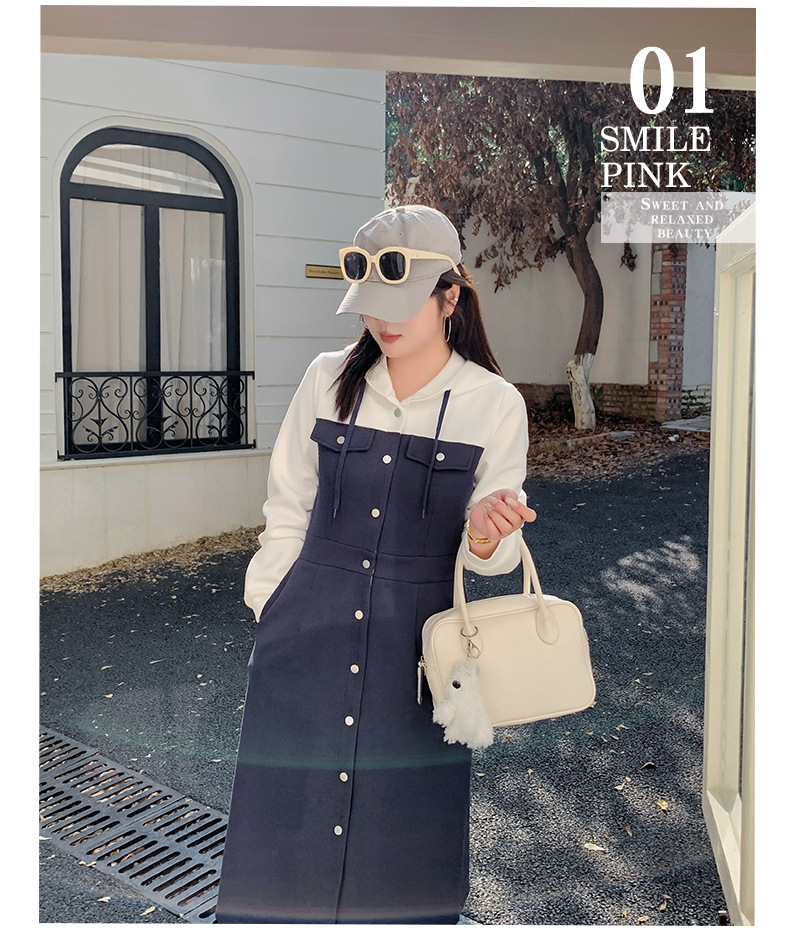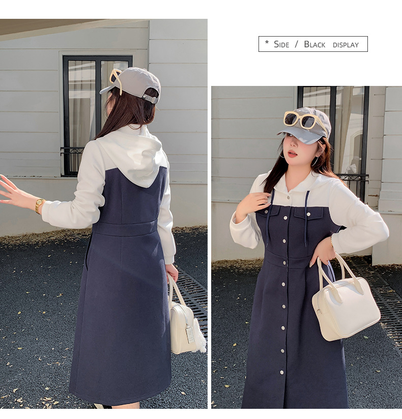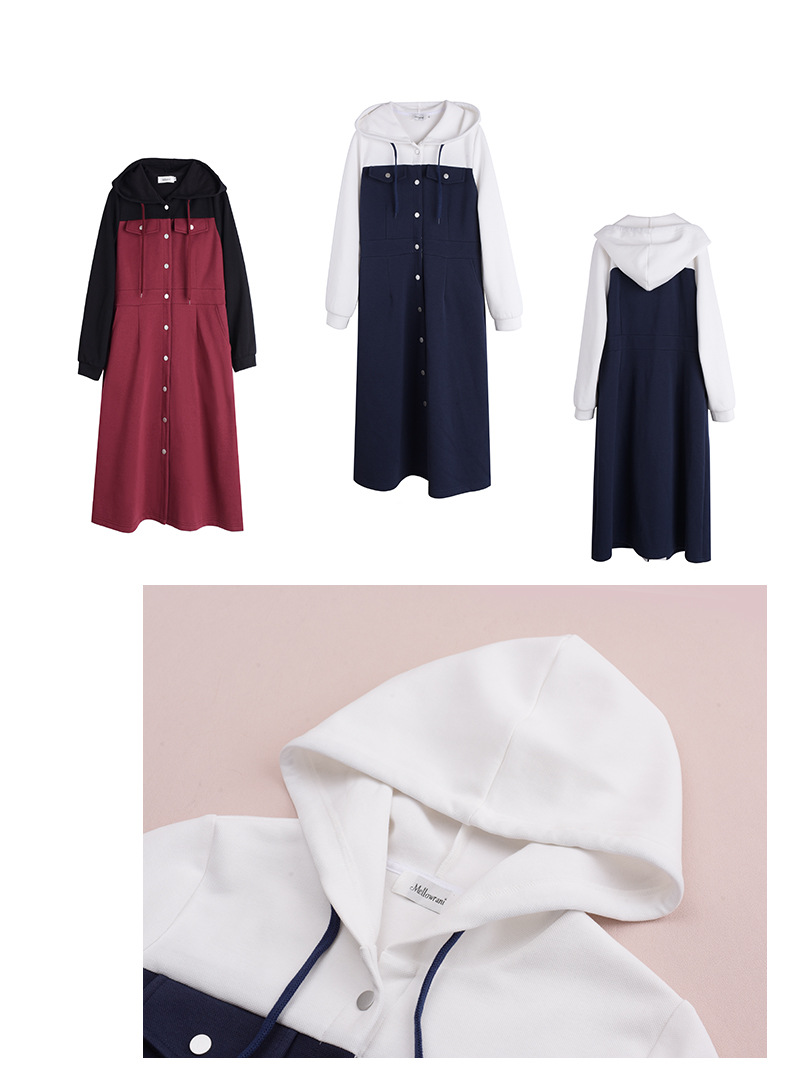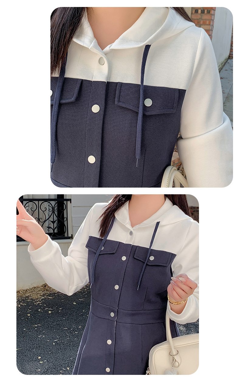 カジュアルバージョンのフェイクツーピースワンピースは、やや伸縮性があり、肌に優しい質感のピケニットコットン生地で作られています。フードの付いたデザインでフロントはスナップボタンが付いています。コントラストのあるカラーのデザインで、若々しく年齢を感じさせないスタイルでカジュアルでナチュラルな着こなしをお楽しみください。