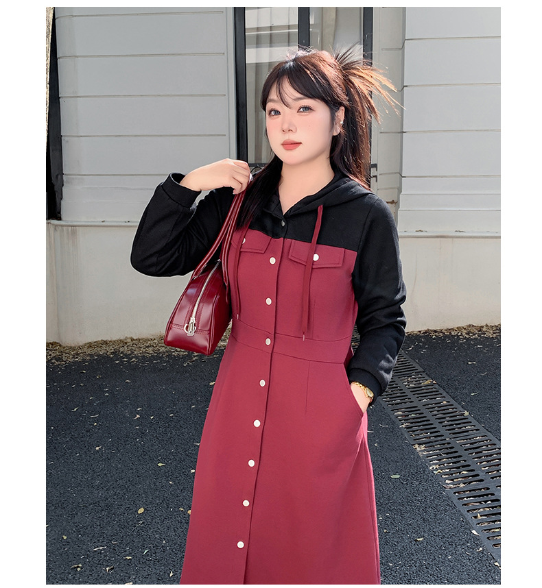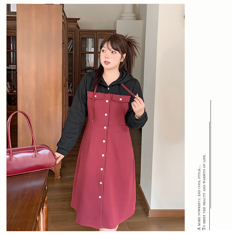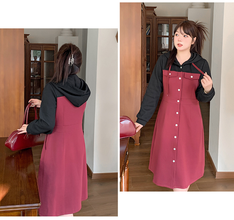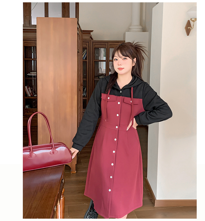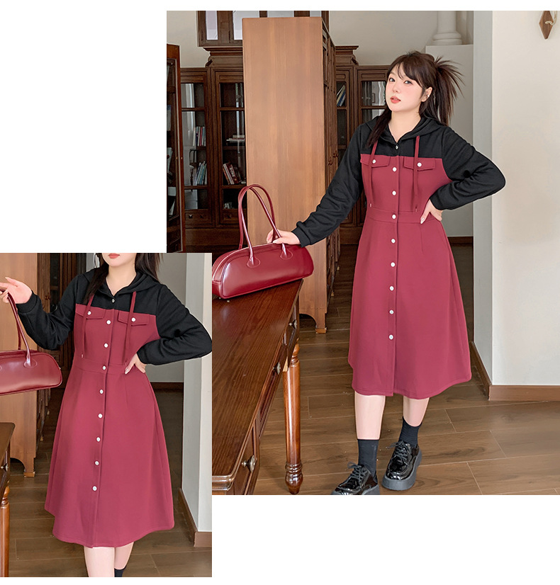 大きいサイズ レディース フード付きフェイクツーピースパッチワークワンピース LL 3L 4L 5L