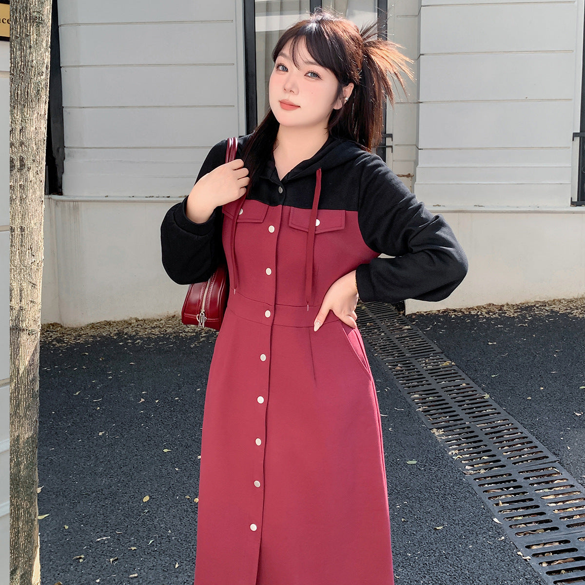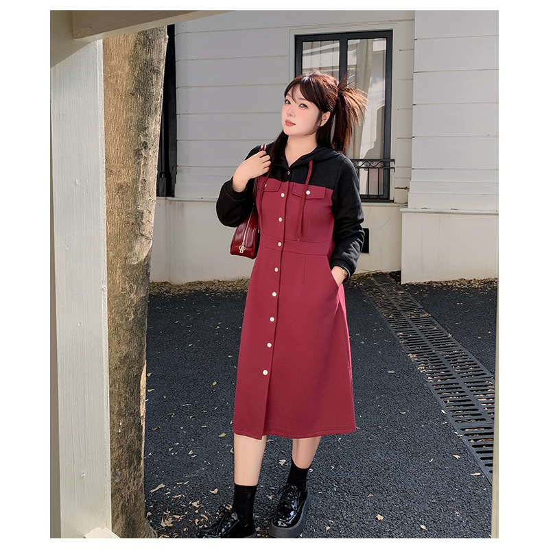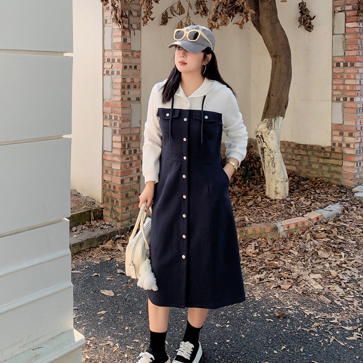 大きいサイズ レディース フード付きフェイクツーピースパッチワークワンピース LL 3L 4L 5L