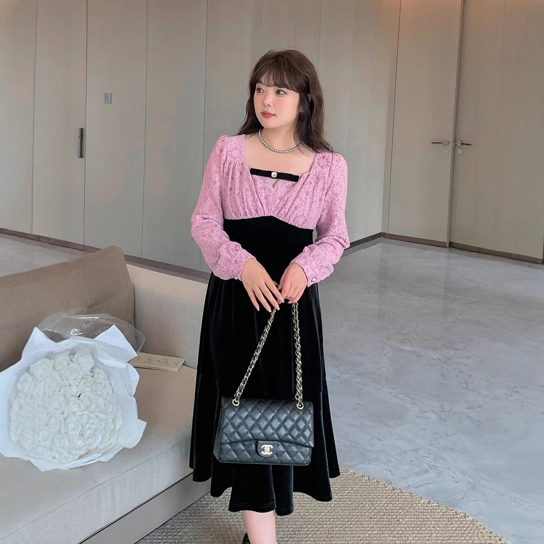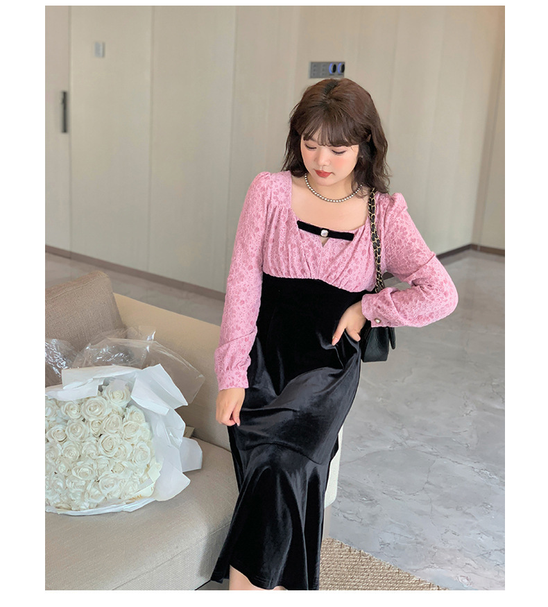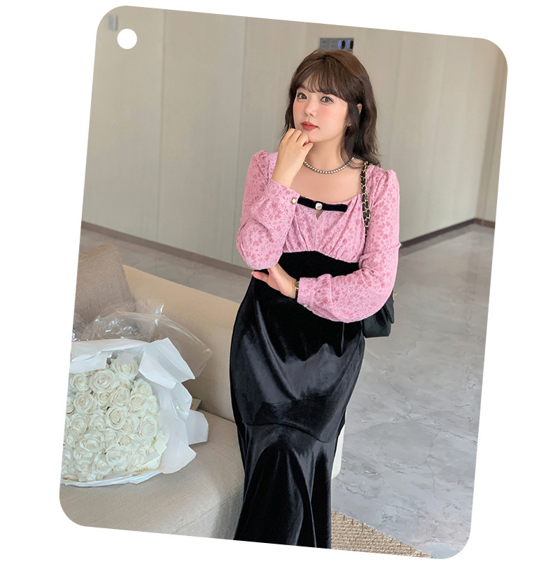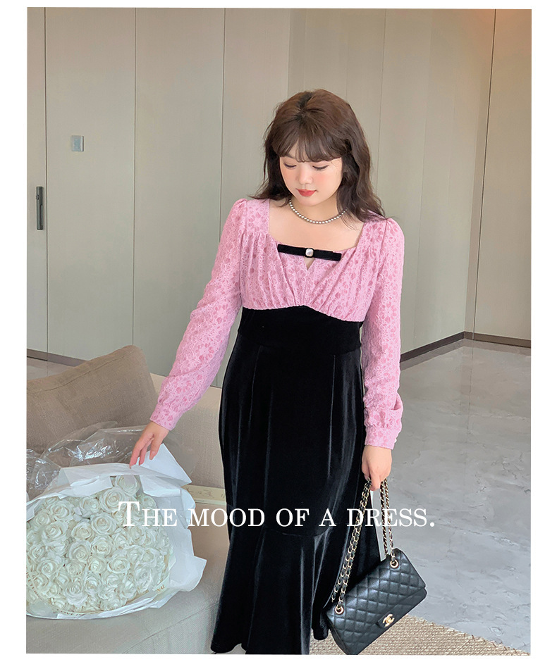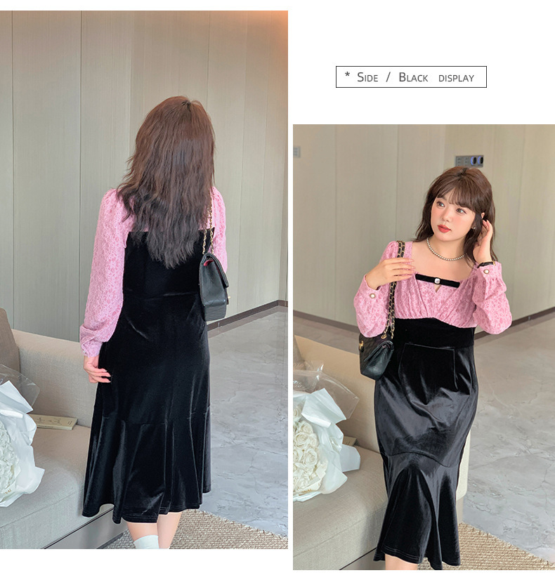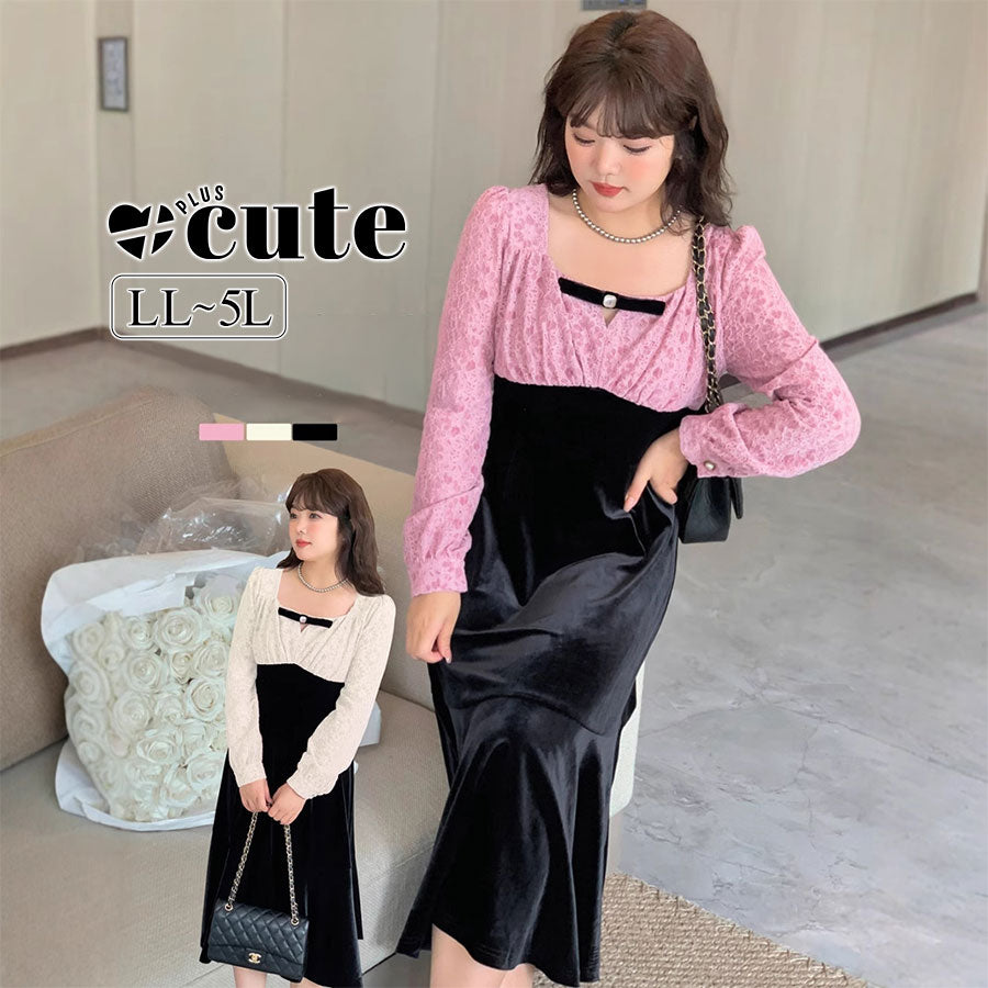 大きいサイズ レディース ヴィンテージ調レース切り替えベロアワンピース LL 3L 4L 5L