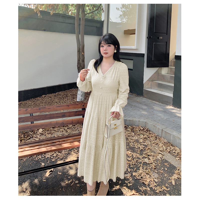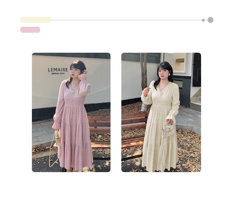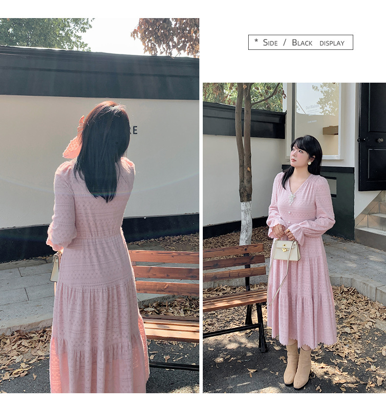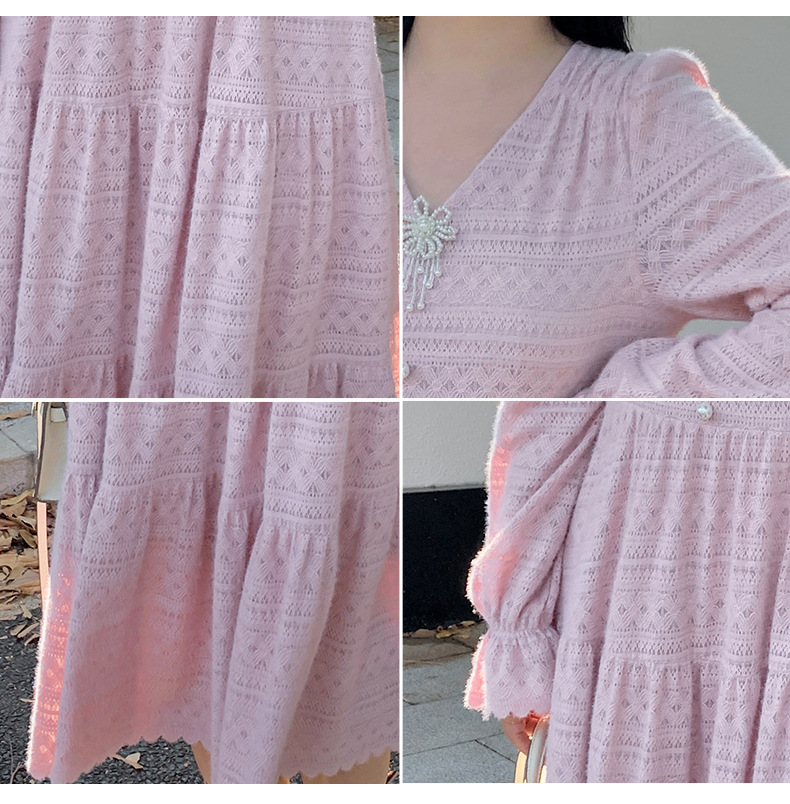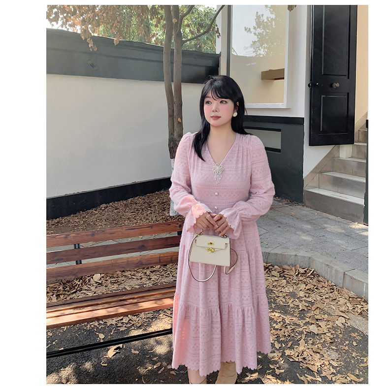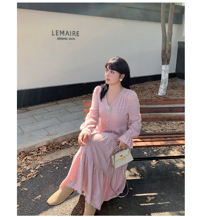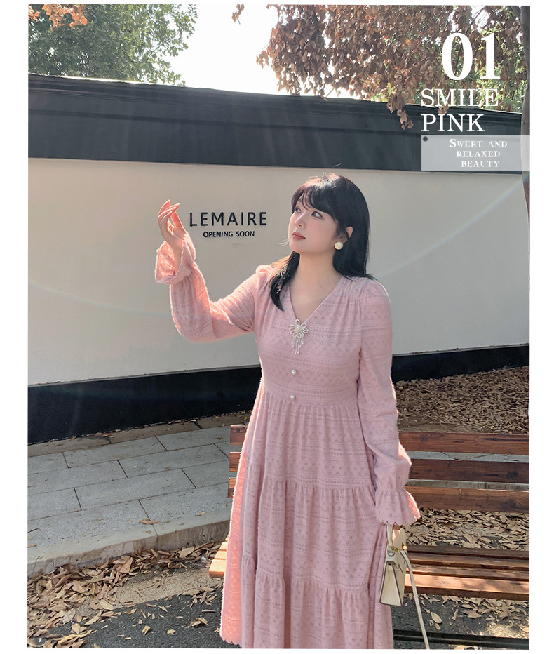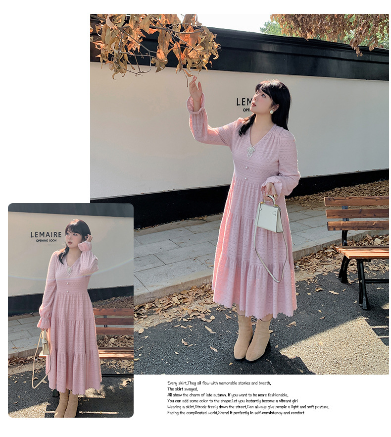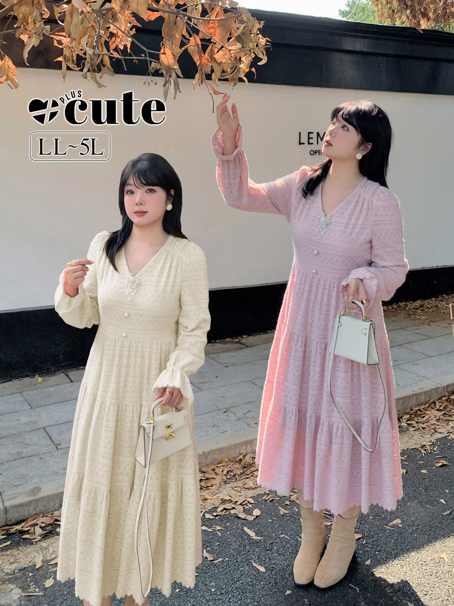 大きいサイズ レディース ビーズジュエリー付きVネックレース裏起毛フレンチワンピース LL 3L 4L 5L