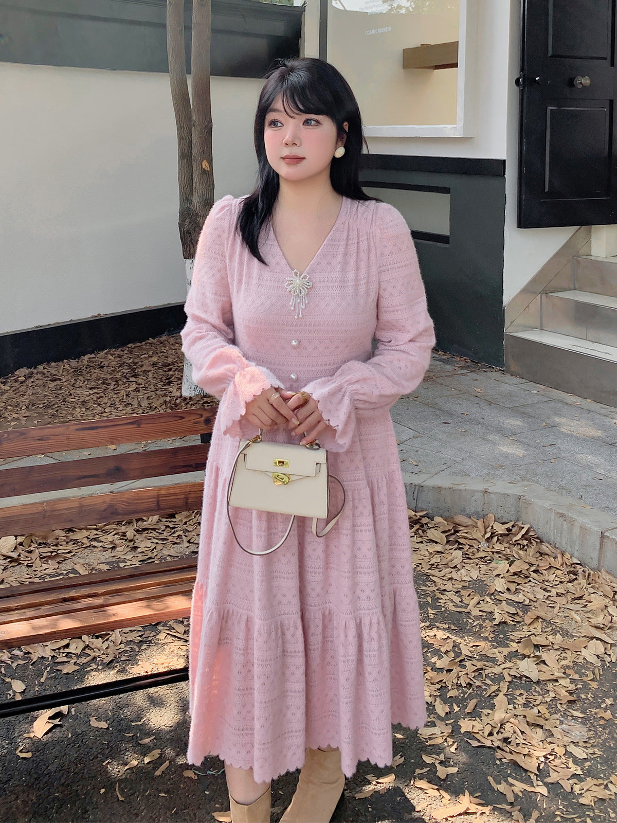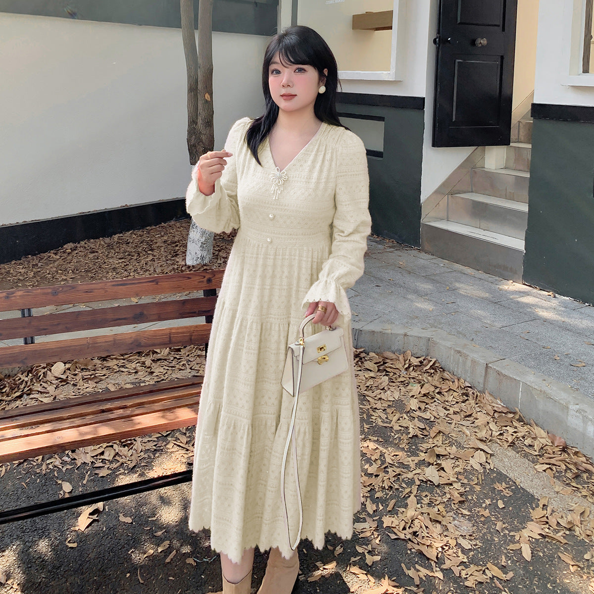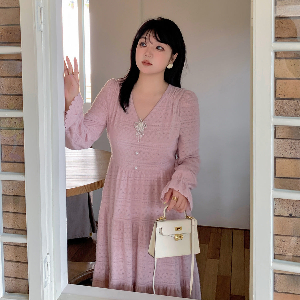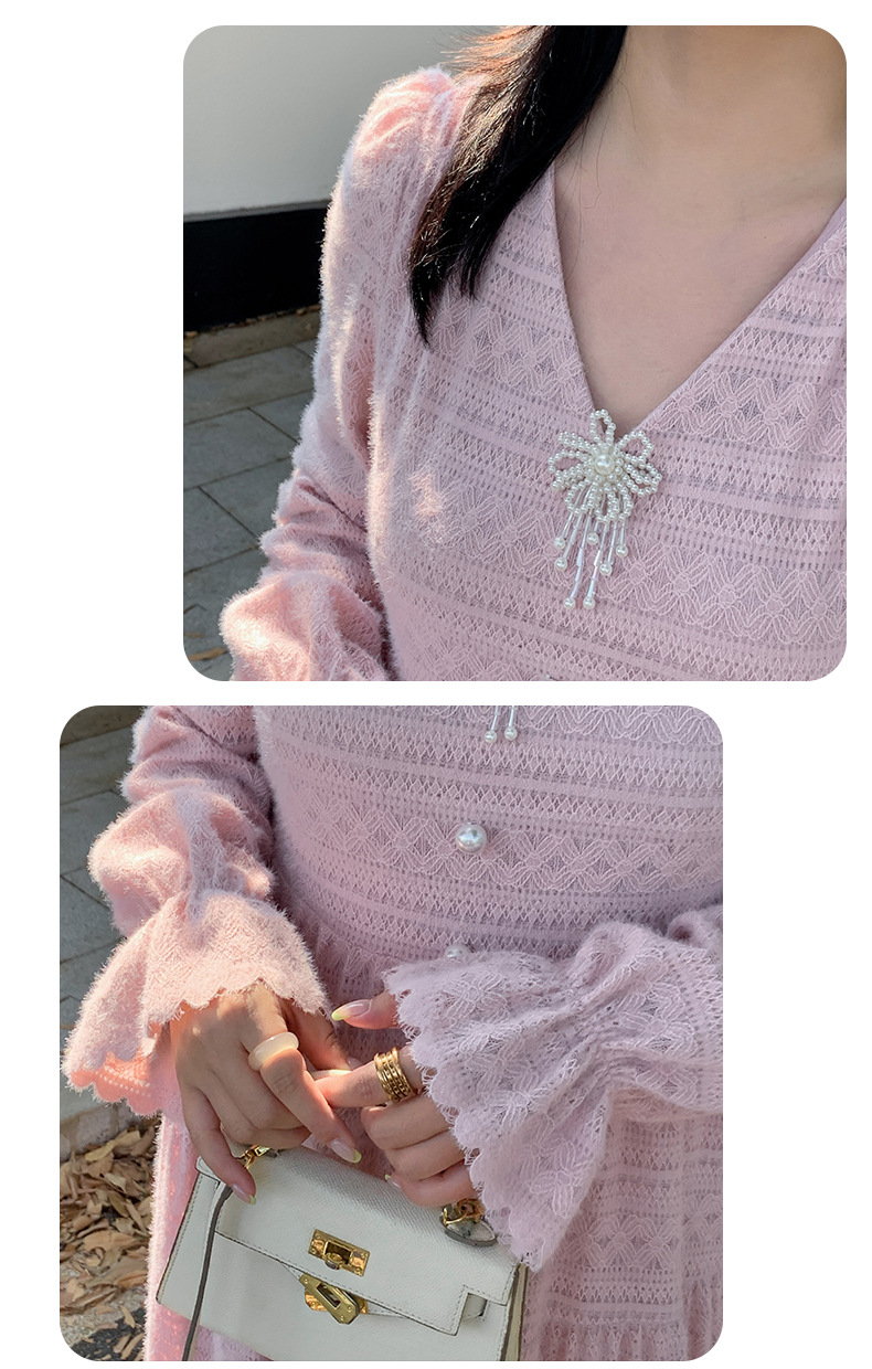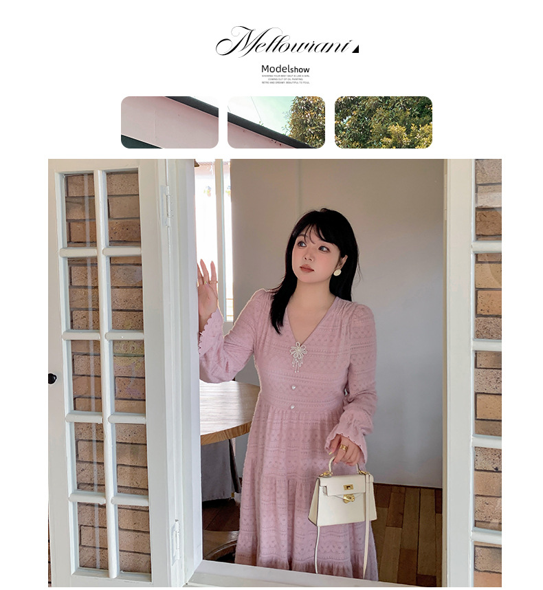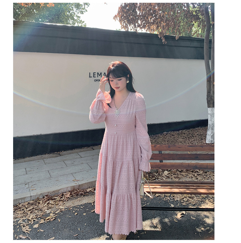 大きいサイズ レディース ビーズジュエリー付きVネックレース裏起毛フレンチワンピース LL 3L 4L 5L