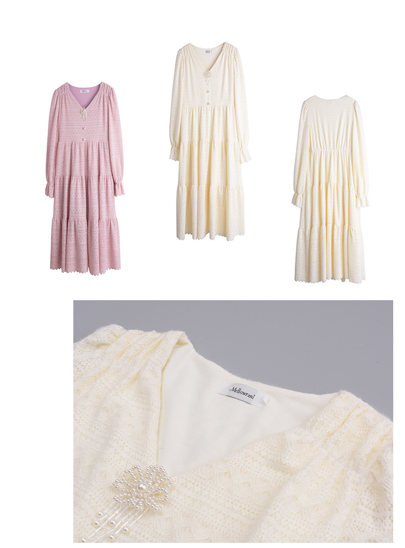 秋、冬、春先に最適な裏起毛レースワンピースです。外側は肌触りの良いフェザーガーゼレース、裏地はミルクシルクの起毛生地を使用しています。暖かくて柔らかく肌触りがいいです。Vネックでフロントとセンターのビーズジュエリーとボタン、バックウエストは絞られスカートはレイヤードされたデザインです。優しくエレガントな装いを是非お試しください。